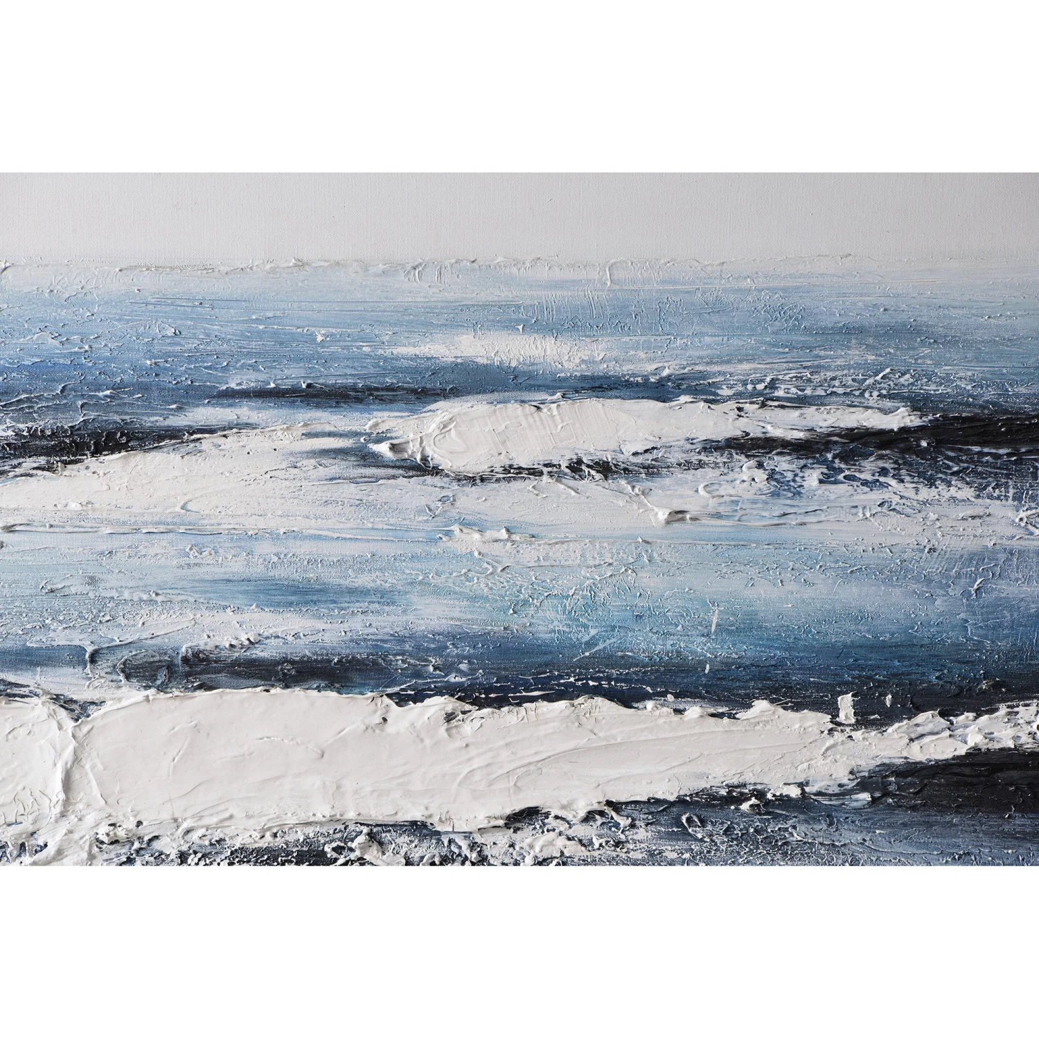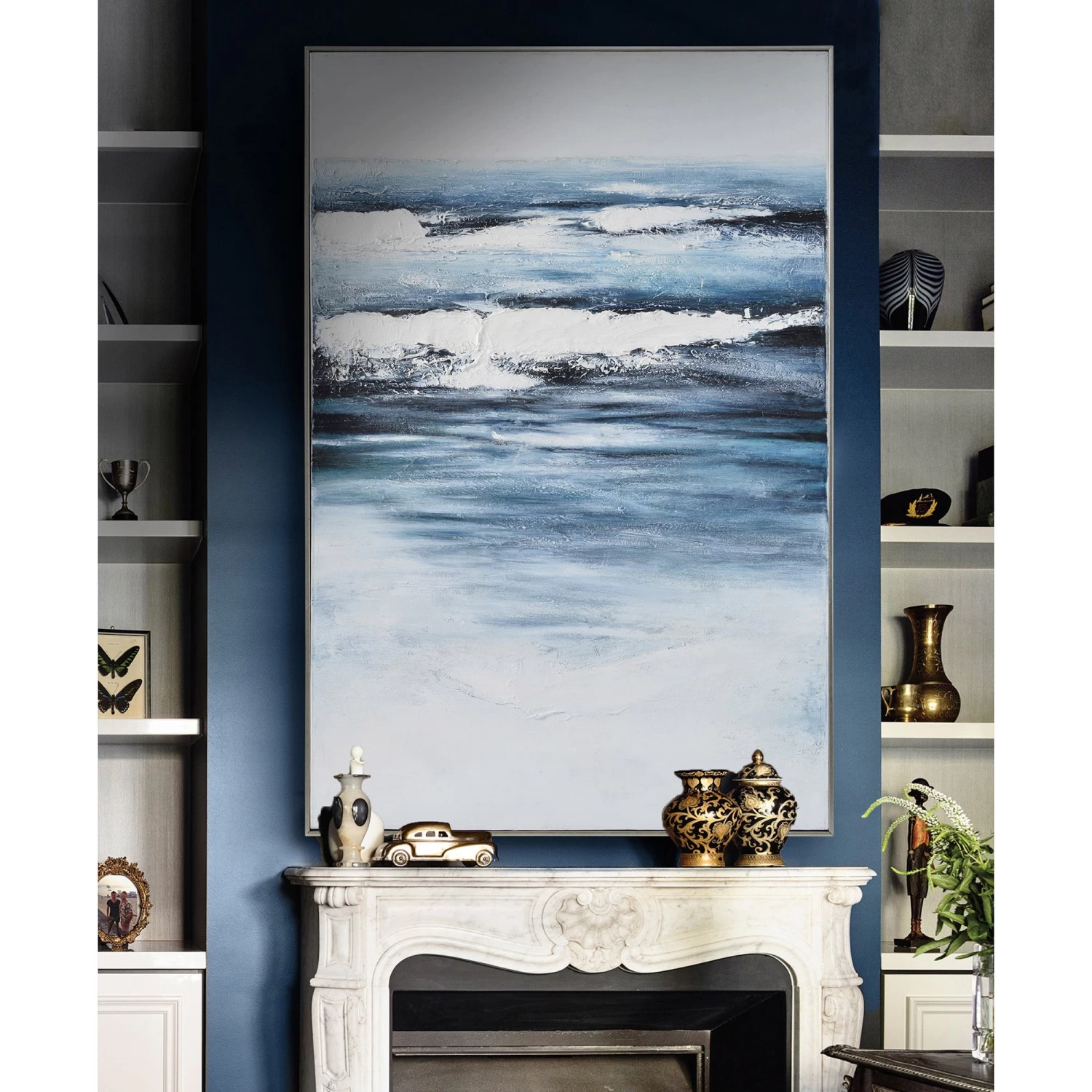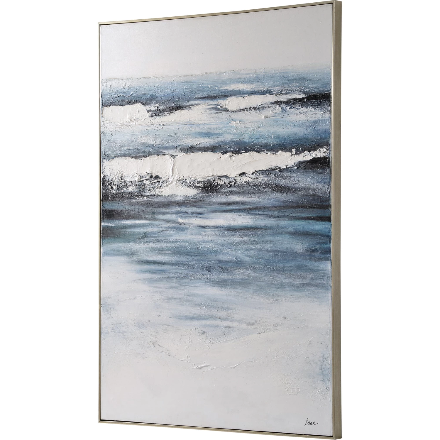 The Adin Canvas Painting features an alluring blue design bordered by a silver frame.Â