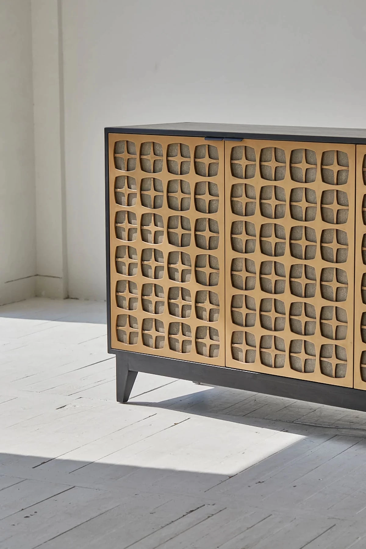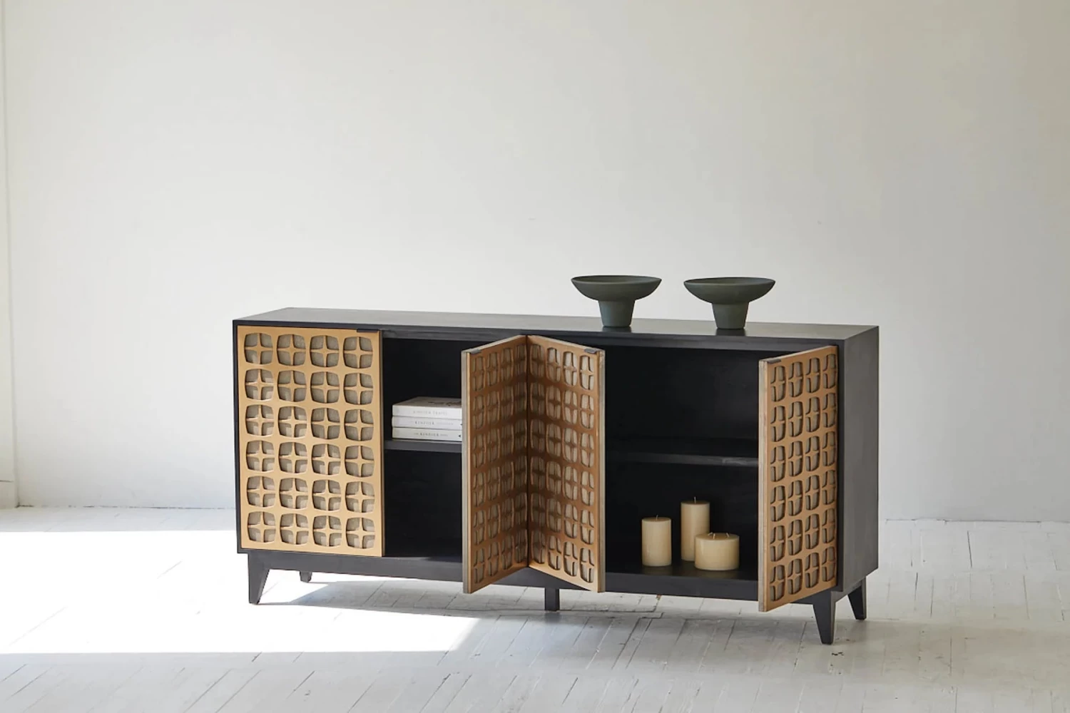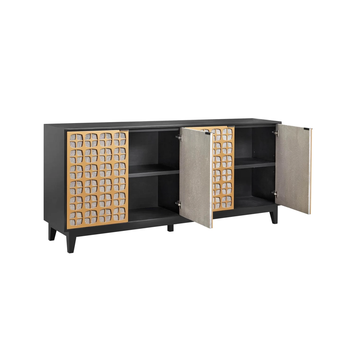 Be delighted with the Alessio sideboard, part of our Renaissance collection. This luxurious piece offers generous storage space behind its two elegant cabinet doors, crafted with Oak Veneer, metal, and MDF and finished in black ebony and antique brass. A timeless blend of style and practicality.
