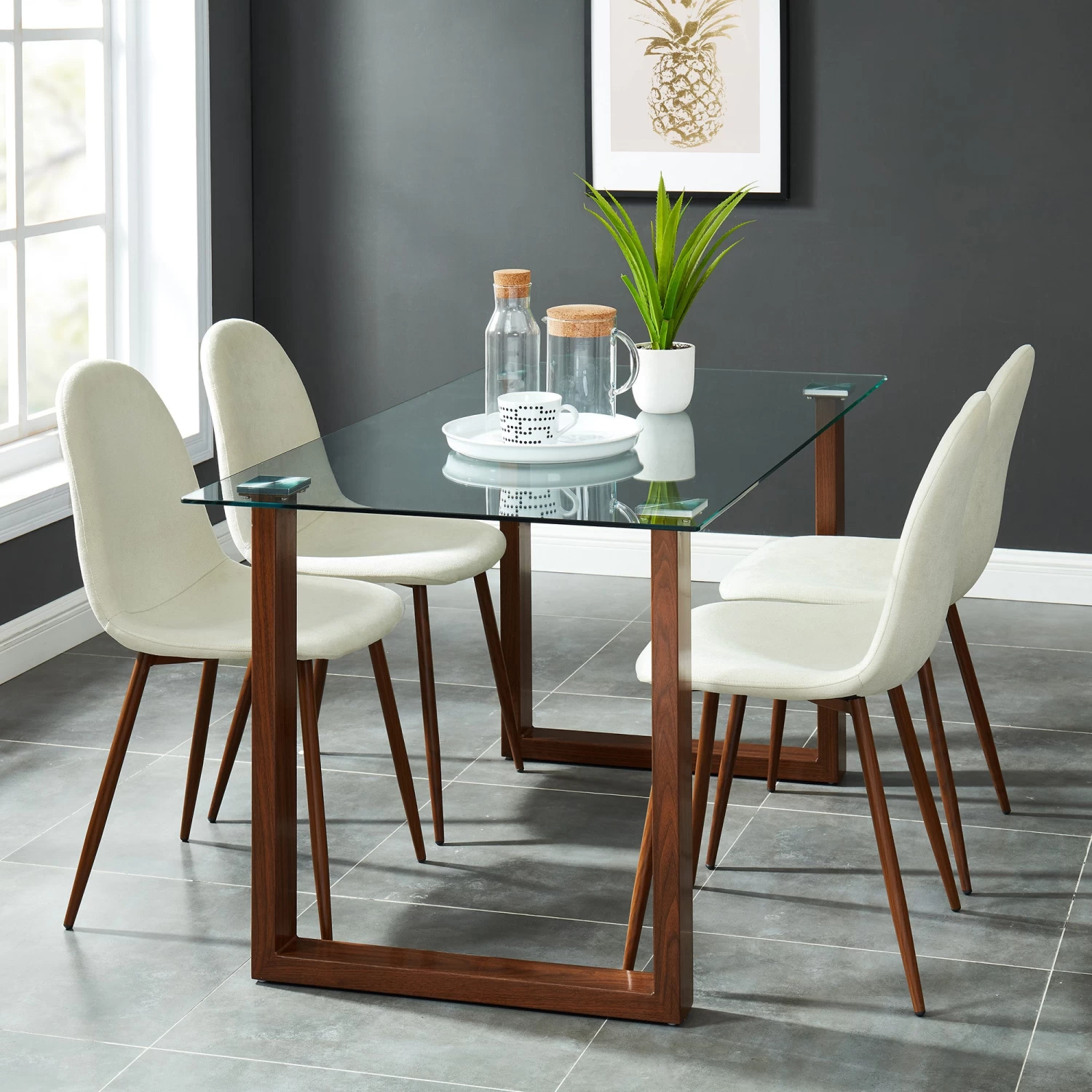 The clean-line design and clear tempered glass gives this table a modern, minimalist look, while the walnut finish lends a slight mid-century flare. Large enough for four chairs to fit comfortably, yet small enough to work in the tightest spaces. Minimal assembly is required. This trendy chair showcases a sleek and coherent design. Composed of a comfortable, curved wood seat frame with foam covered in fabric upholstery this chair balances simplicity with style. Made with metal legs in a walnut finish through the process of heat transferring, this chair will boast sturdiness along with the sleek look and comfort.