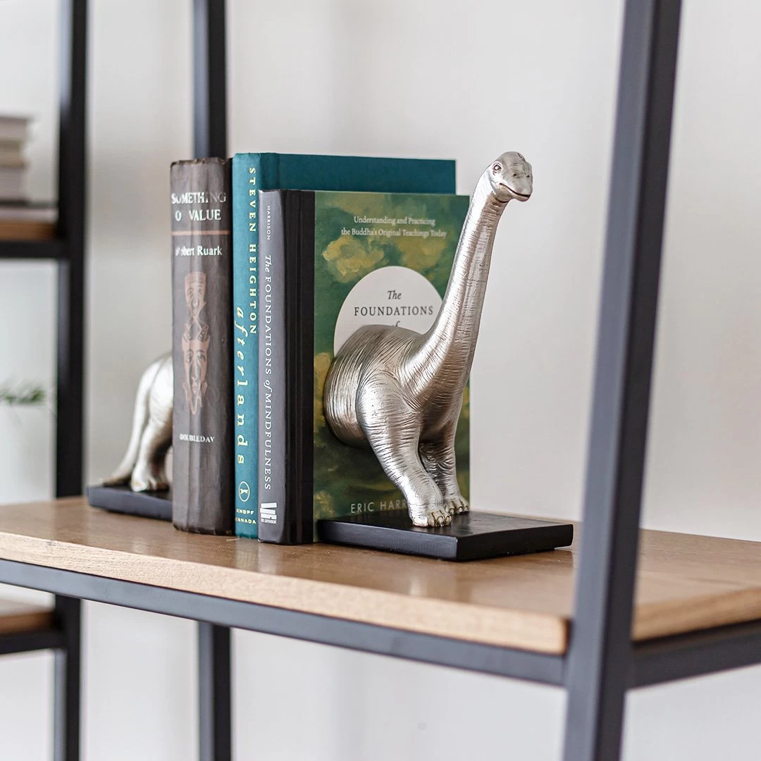But in all seriousness, our Lil Foot Bookends bring whimsical fun to the home. Each dinosaur bookend is made from polyresin with a matte silver finish and looks amazing propping up your treasured tales.