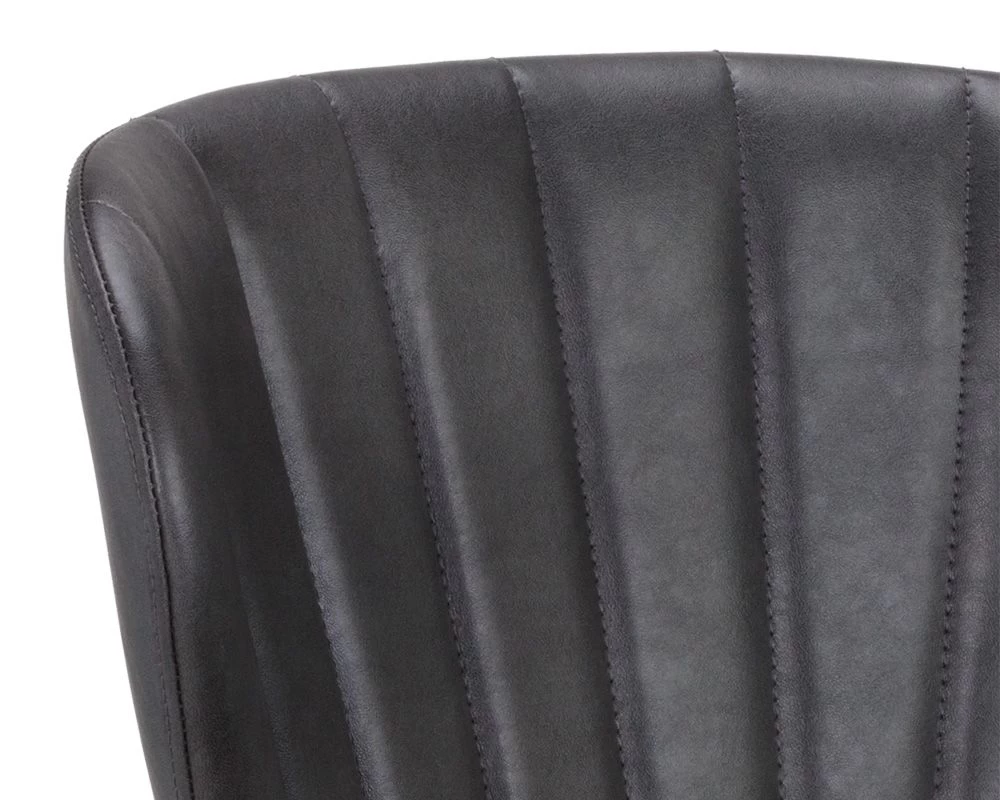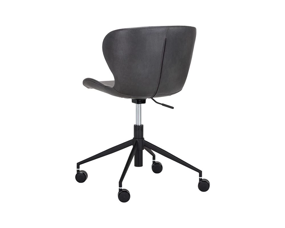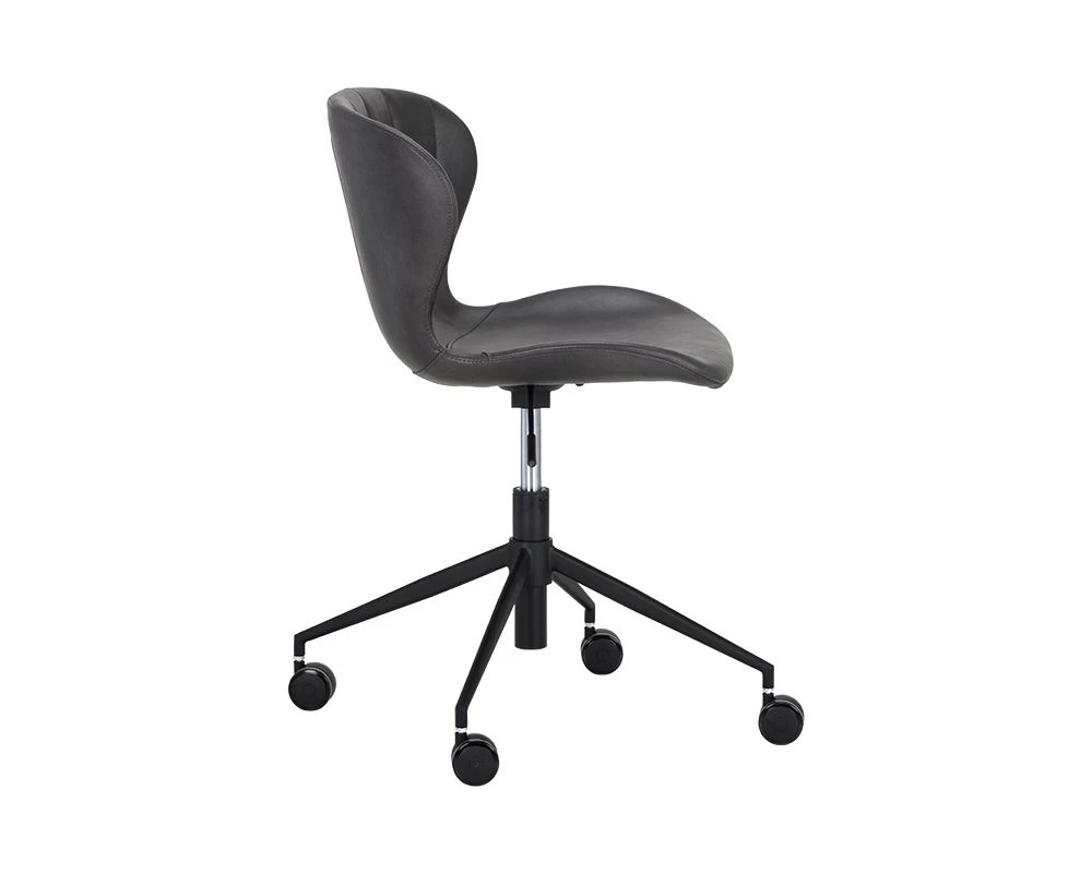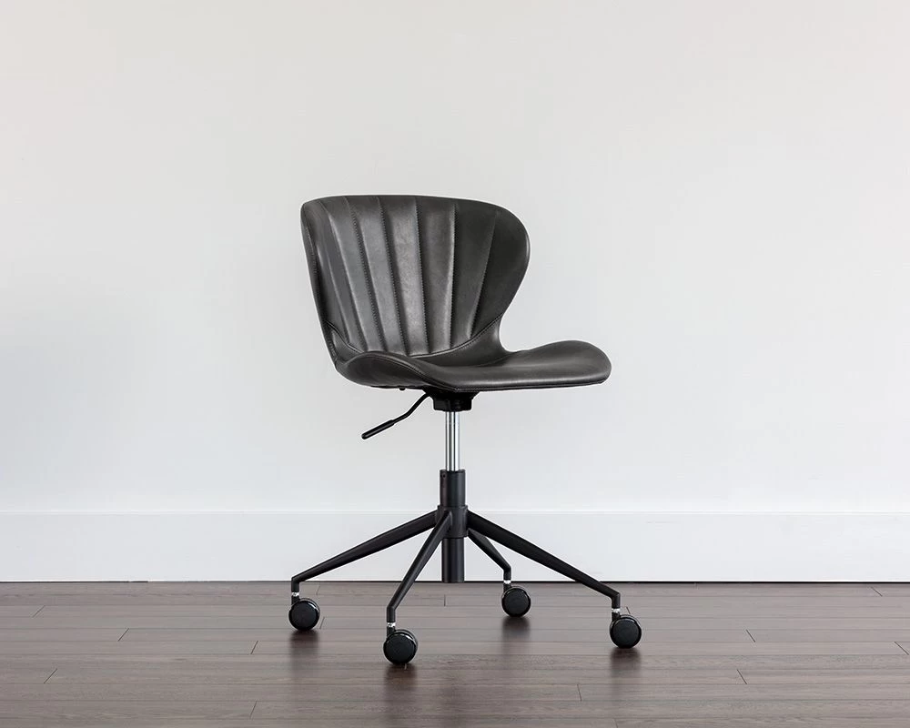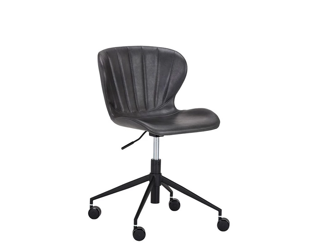 This swivel office chair is designed with charming yet sleek elements to offer an intriguing look for any office space. Features a clamshell seatback with channel tufting. Stocked in bravo cognac and portabella faux leather with black powder coated iron legs. Castors allow for easy mobility.