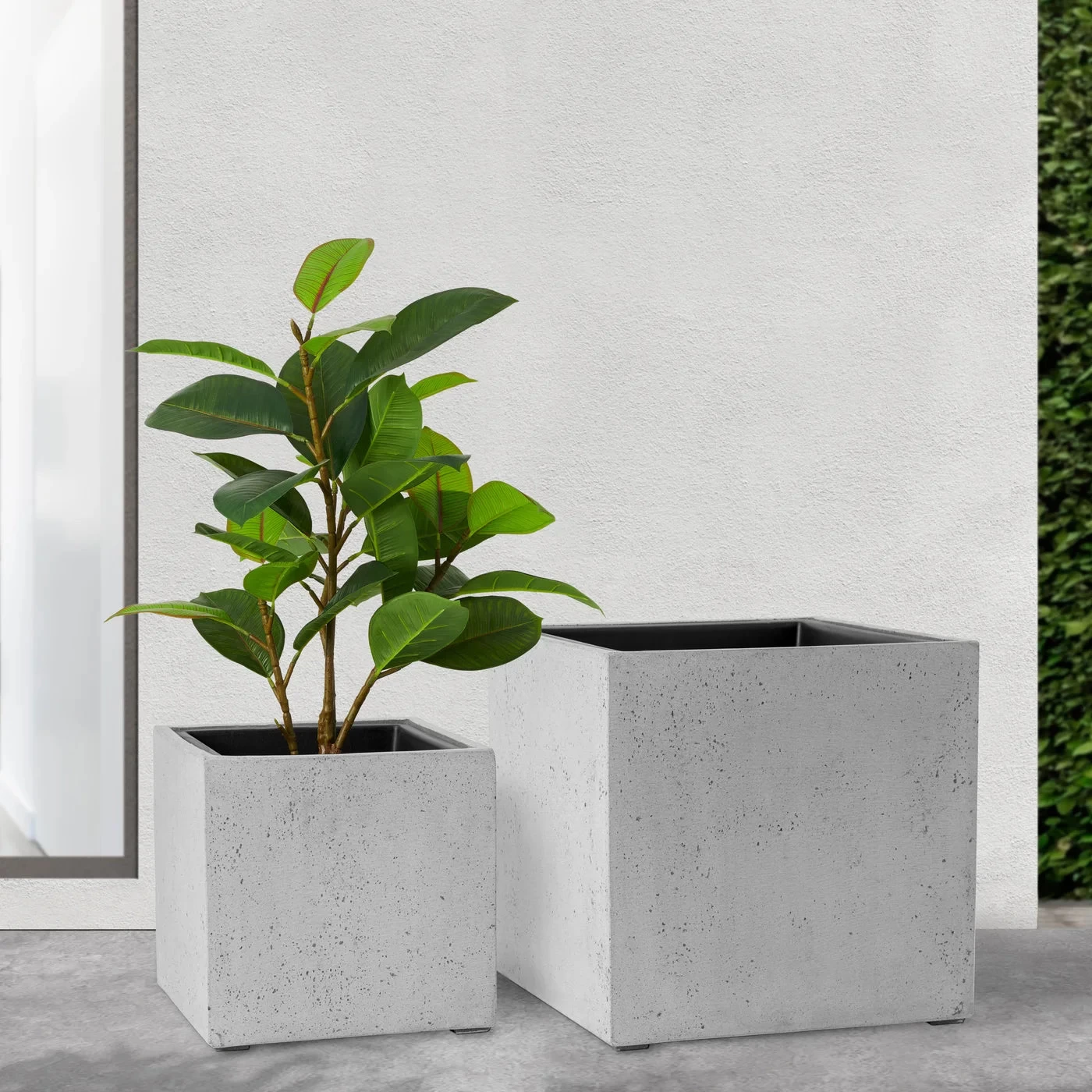 Bring a modern touch to your deck or patio with this luxurious Aria Polystone Cement Grey 2 Piece Square Planters with Liners Set. Expertly crafted in a contemporary shape from polystone and finished in a grey cement-inspired finish, this set of oversized planters will be sure to turn heads. Removable liners make planting your favorite blooming flowers or lush plants a breeze. Create an elevated outdoor display with elegance.