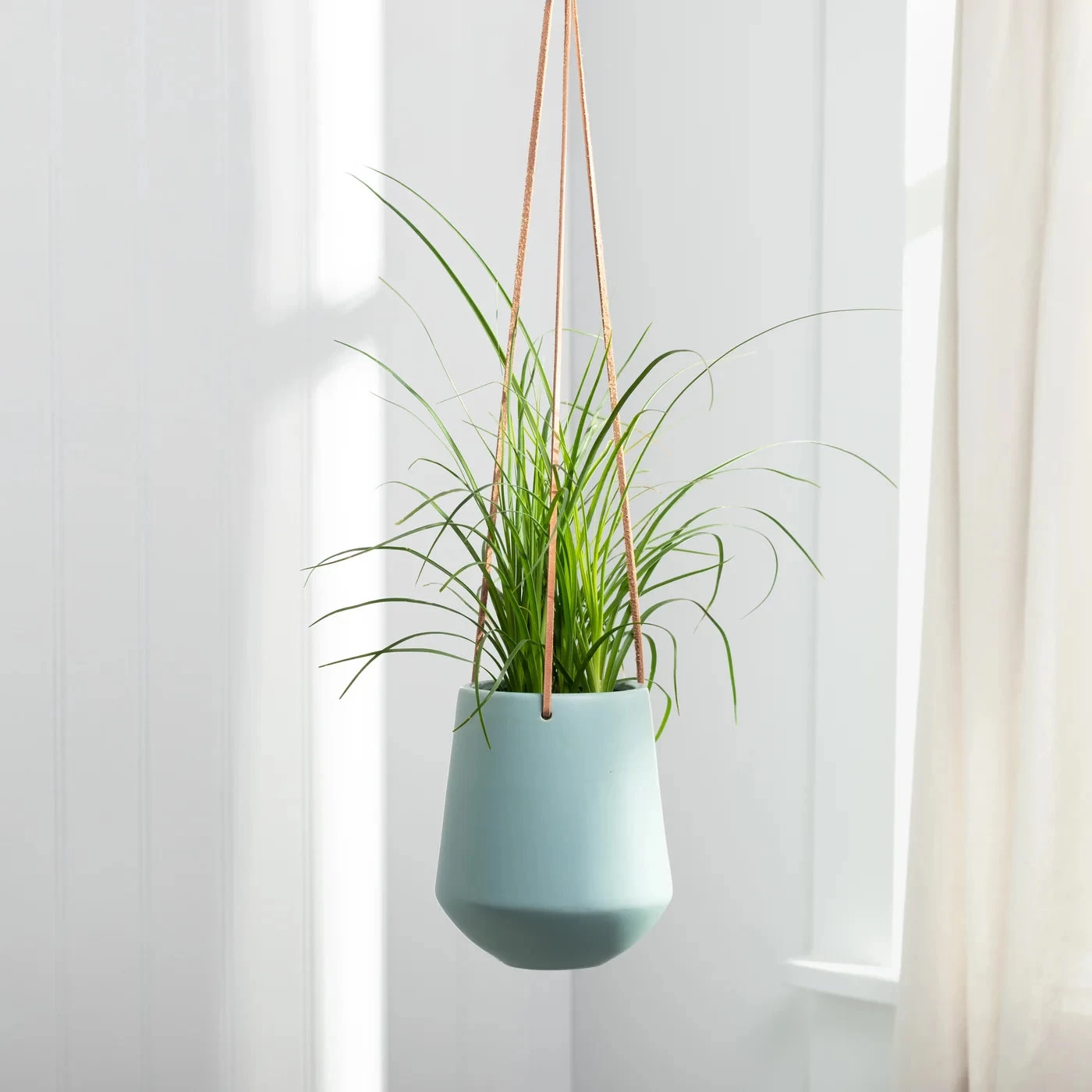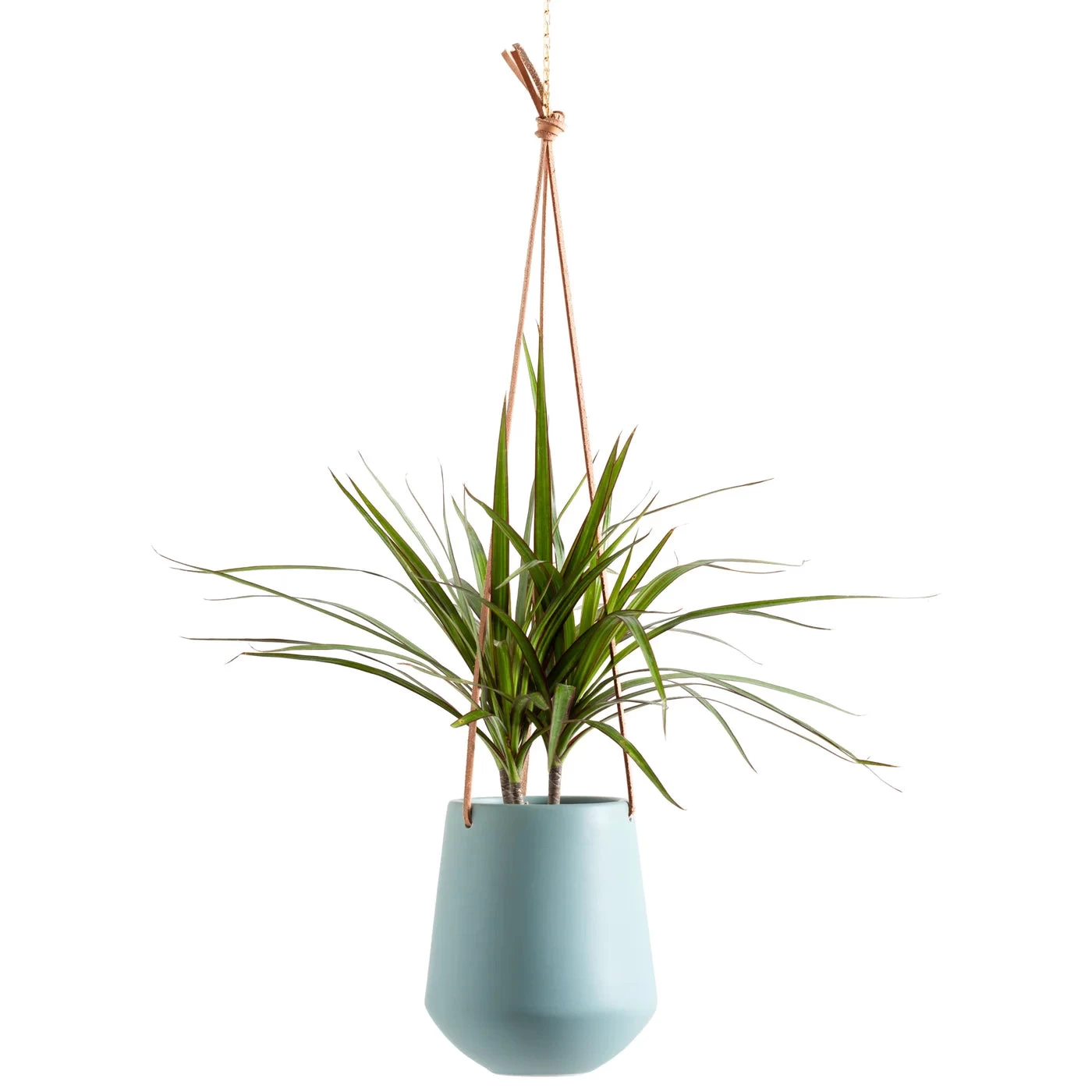Construct an entrancing in-home oasis with this exquisite ceramic hanging planter. The ceramic pot and the leather suspension cords invoke Scandinavian minimalism, perfect for unifying any decor setting. Place your favorite pre-potted herbs in the kitchen, a succulent or air plant in the bathroom, or a lush fern in the living room to make a modern declaration. The matte ceramic finish makes this planter a coveted choice amongst designers, enabling them to quickly add a hint of verdure to any space – the three leather cords additionally allow the planter to be hung at different heights by merely fastening the leather straps to the desired length.
