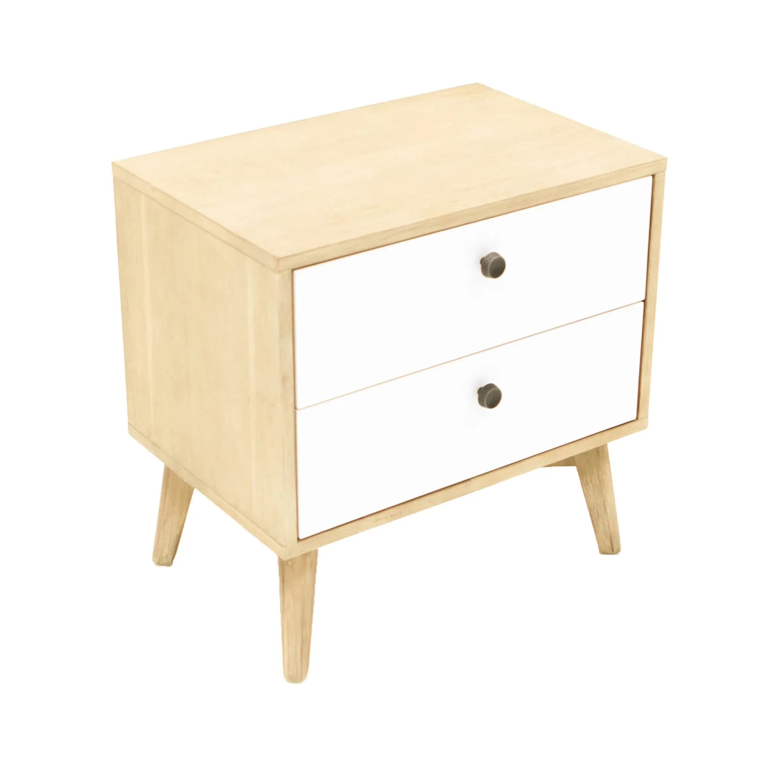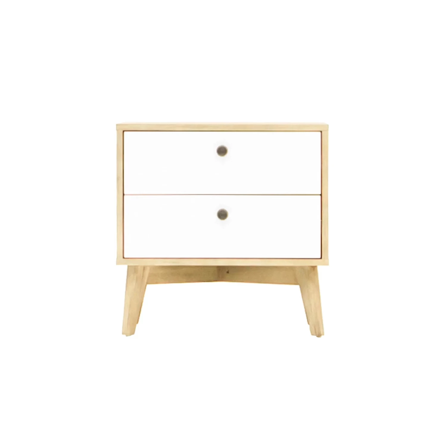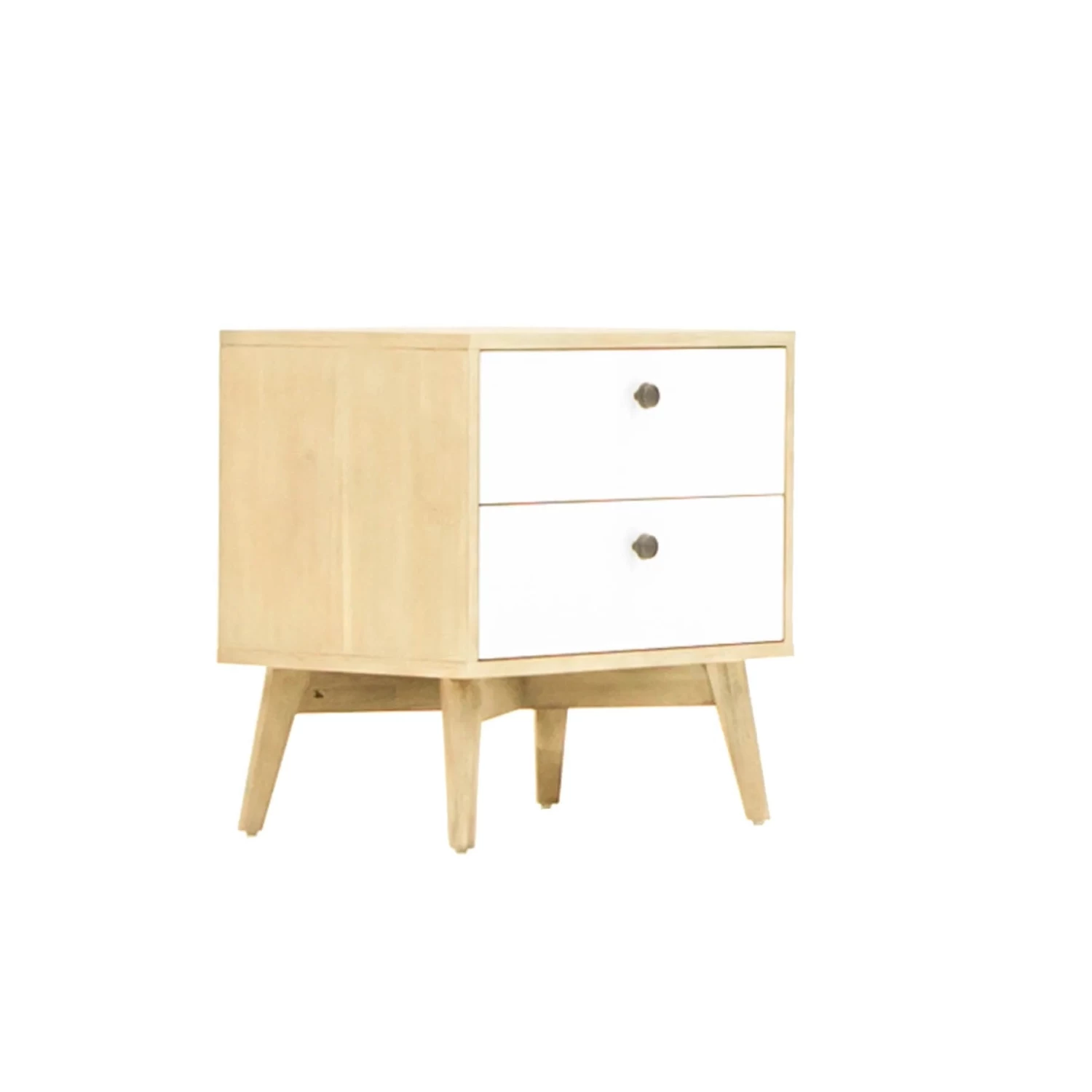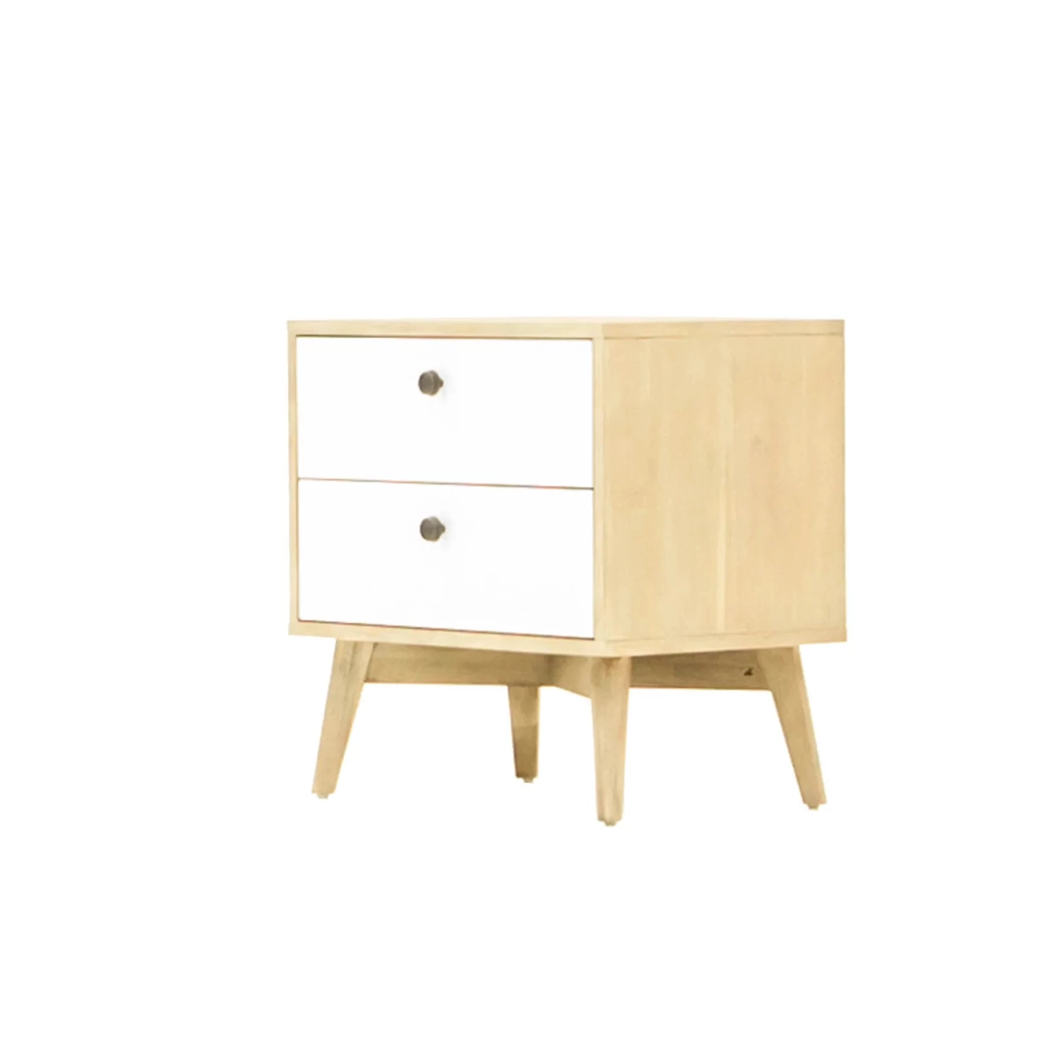 Goodbye basic, hello trending. This bedroom collection will transform your space with its tapered legs, clean-lines, and light driftwood finish, which beautifully compliments the white drawers. Maximize your space with the additional storage and small metal knobs that complete this streamlined look.