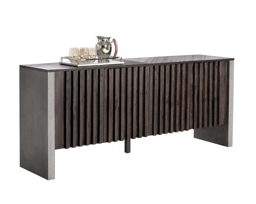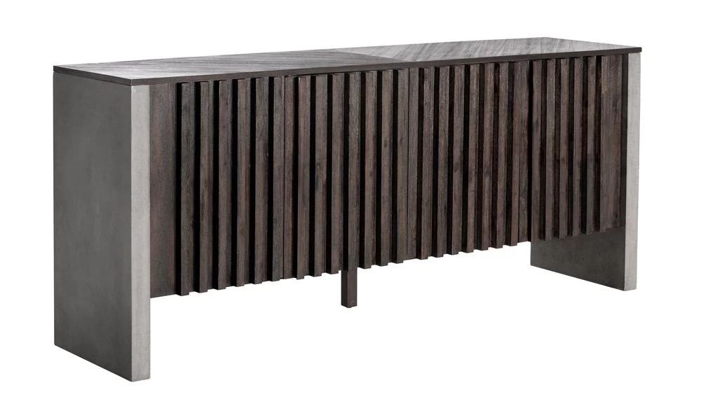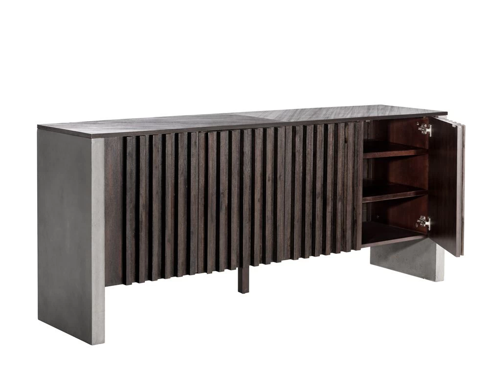 The Bane Sideboard commands attention. Featuring a rich acacia wood top with dramatic ridged detailing on the face of four cabinets with interior shelving. Supported by substantial concrete legs for an urban and contemporary look.