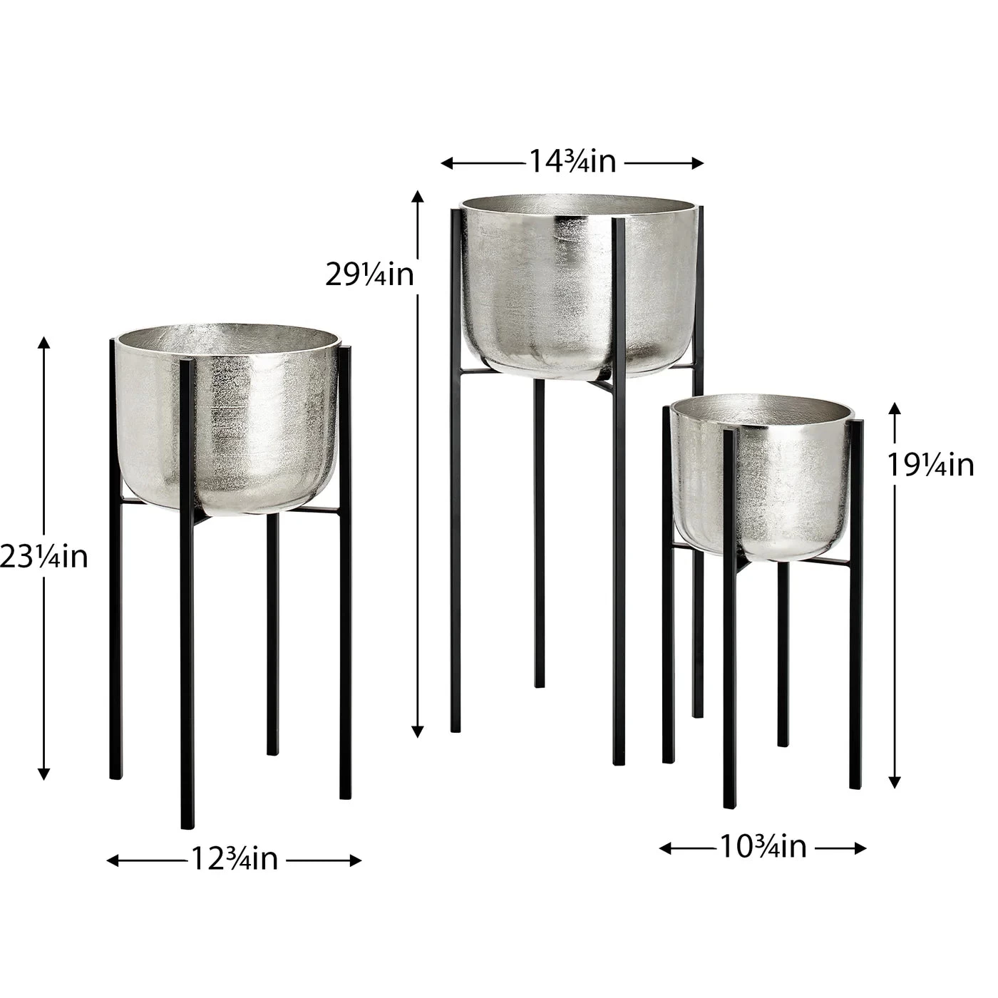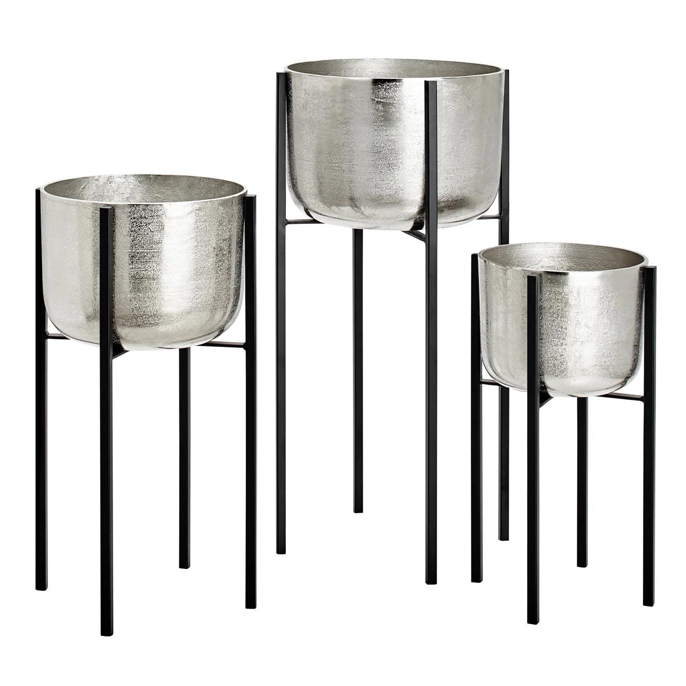 Use these oversized aluminum planters on metal stands to add a dramatic touch of green