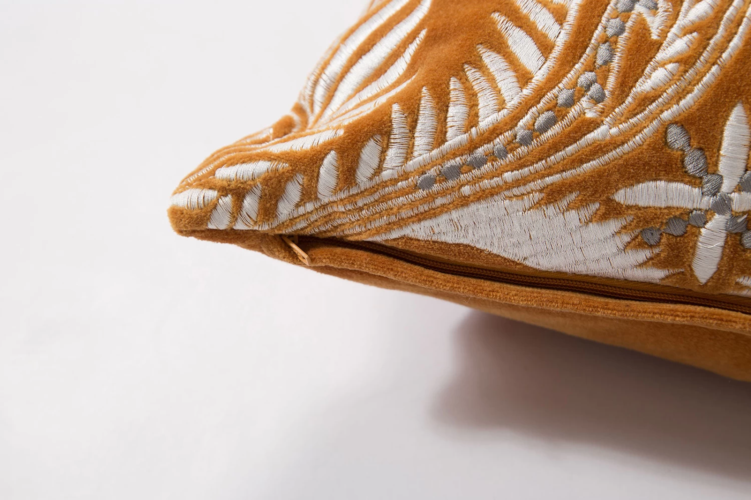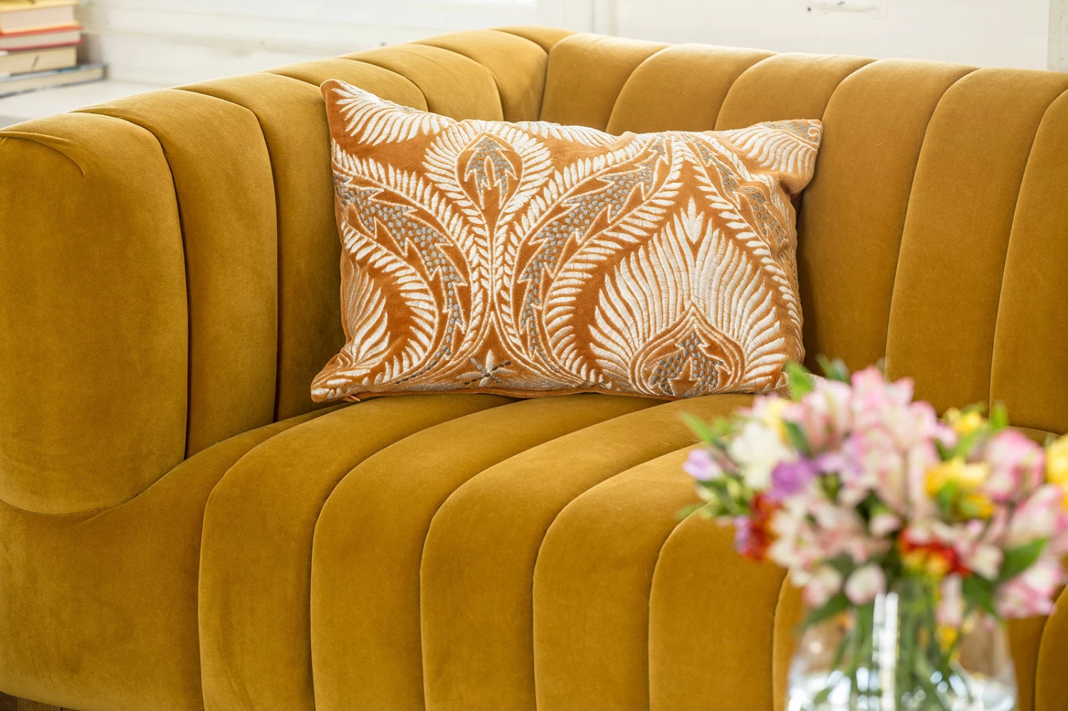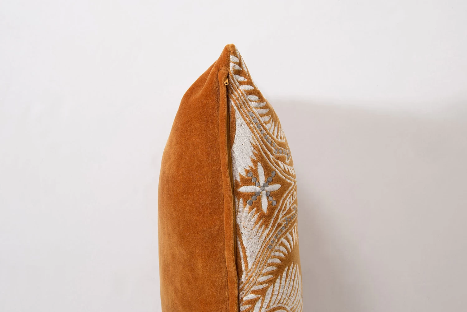 You can never have too many cushions so it’s really no problem to add our Bohemian Autumn Kidney Cushion to your repertoire. This elongated version is made from lush, burnished gold poly velvet with a cream and grey embroidered pattern. Smart and sexy anywhere in the home.