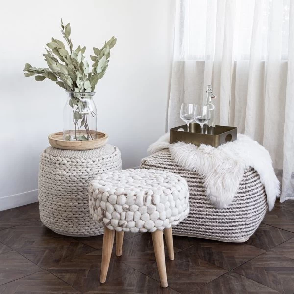 Our Bohemian Pouf Braid is perfect for mid-mod, retro and boho lovers. Stylish and comfy, Braid is made from handwoven cream wool. Pair with a tray (or two) for the perfect versatile accent or coffee table or use it as a footrest when you snuggle down with that book.
