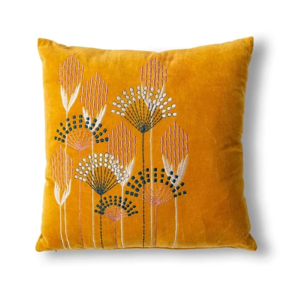 A bit art deco, a bit boho whimsy… this cushion is everything. The simple and elegant floral pattern in muted blue, pink and cream is stitched onto a rich mustard-yellow poly-cotton velvet cover. This gorgeous cushion adds insta-glam and a pop of colour to beds, chairs and benches.