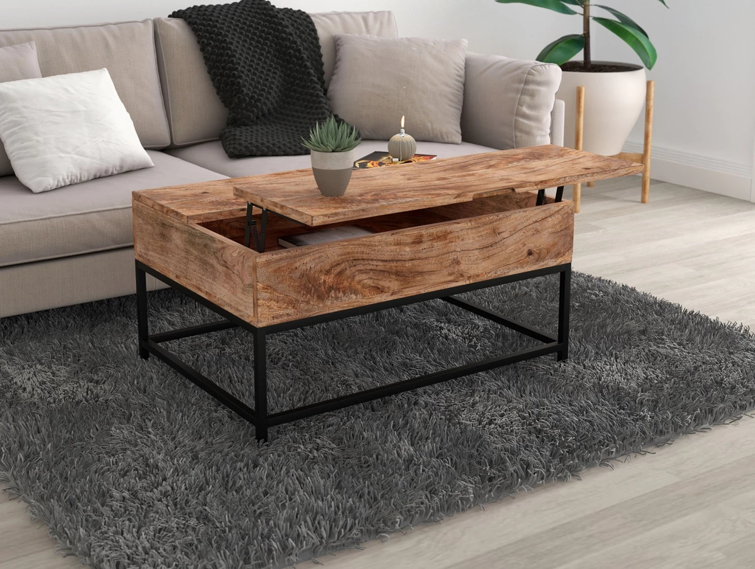 This rustic modern coffee table has a lift-top storage compartment that creates a spacious hideaway for things that you want out of the way but still within reach – think throw blankets, gaming consoles and controllers, board games, and photo albums. The table lifts easily and, when pulled open, can create a handy eating surface so your binge-watching can go uninterrupted. The sustainable solid wood table top is finished beautifully in a natural burnt finish, preserving the accentuating features of the mango wood. Great for a casual living space, in a cottage or rec room.