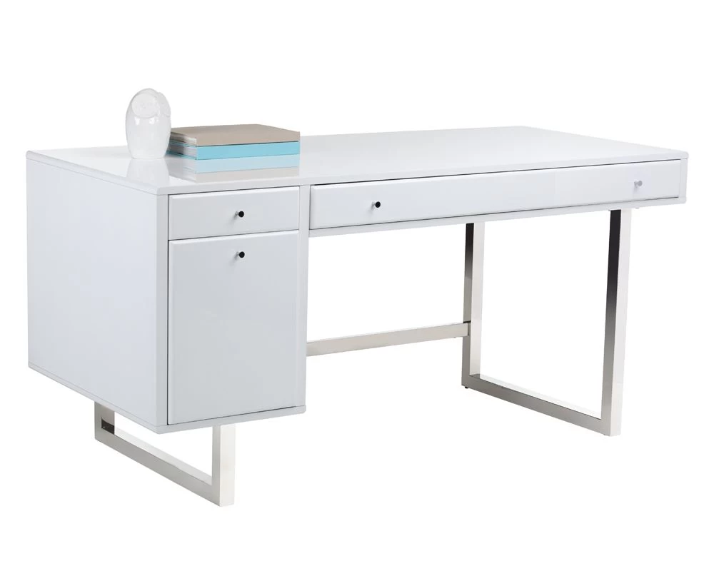 Simply chic and modern in a high gloss white finish. This oversized desk allows for ample working space and storage. Features one main drawer with two compartments, and two additional drawers for office supplies and filing. Finished with a stainless steel