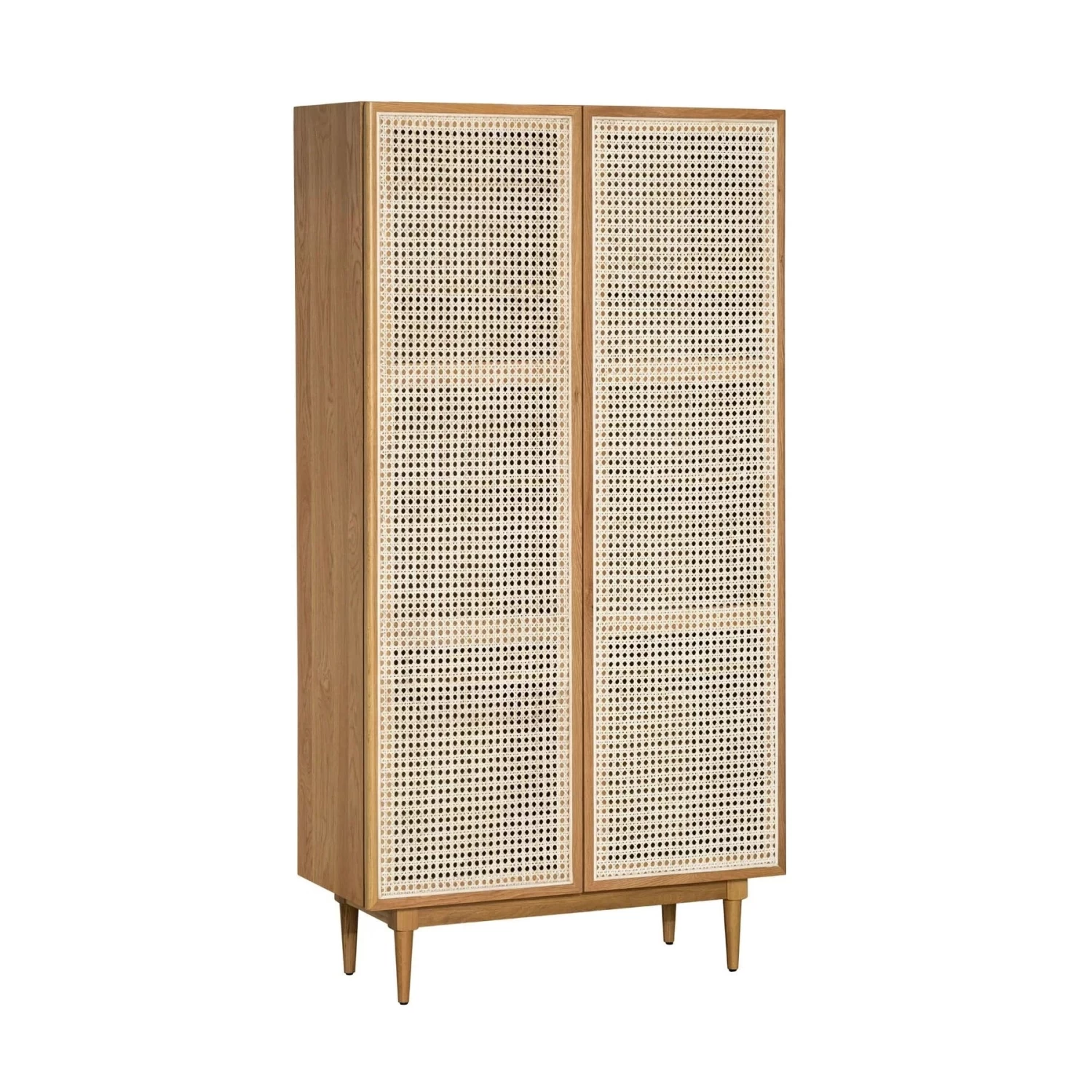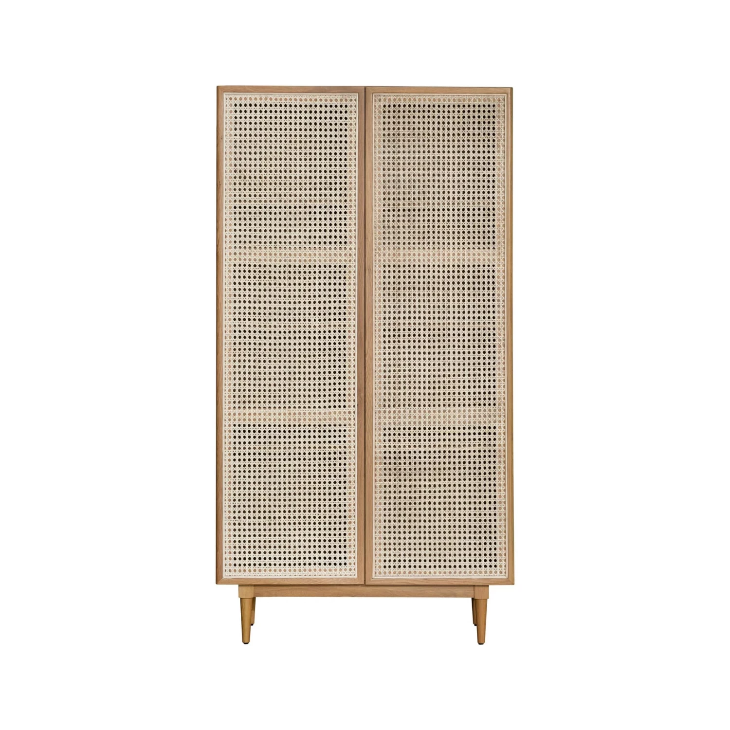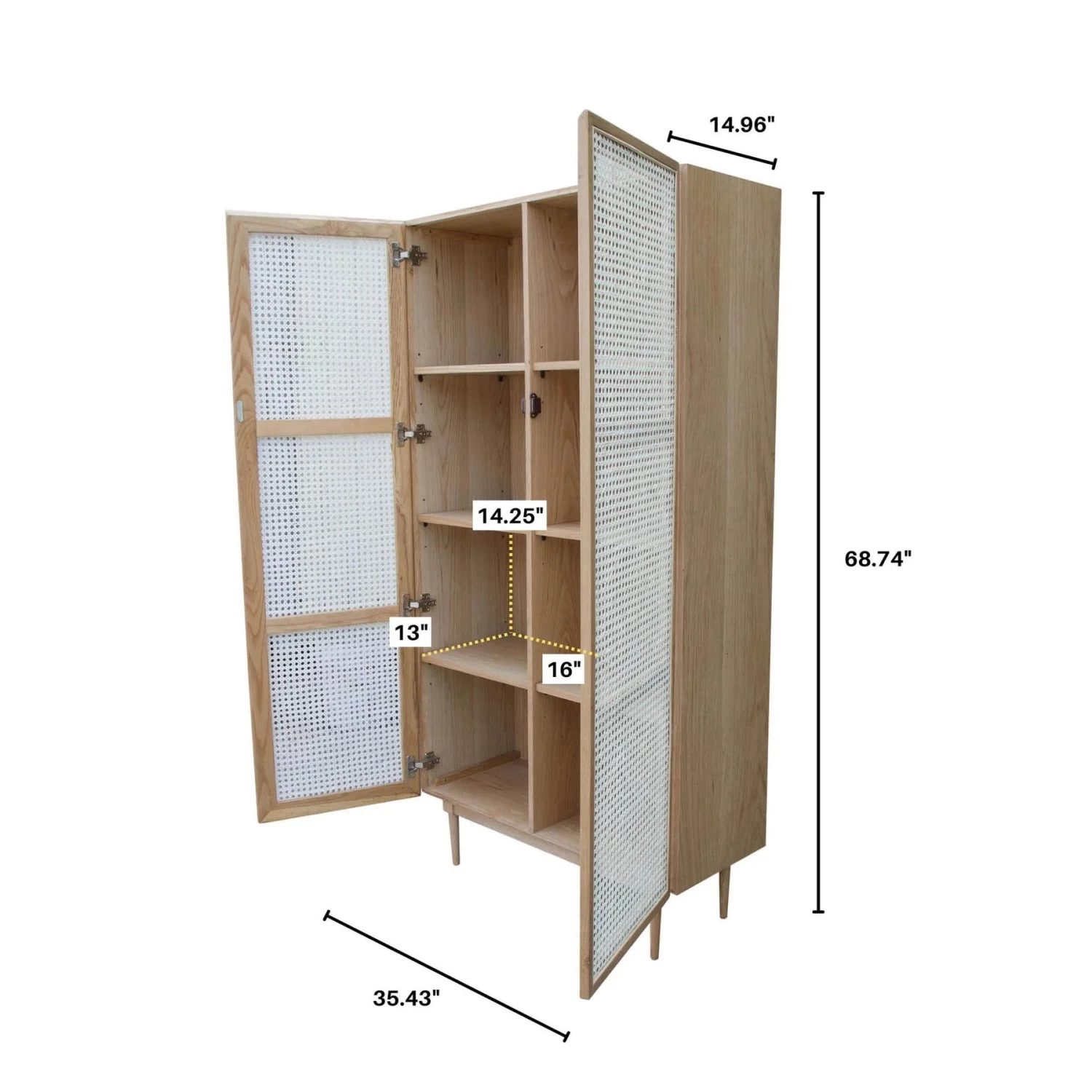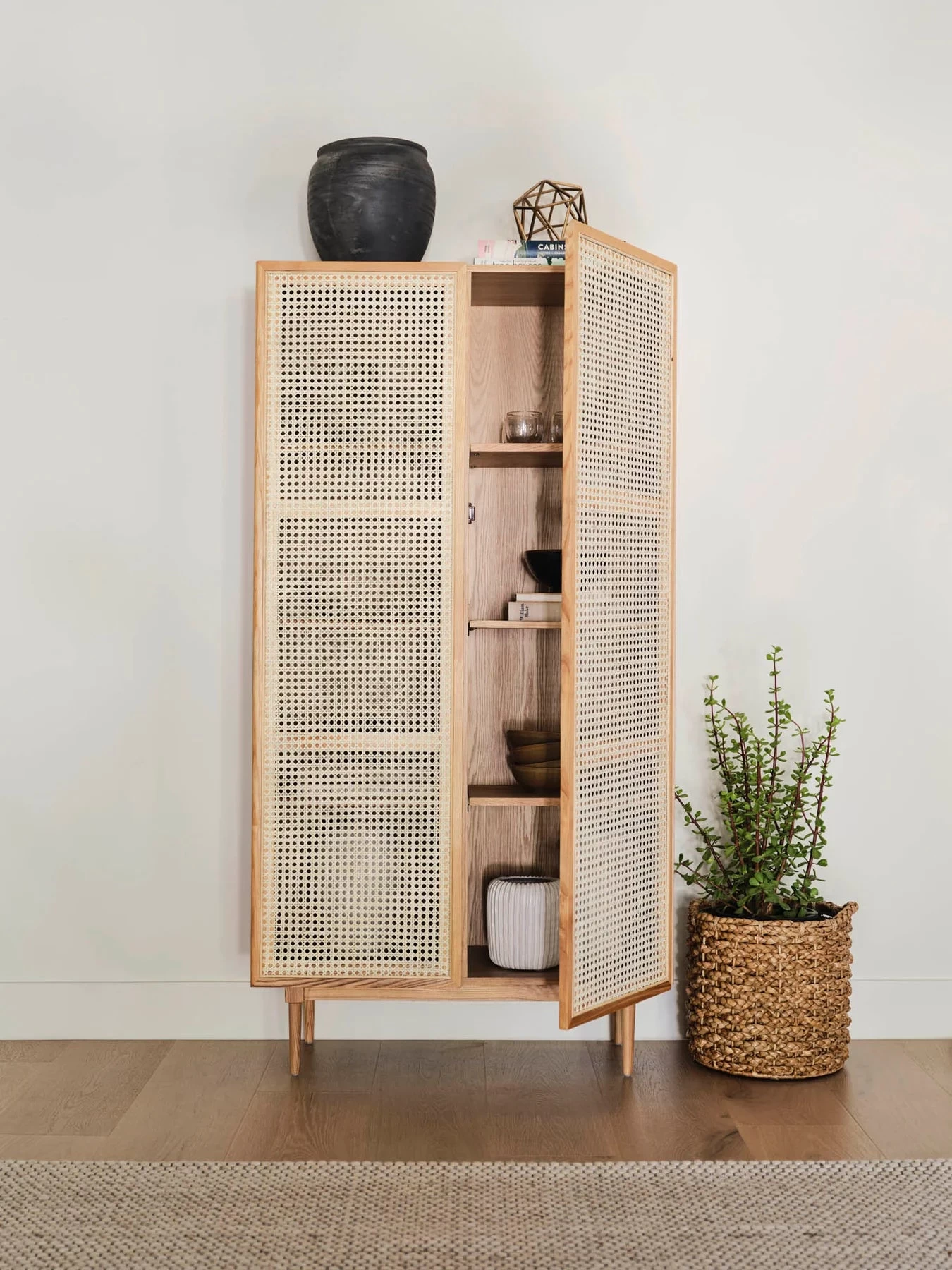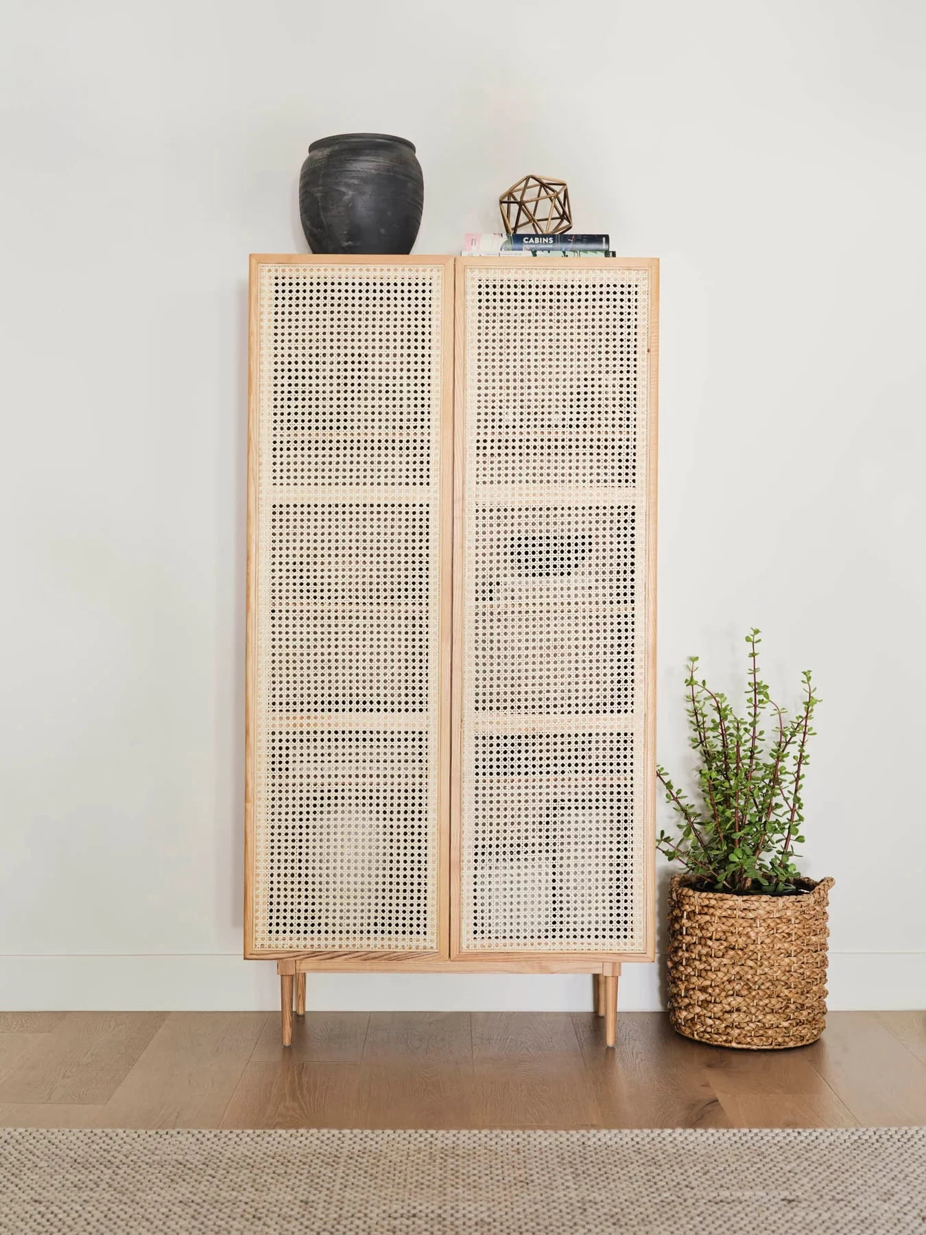 This Cane Bookcase with Full Doors – Natural brings chic contemporary style to any living space with its matte black exteriors and woven rattan. Its solid construction from natural and reclaimed wood ensures durability and stability. Utilize the six adjustable shelves to store and organize books, pictures or other decoratives.