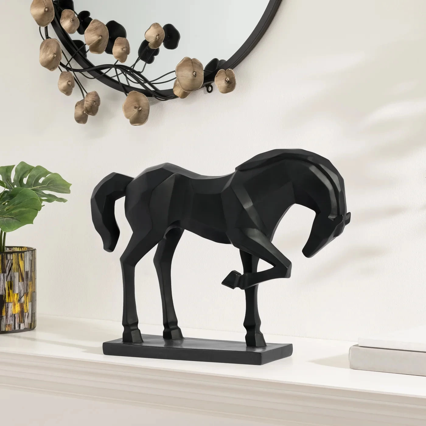 Enliven your abode with this Carved Majestic Prancing Horse Decor Statue. Crafted from stately resin, its grandeur and exquisite design will bring an air of grandeur and regality to any room in your home. Perfect for adding a timeless touch of class and sophistication.