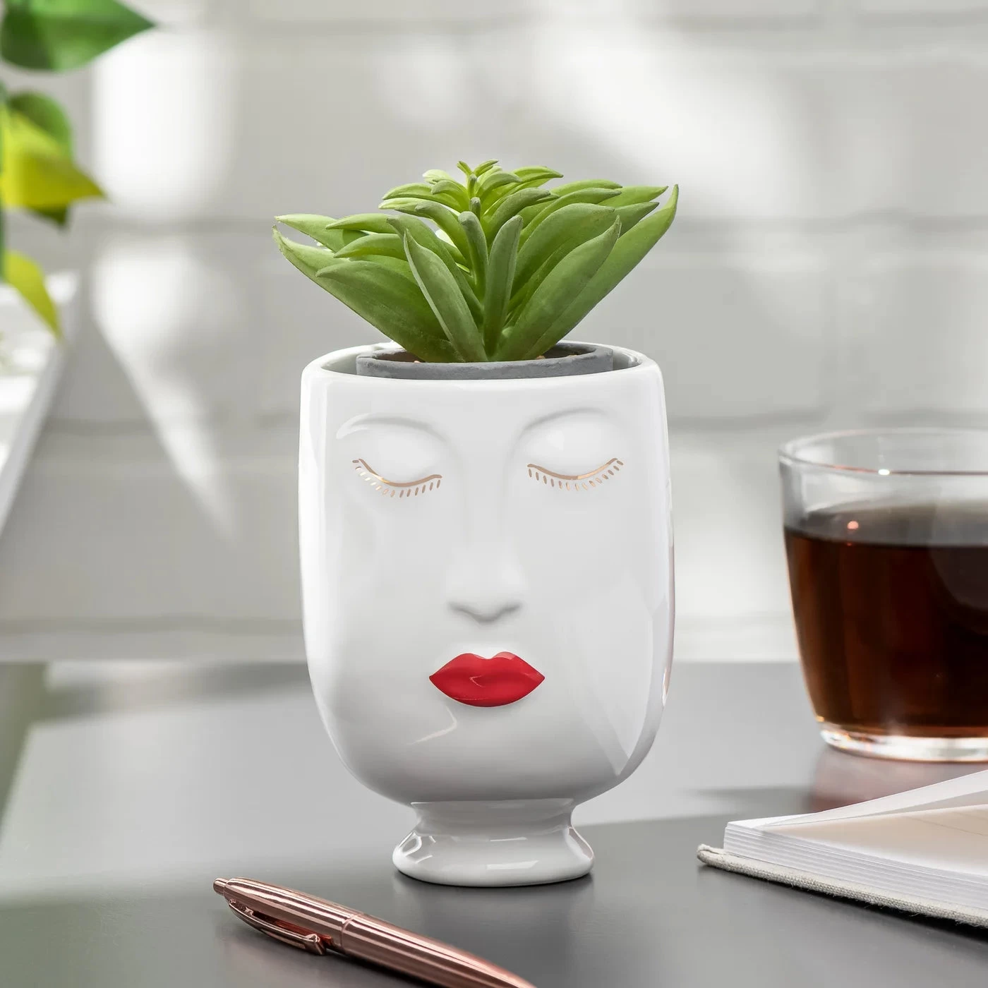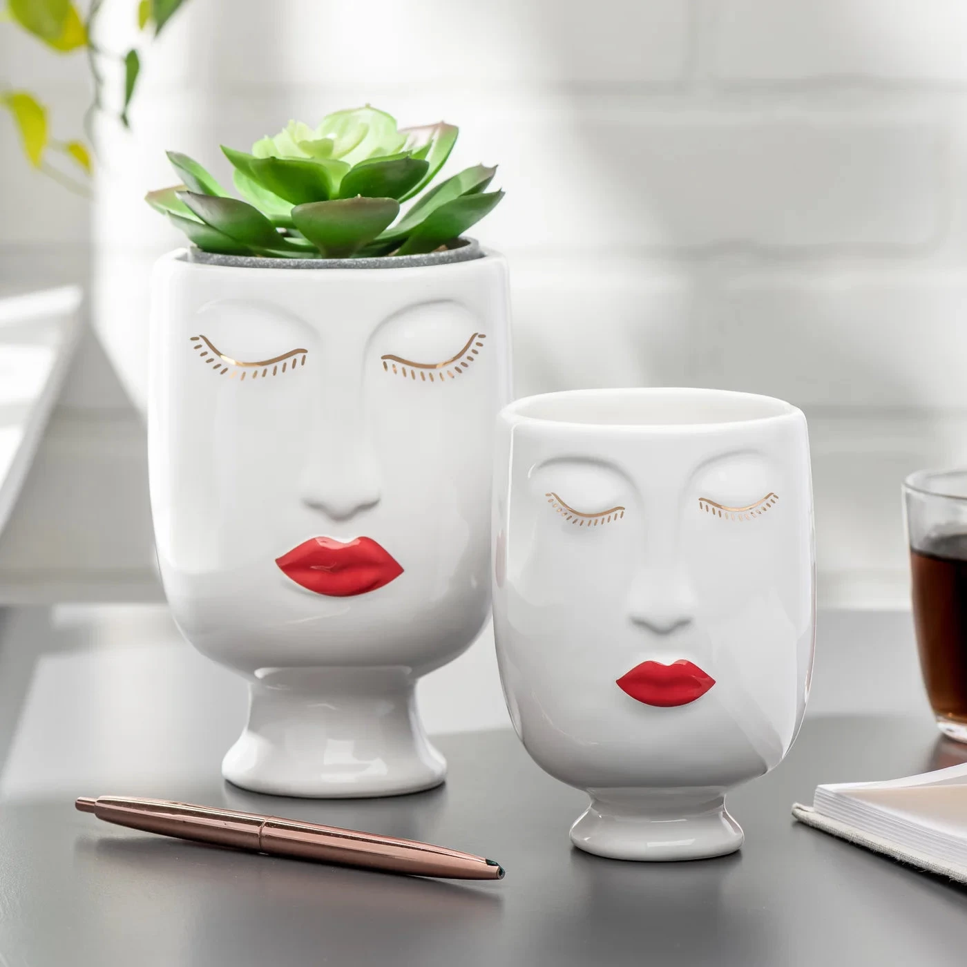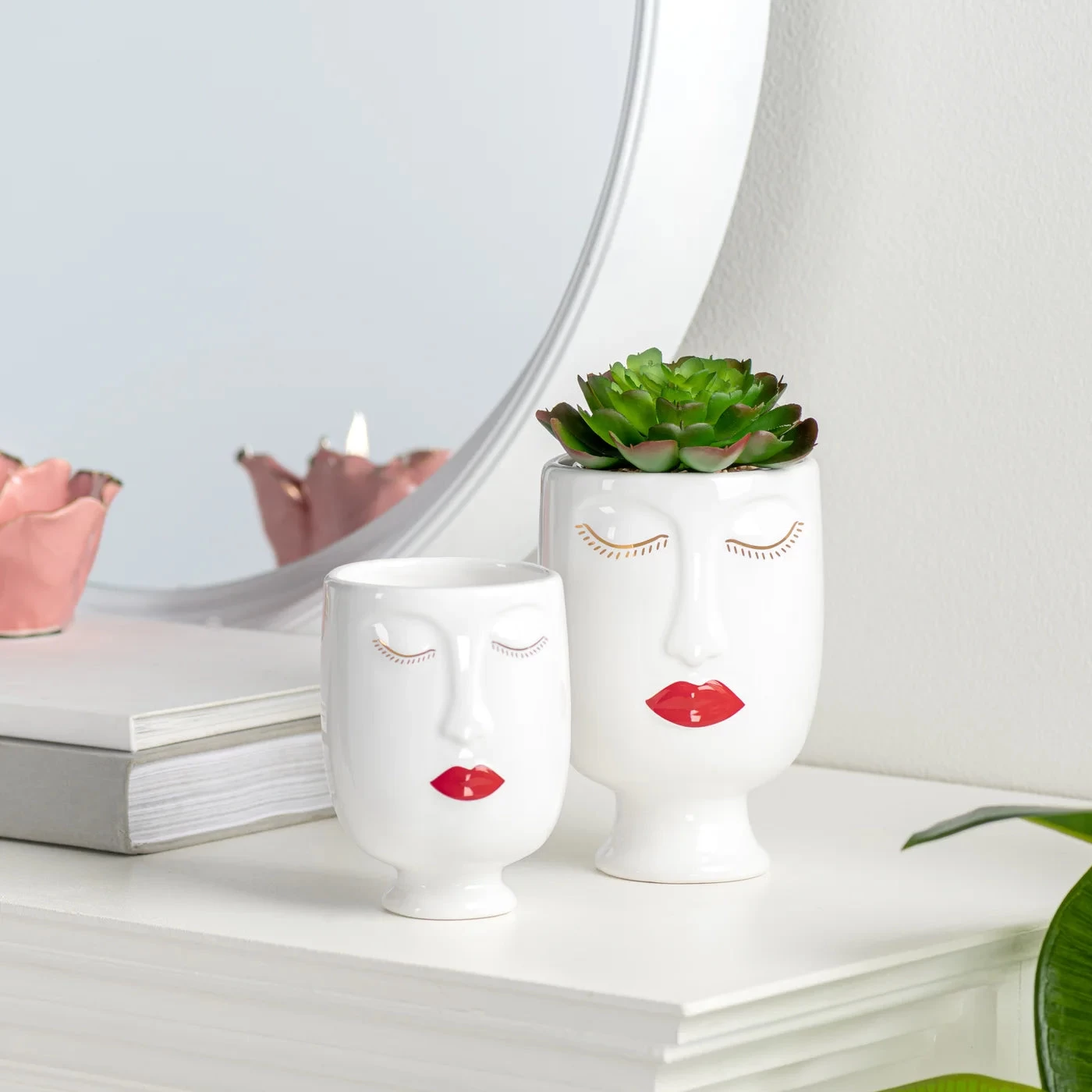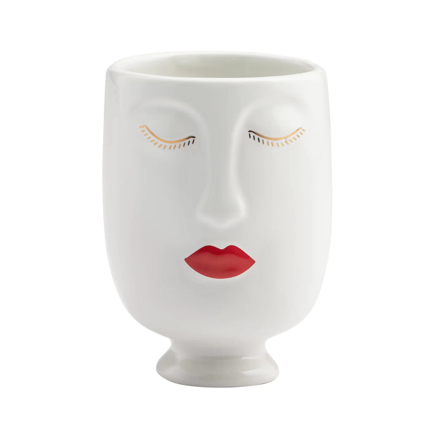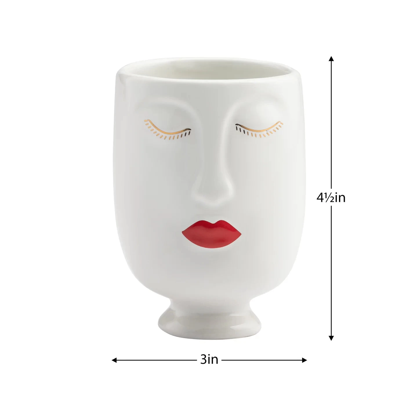 Add sophistication and style to any interior with this Chic Red Lips Lady 3dx4.5h” Ceramic Face Vase. Crafted from high-quality ceramic for an elegant, timeless look, this whimsical vase is perfect for filling with fresh florals or a potted plant to create an eye-catching display on shelves and tabletops. Add a unique touch to special occasions with this chic piece, or mix and match with the Chic Moustache Man Vase for a truly exclusive look.
