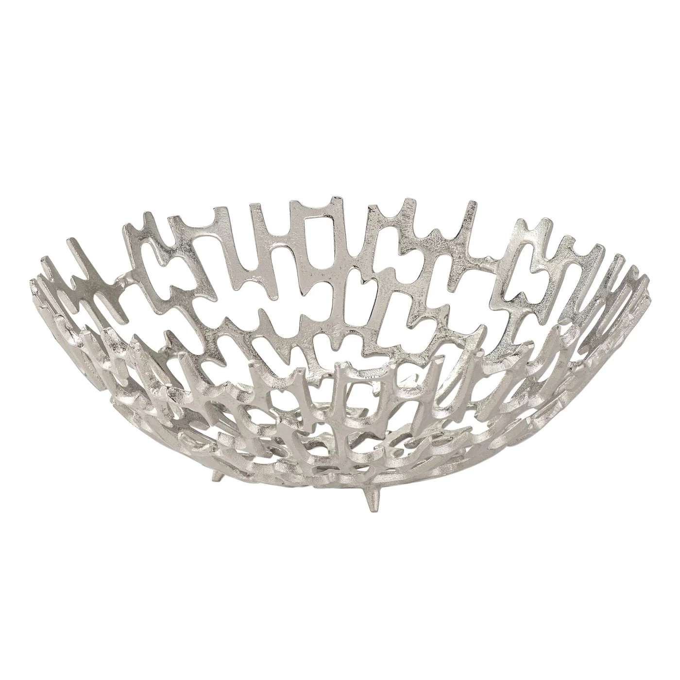 This aluminum footed bowl in a silver finish features a unique design making it an eye-catching piece for any home. Place on a table and fill with decorative objects for the ultimate centerpiece.
