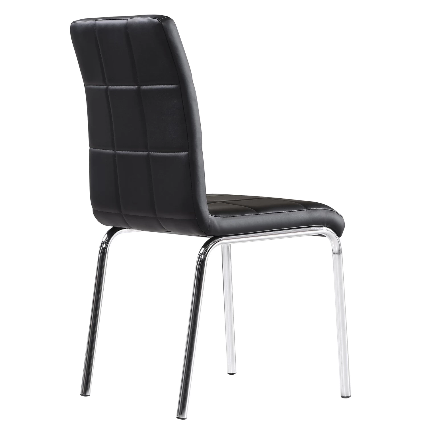 This dining table features a sleek black 8mm tempered glass tabletop for wipe-clean durability along with effortless style. Chromed metal chair frame ensures sturdy support on this contemporary chair. Curved faux leather back and seat provide comfort for casual dining.