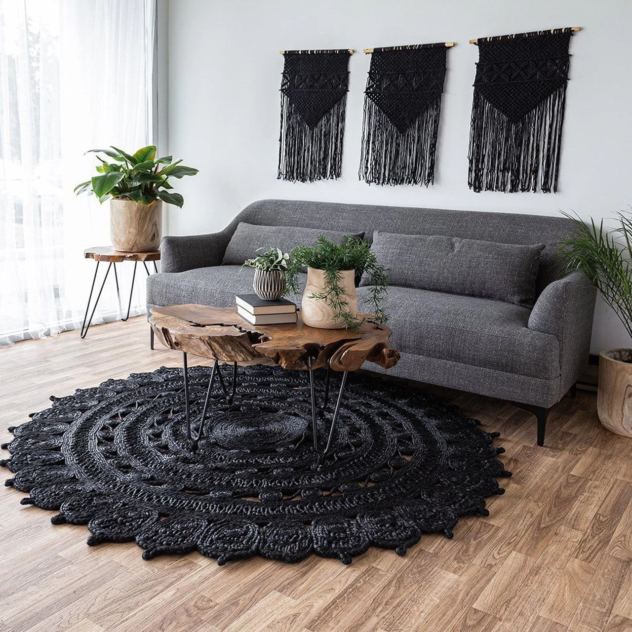 Hand-woven in black jute, this flower-shaped rug looks amazing layered with other rugs, under a table or in an entryway. Long-wearing and durable, jute is a fast-growing renewable natural fibre for the home.