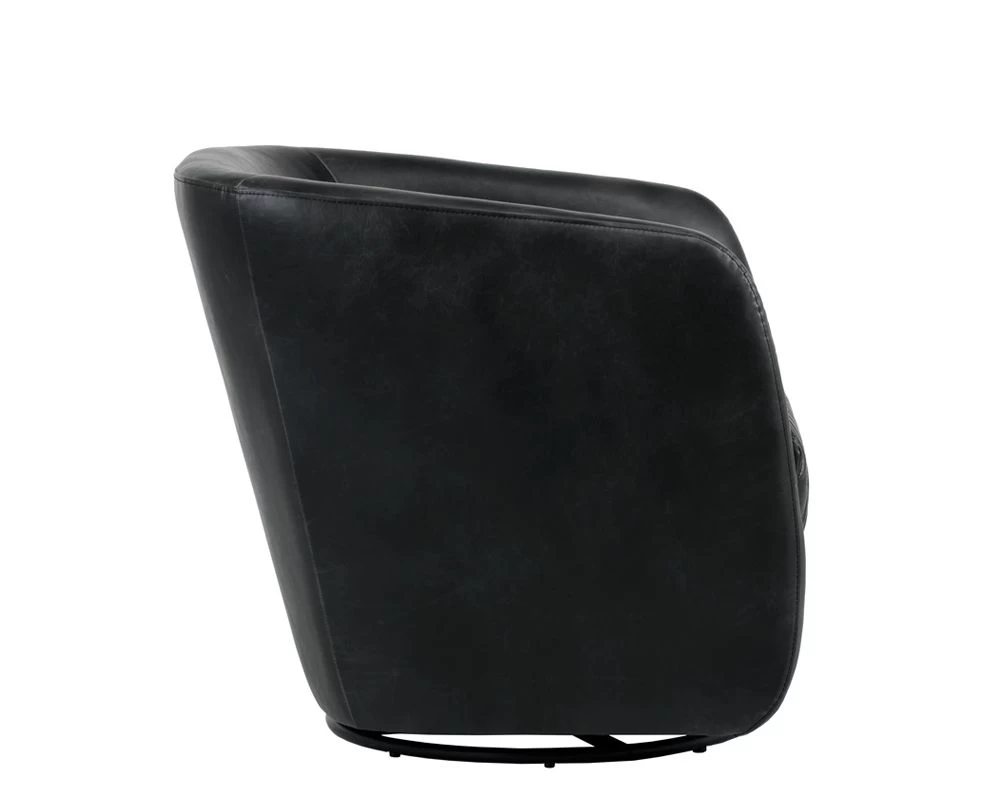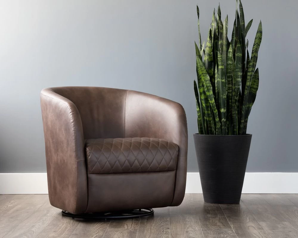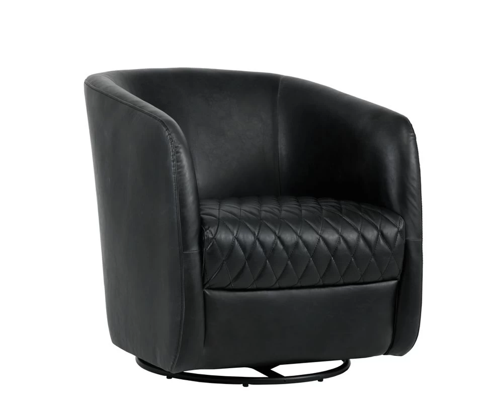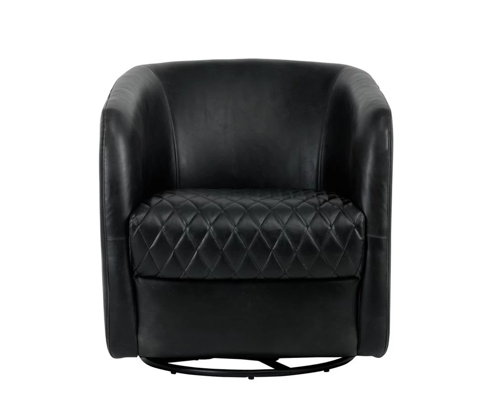 This barrel-back club chair from our 5West collection features a diamond-stitched seat and a swivelling black steel round base. Sits comfortably in a vintage-look havana dark brown and coal black faux leather.