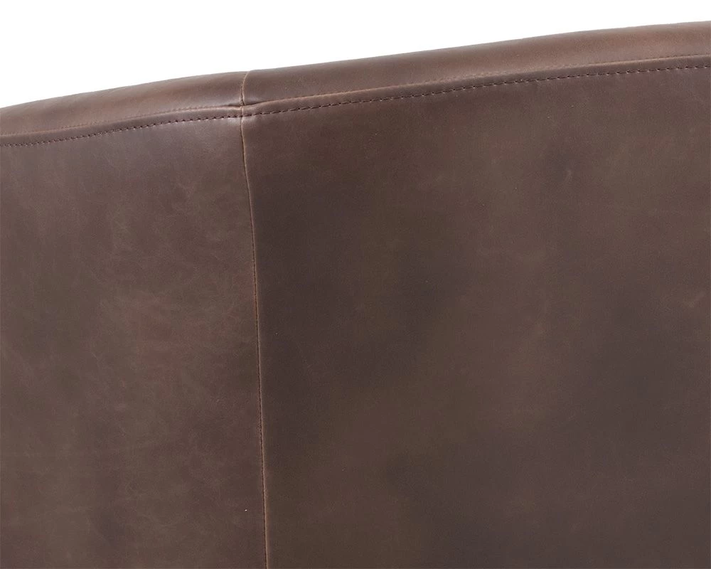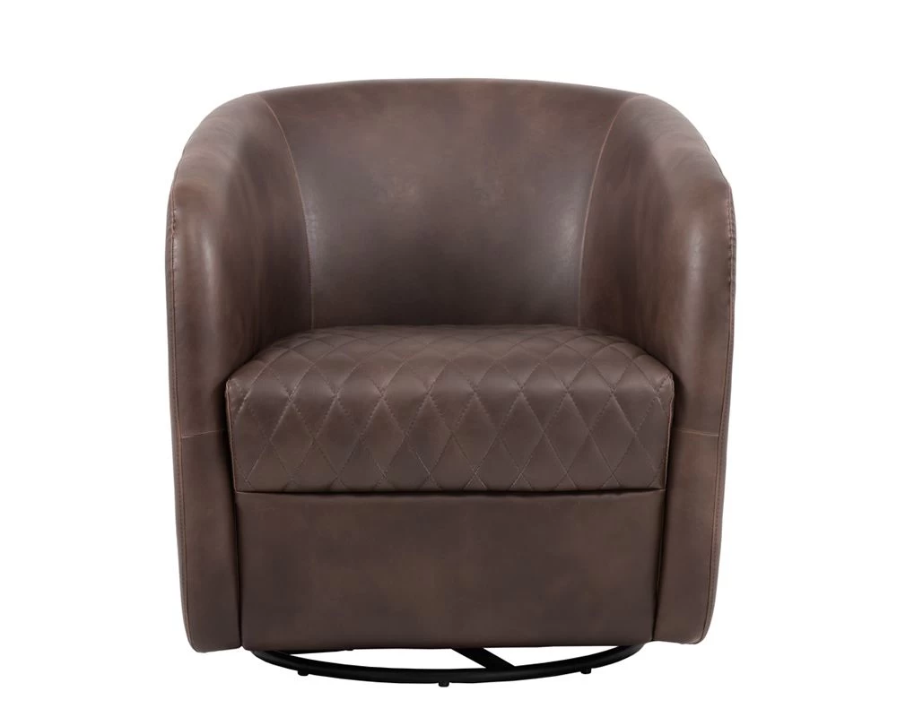 This barrel-back club chair from our 5West collection features a diamond-stitched seat and a swivelling black steel round base. Sits comfortably in a vintage-look havana dark brown and coal black faux leather.