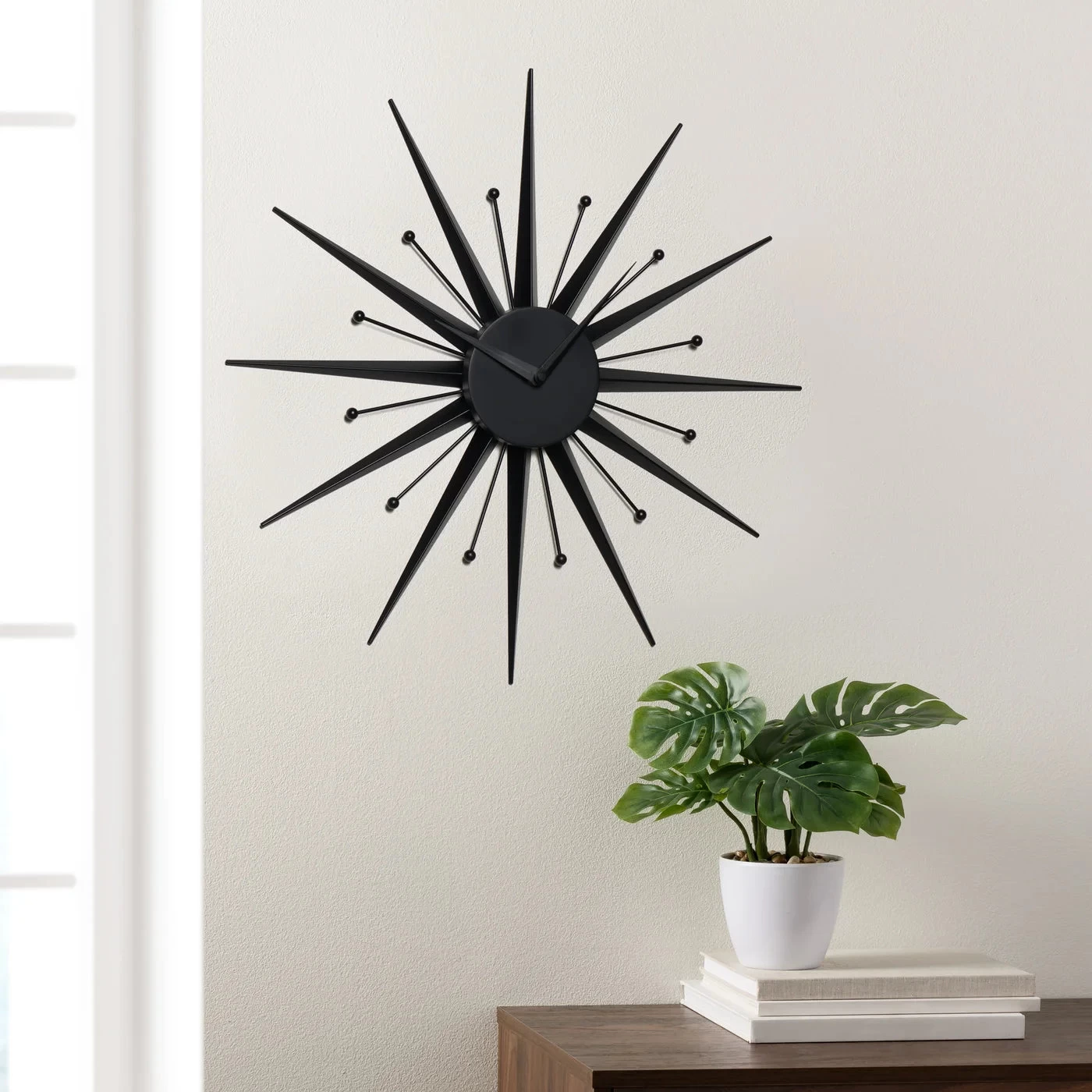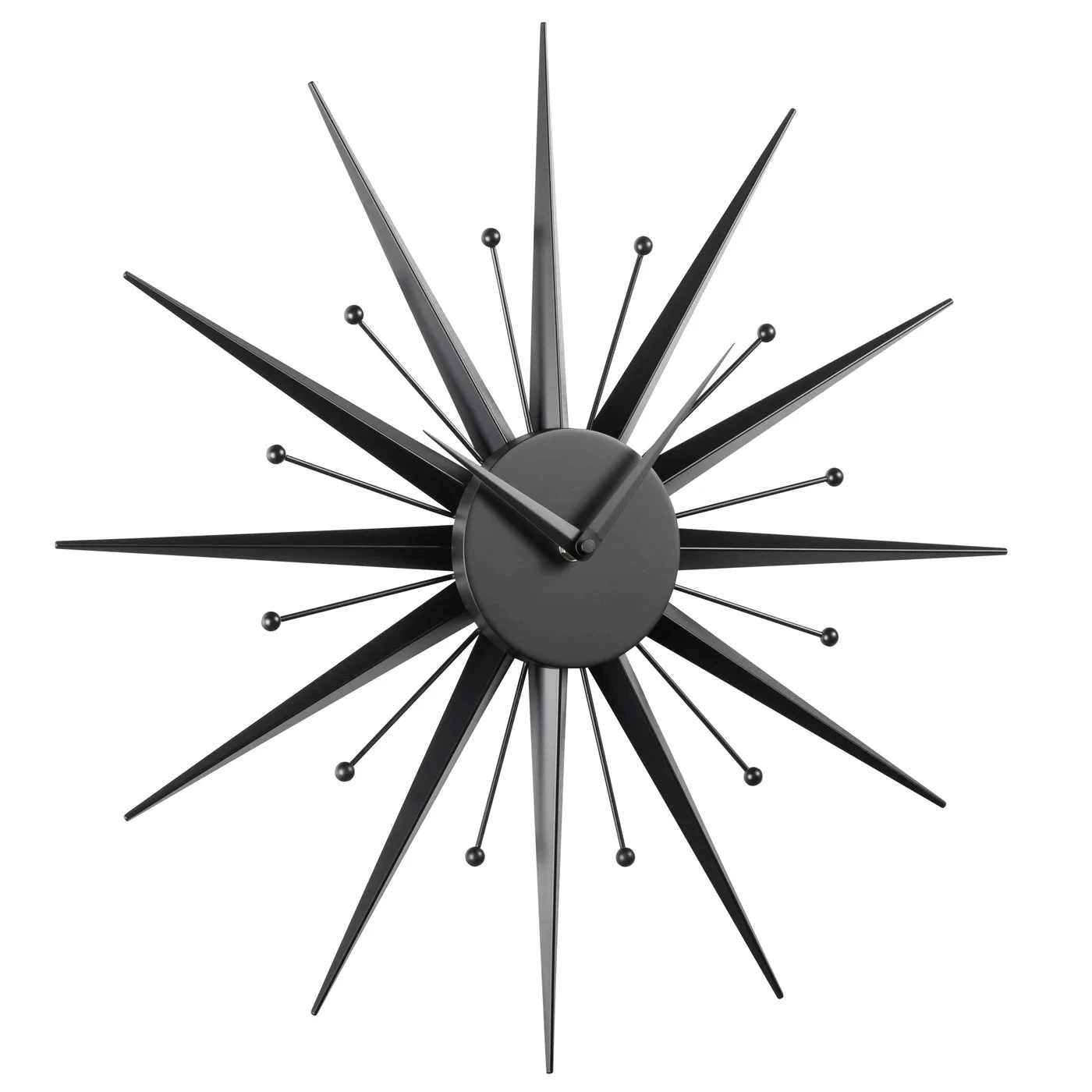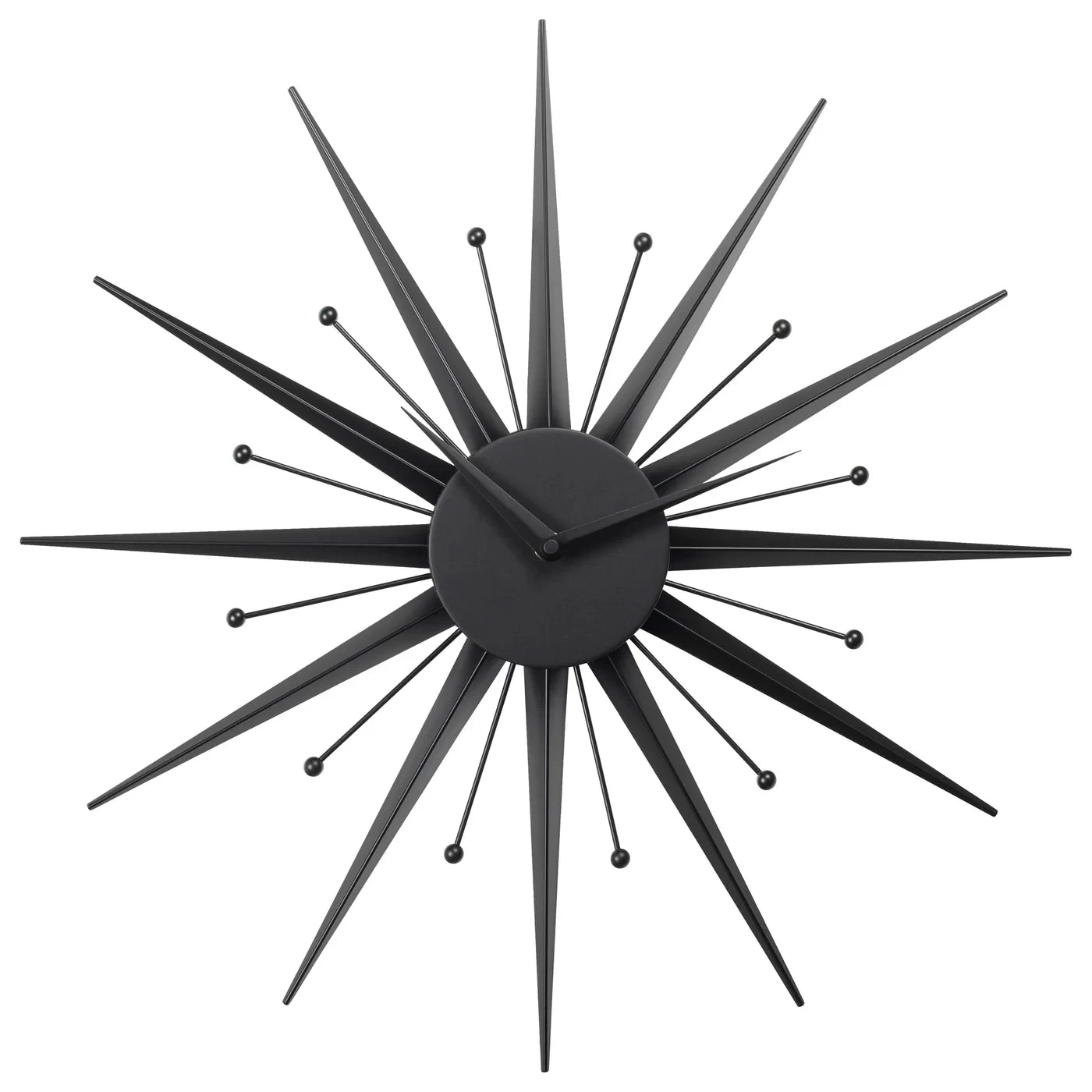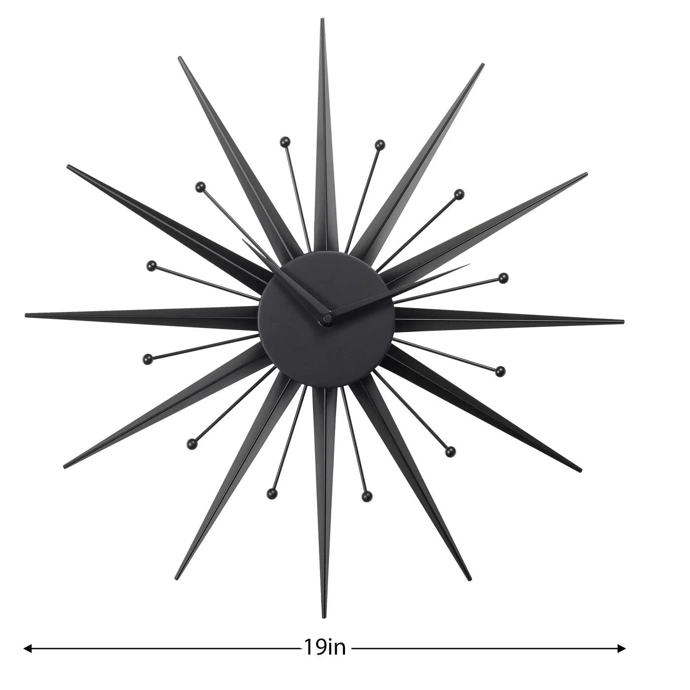Update your space with this Mid Century Modern inspired wall clock that doubles as a stylish art piece. Featuring a metal 3D sunburst shape and modern matte black finish, this piece is perfect for any modern home.