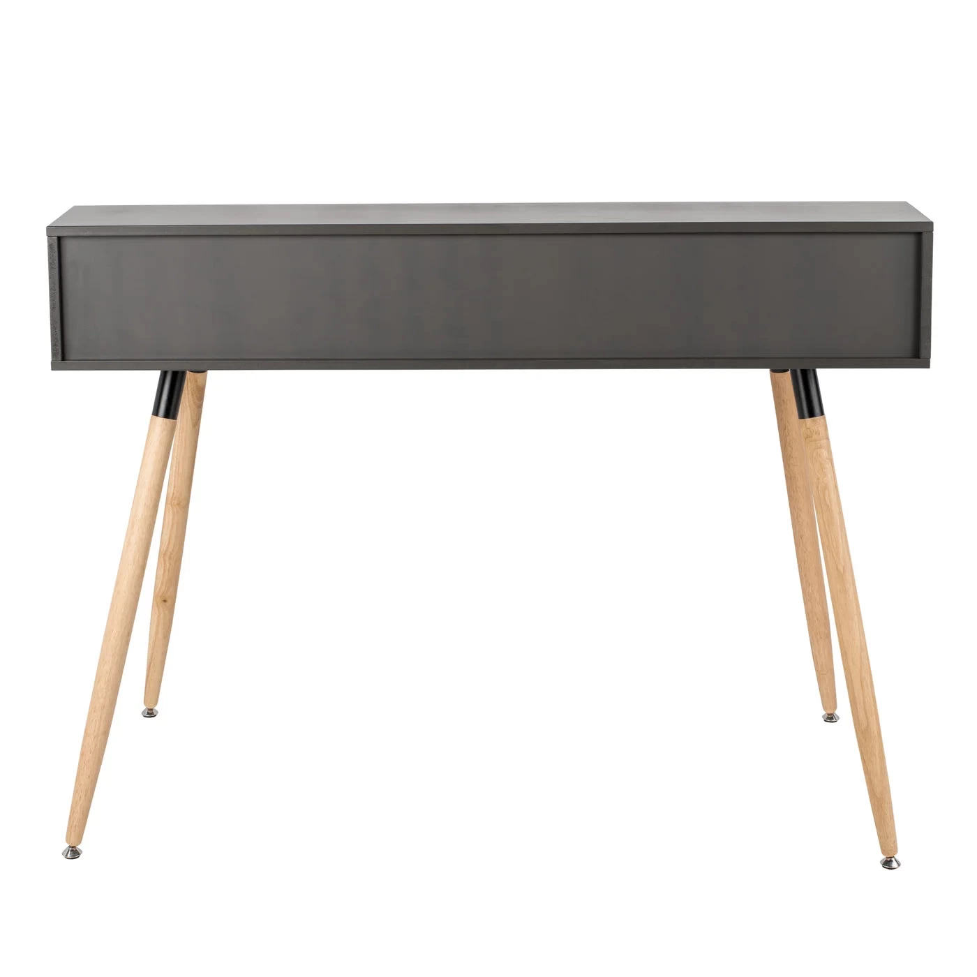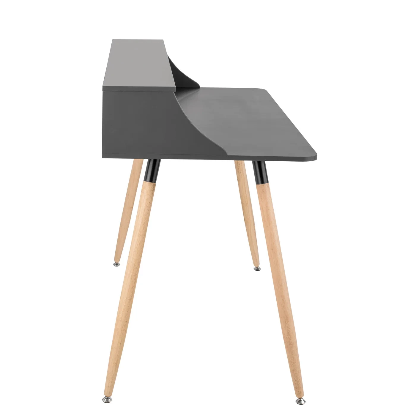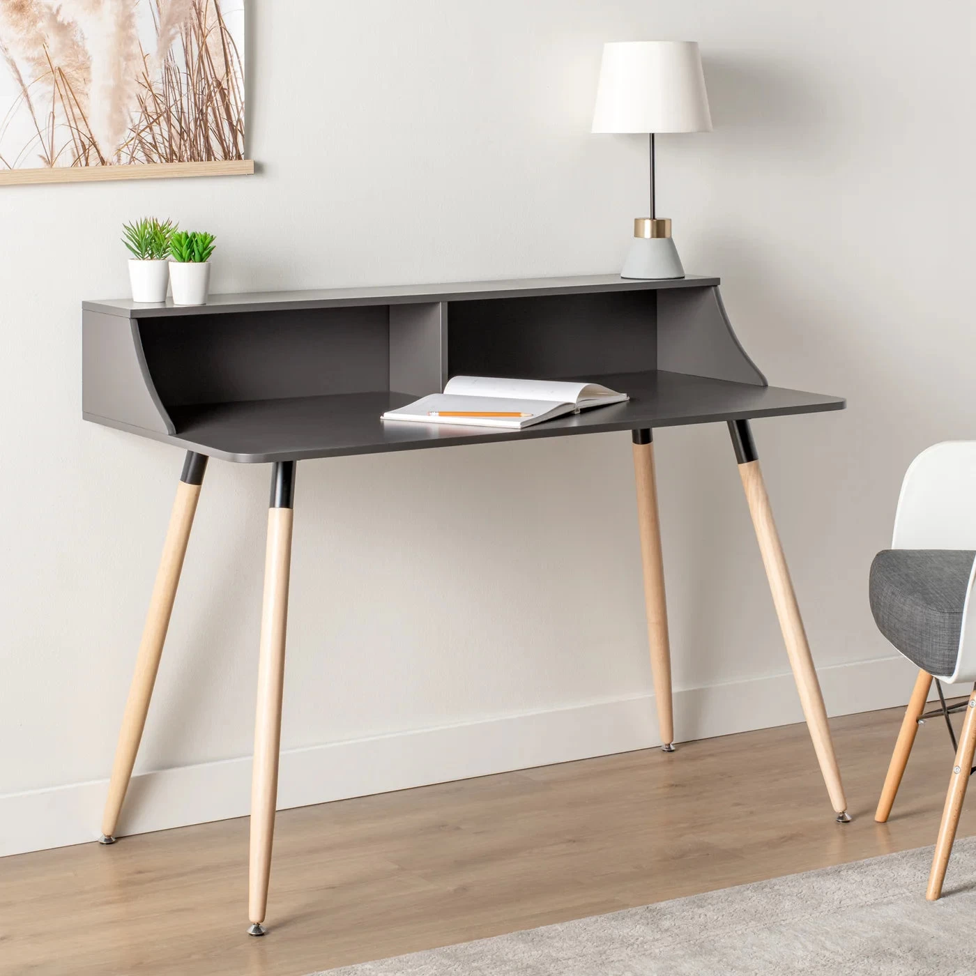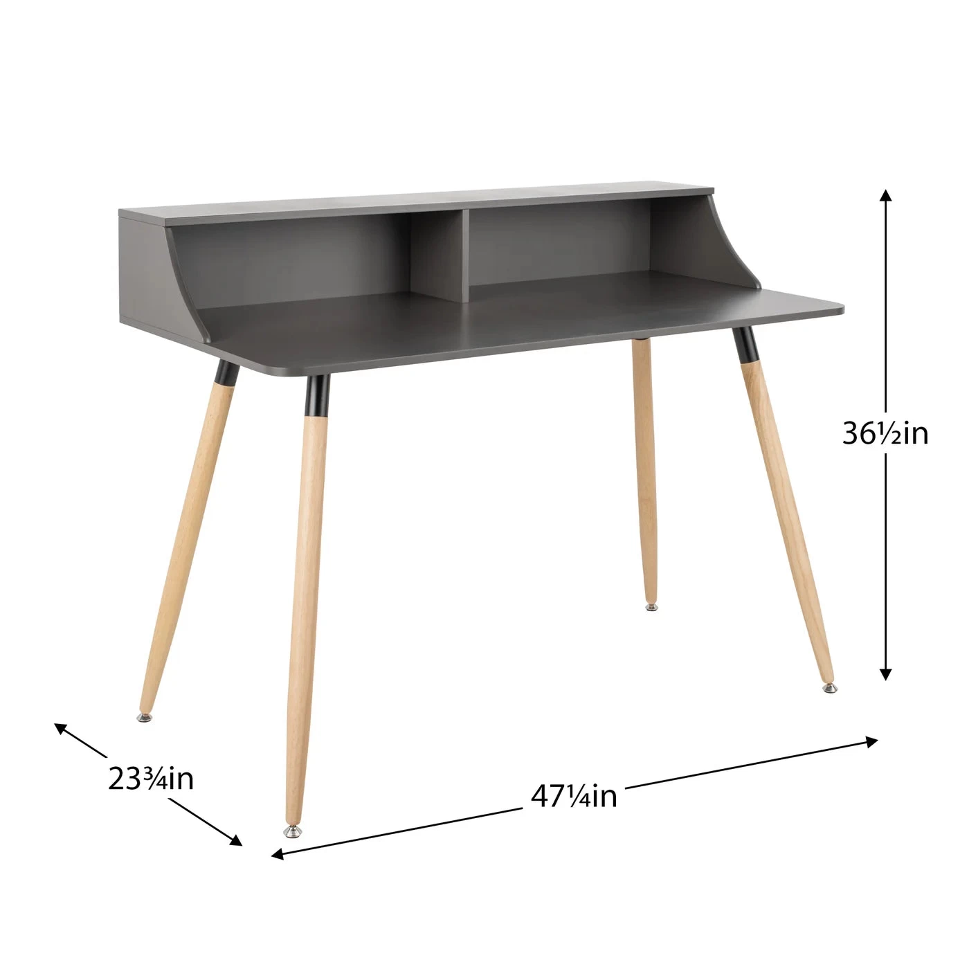 This modern desk features a generous workspace as well as a raised shelf for extra storage and easy organization. Featuring an MDF top with a contemporary white finish and wood legs, this desk works well in a home office environment or as a console or table in the entryway.