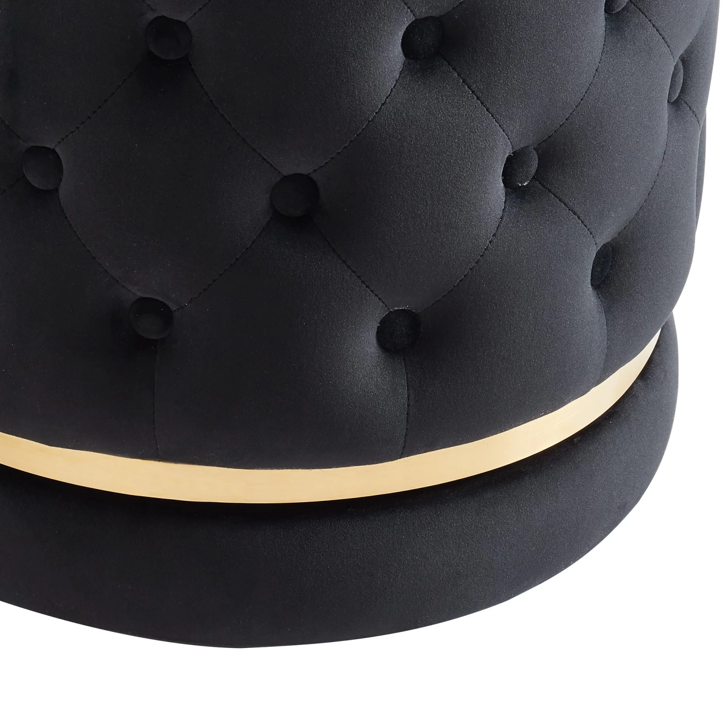 Make a big style statement with this gorgeous velvet-upholstered swivel ottoman. The diamond-patterned button tufting and the gold metal accent combine to create a piece that will elevate any space. The larger diameter means you can easily use as a side table by the sofa, a night table in the bedroom, an ottoman in the living room, or even as extra seating in the dining room. Medium seat firmness will lend hours of comfort or support for whatever your purpose.