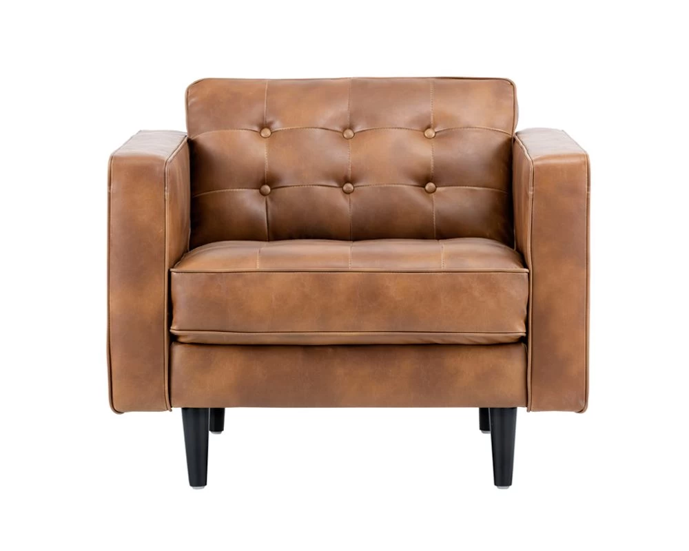 This attractive mid-century designed armchair from our 5West collection is a timeless addition to any space. Sits comfortably in our light and dark grey fabric, or in a vintage-look havana dark brown and tobacco tan faux leather with button tufting and piping detail. Finished with black tapered wood legs.