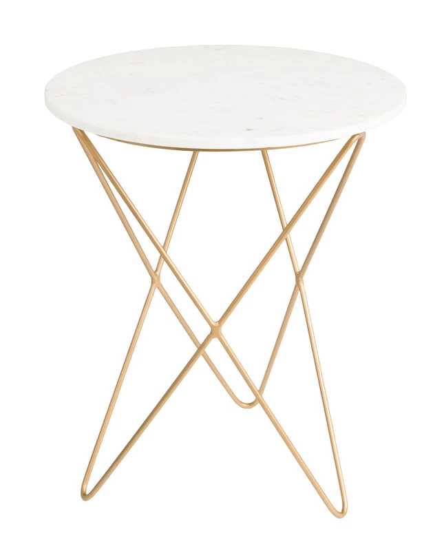 The Earth Wind Fire Marble Pedestal Side Table is a contemporary piece that features a marble top with a gold metal finish.Â