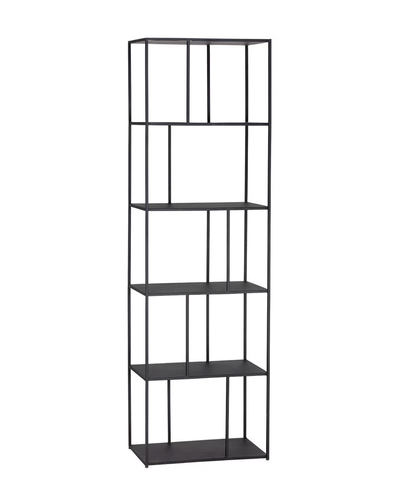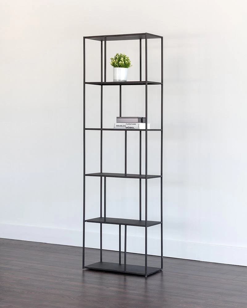 Add style and warmth to living and office spaces with this well-designed iron bookcase in a matte black finish. Can be placed in pairs or multiples for added impact and functionality. Also available in a larger size. Anti-tipping kit included.