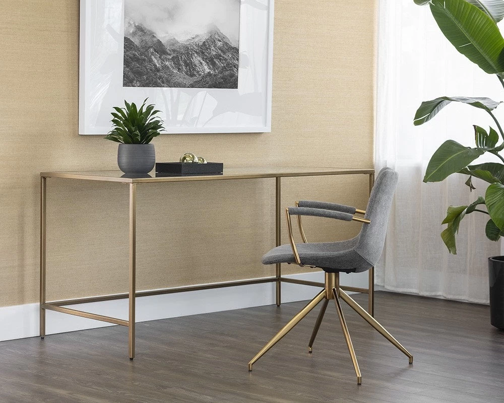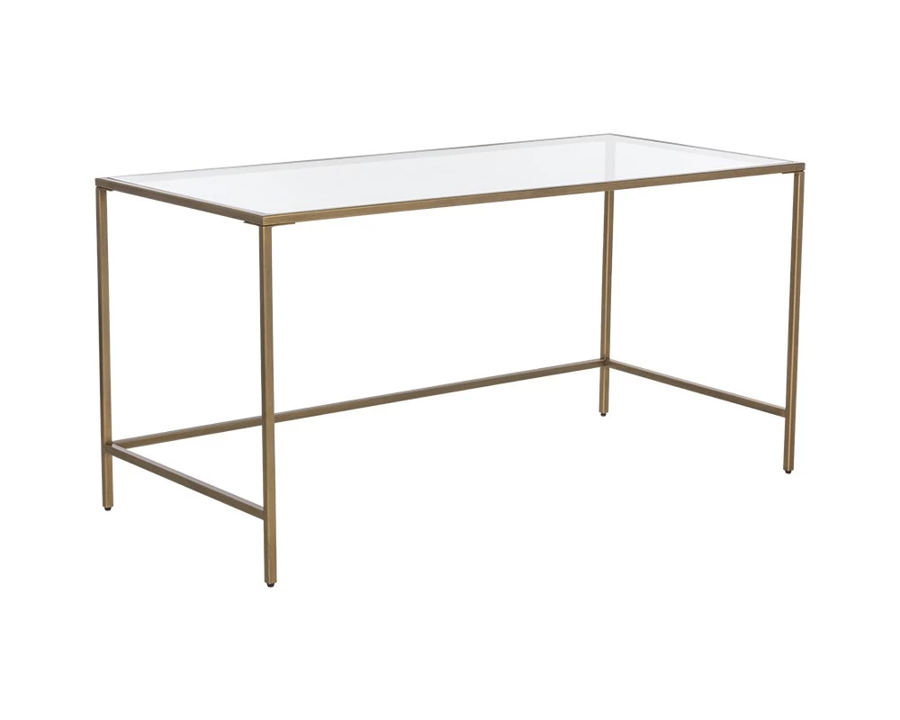 The Eiffel Desk features Clear Tempered Glass with Adjustable Levers. Iron base finished in Antique Brass.Â