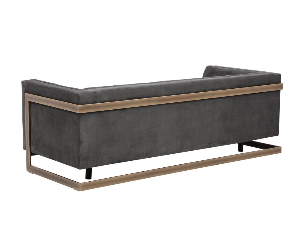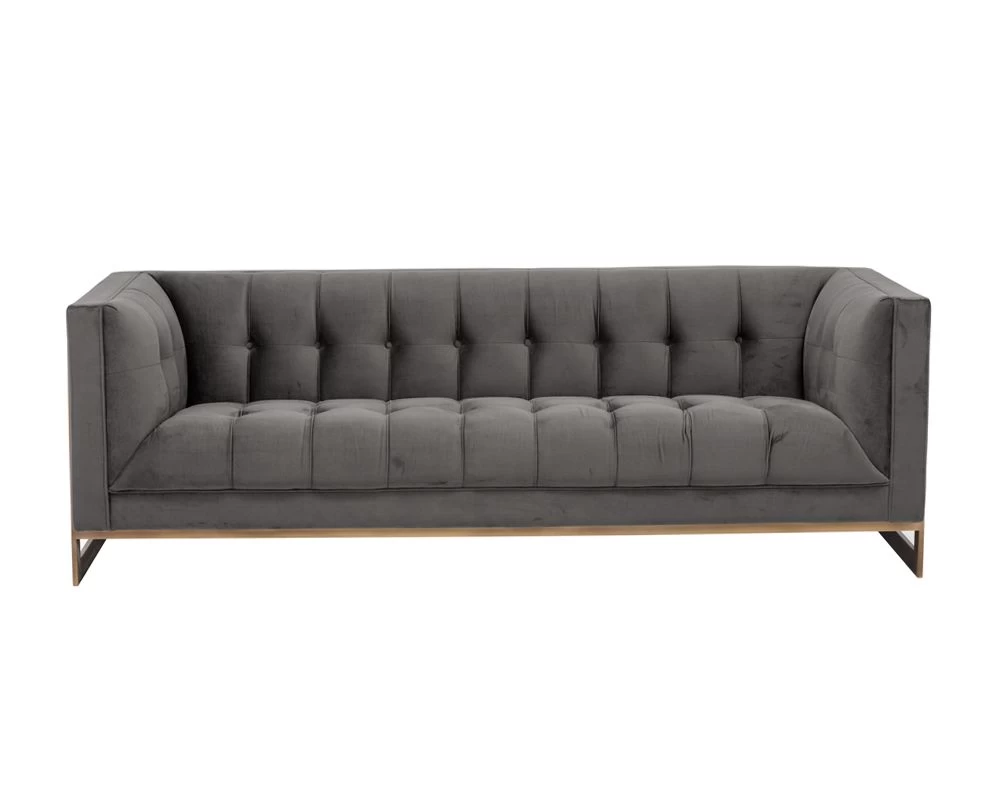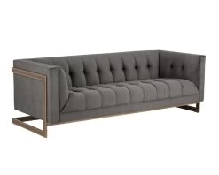The streamlined design of this sofa is bold yet refined. Features beautiful deep button tufting, piping, and an exposed rustic bronze steel frame. Stocked in pimlico pebble, pimlico prosecco and abbington black fabric. Perfect for residential and commercial settings.