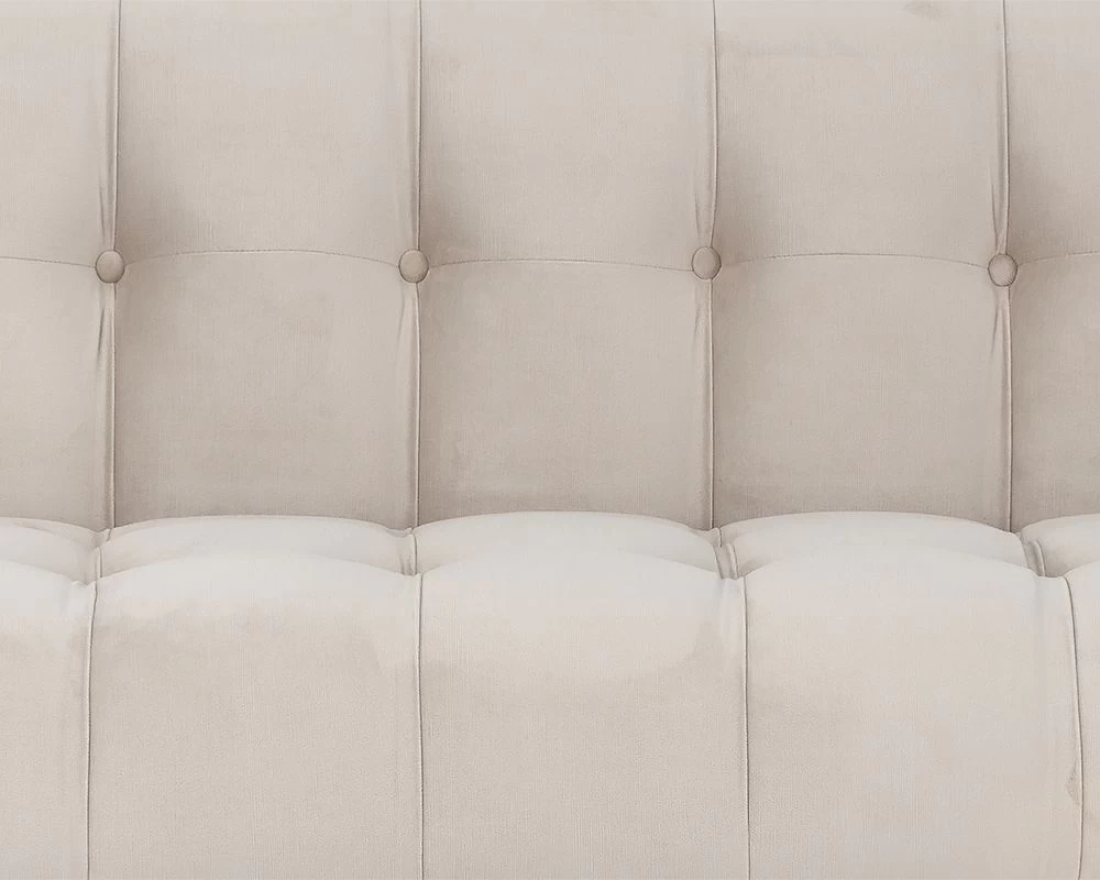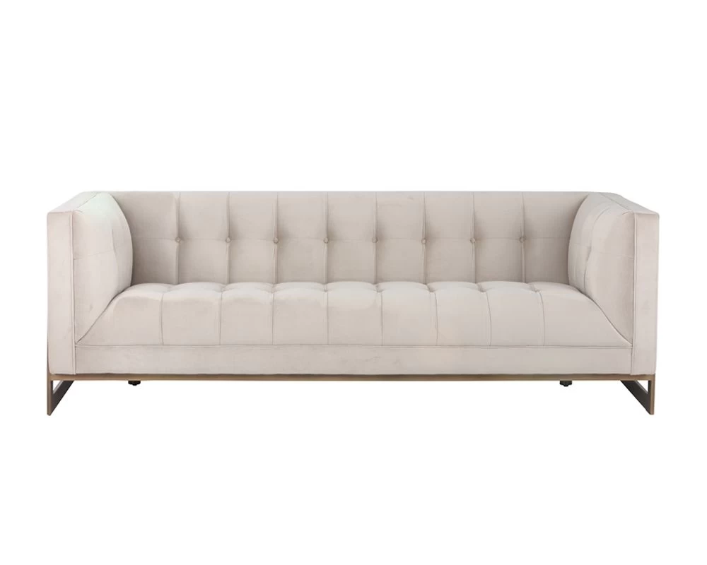 The streamlined design of this sofa is bold yet refined. Features beautiful deep button tufting, piping, and an exposed rustic bronze steel frame. Stocked in pimlico pebble, pimlico prosecco and abbington black fabric. Perfect for residential and commercial settings.