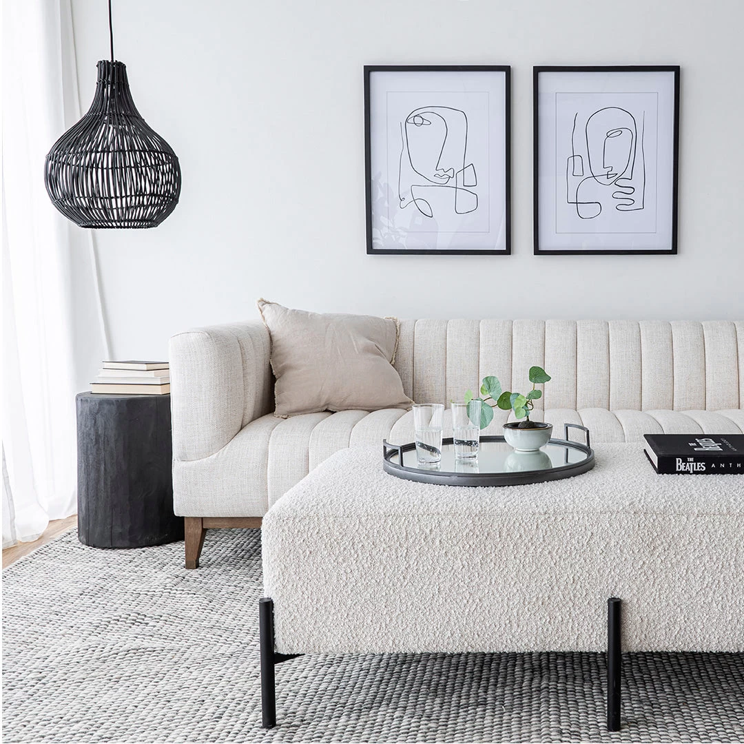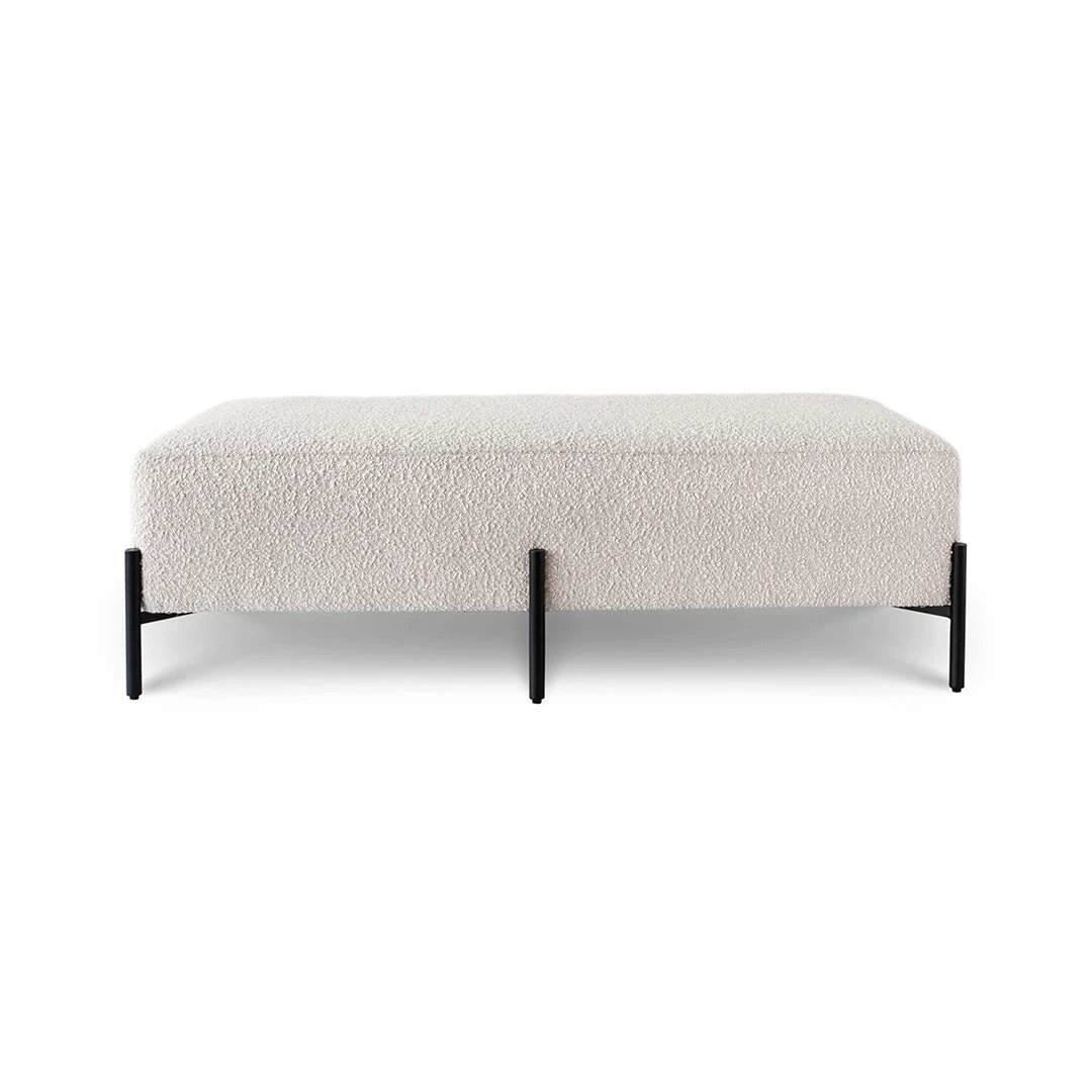 Minimal, elegant and versatile, our Elk Ottoman is stunning in off-white boucle. Modern and sophisticated, Elk is everything you want in a room. At 54” wide and 17” high, it’s perfect as a coffee table, as a bench for extra seating and looks marvelous at the foot of a bed or under a window as a cozy nook. This generously padded ottoman sits on 6 slender matte black metal legs.