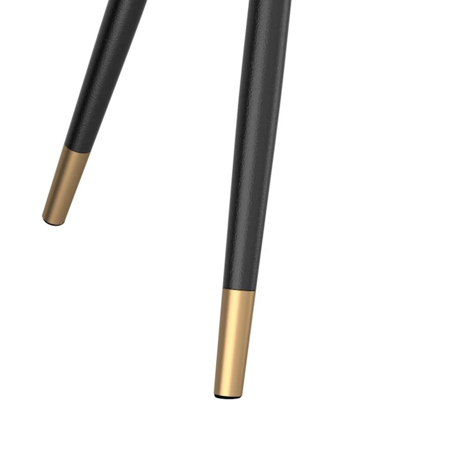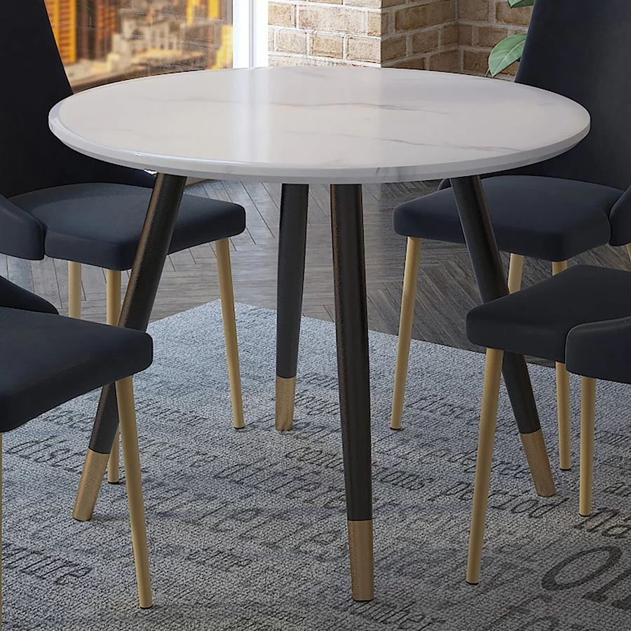 The Emery Round Dining Table is the perfect combination of style and sophistication. Its clean-lined, contemporary form is elevated to couture status by the A-line black metal legs, finished with an aged gold accent. The reverse bevelled table top is artfully constructed from MDF with a marble-look paper veneer for a luxurious look. Mix and match with a variety of chair styles to add a designer feel to your space.