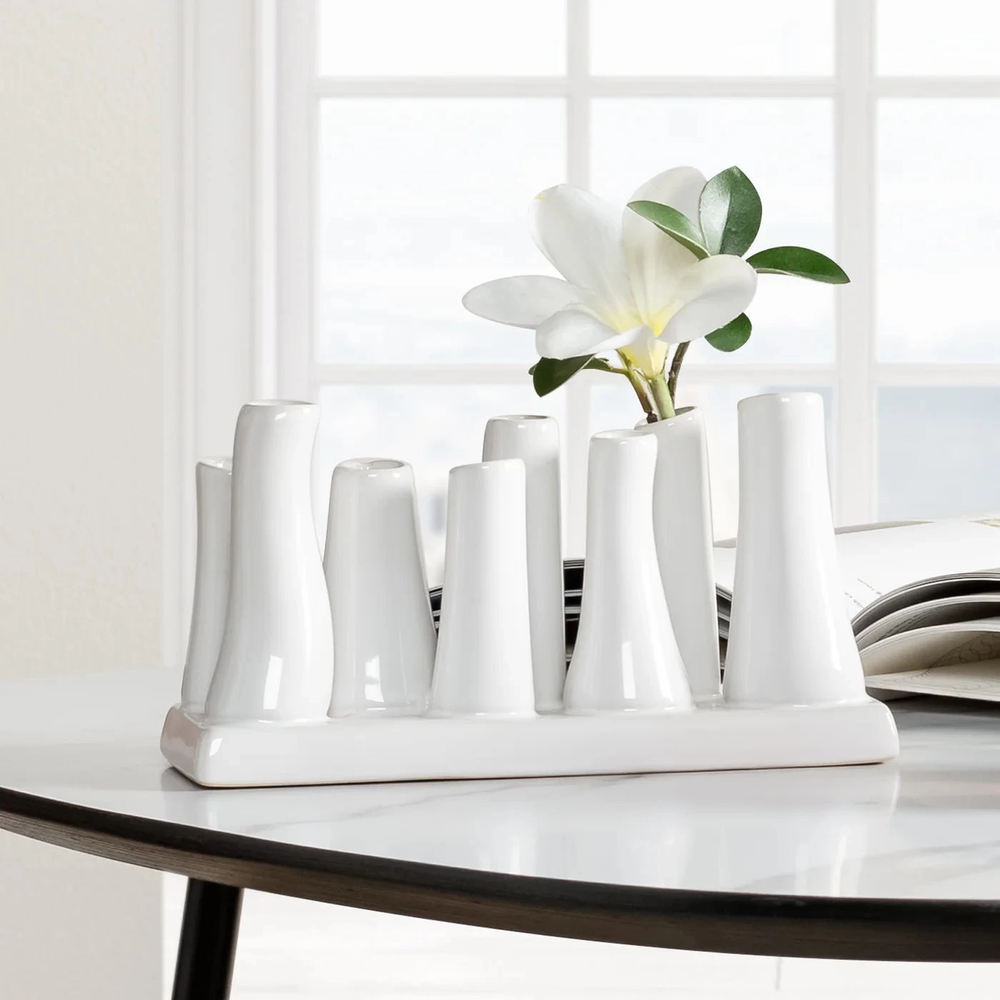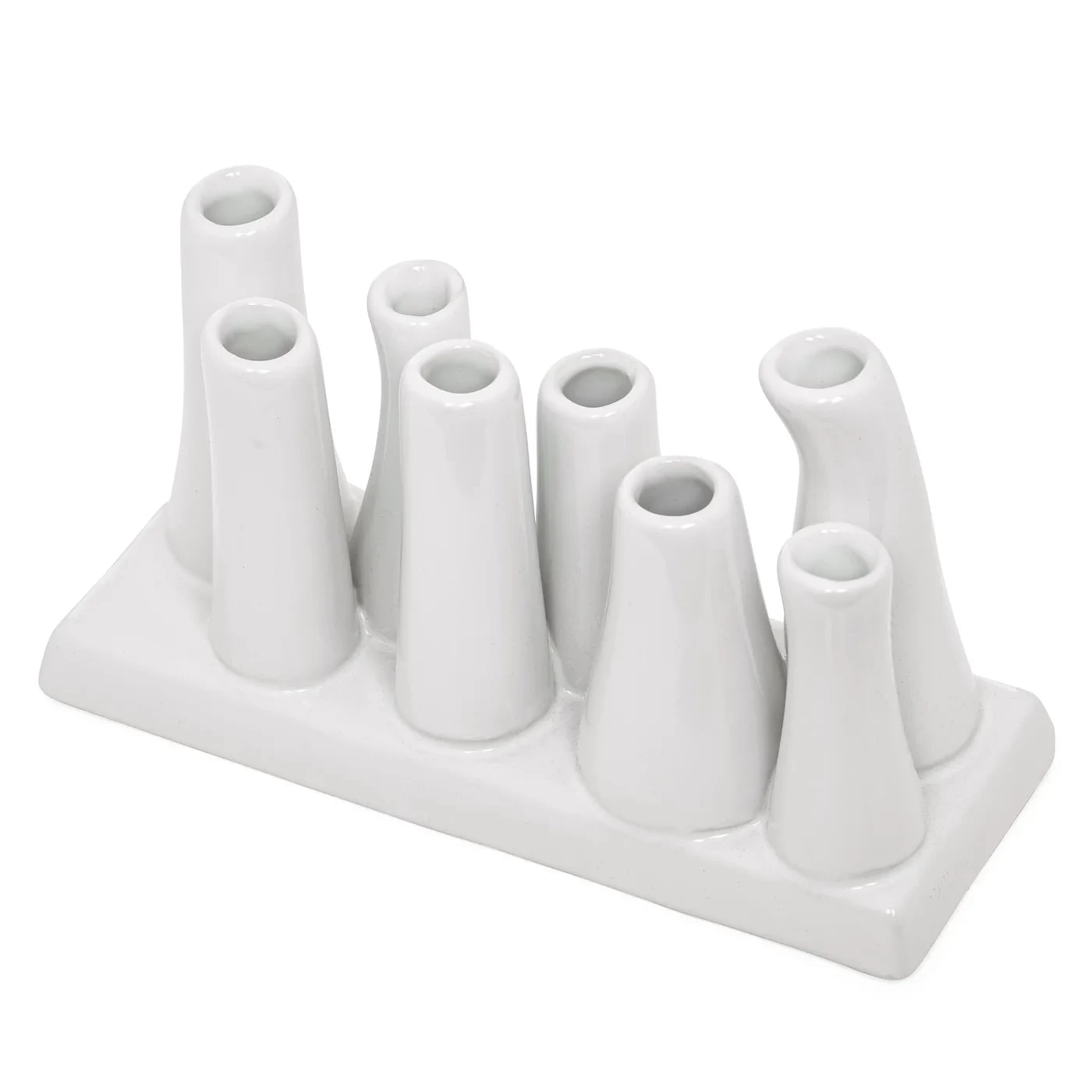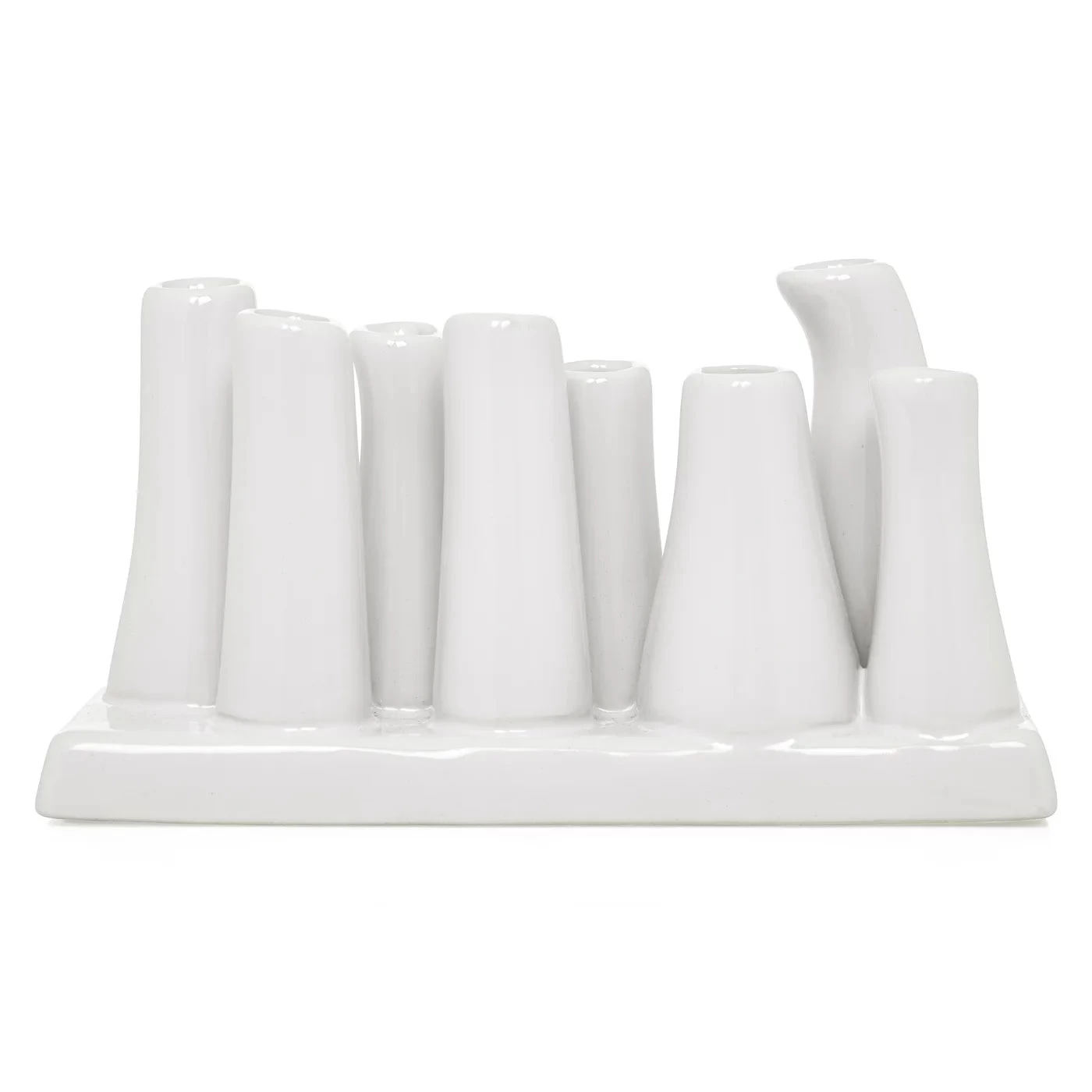 The Eva Rectangle White Ceramic 8 Tube Multi Bud Vase is perfect for creating an exquisite, sophisticated arrangement with a flare for the unique. Its ceramic construction allows you to easily drop in simple blooms, twigs, or leaves for an eye-catching display, instantly transforming any shelf or table in a luxurious art piece. Plants and florals not included.