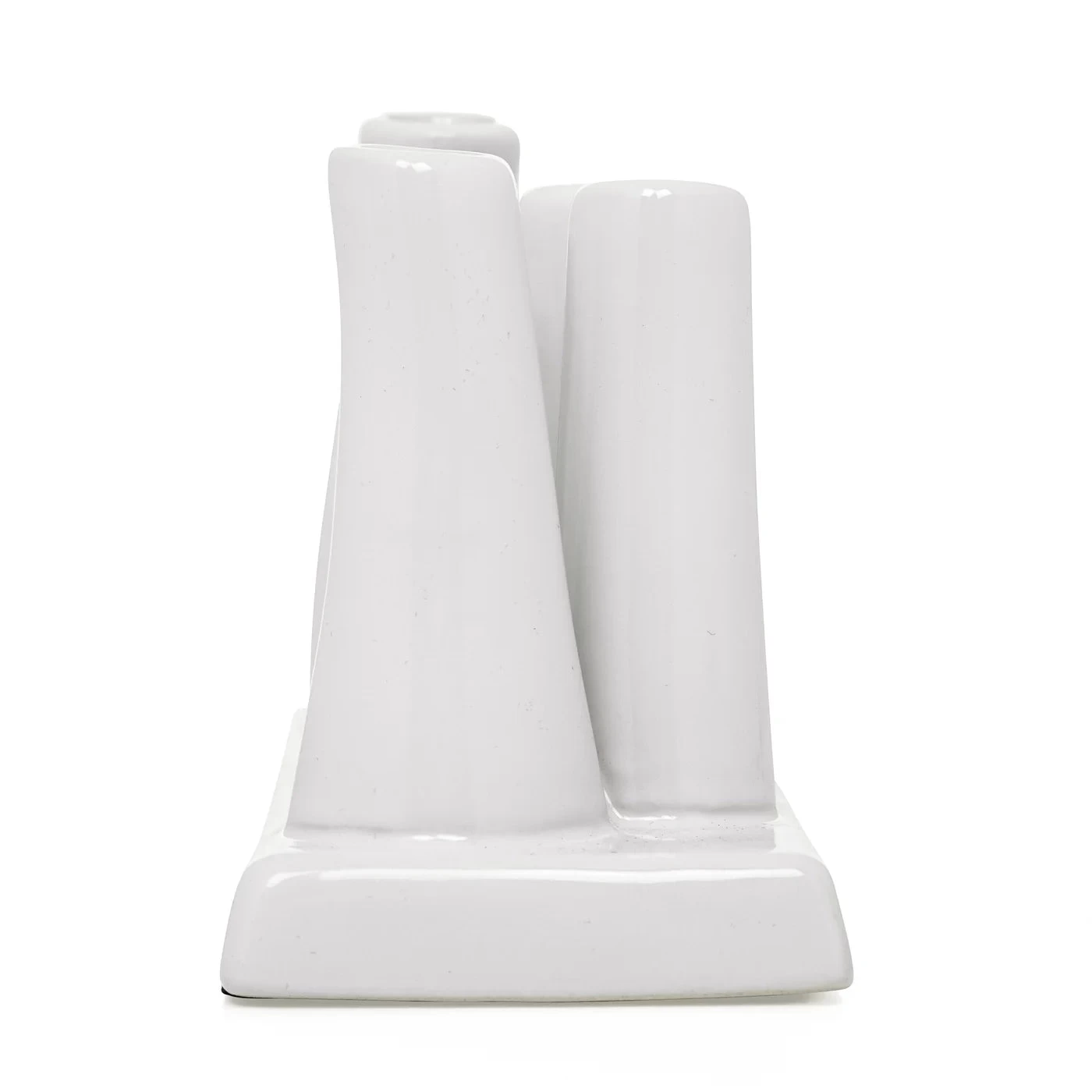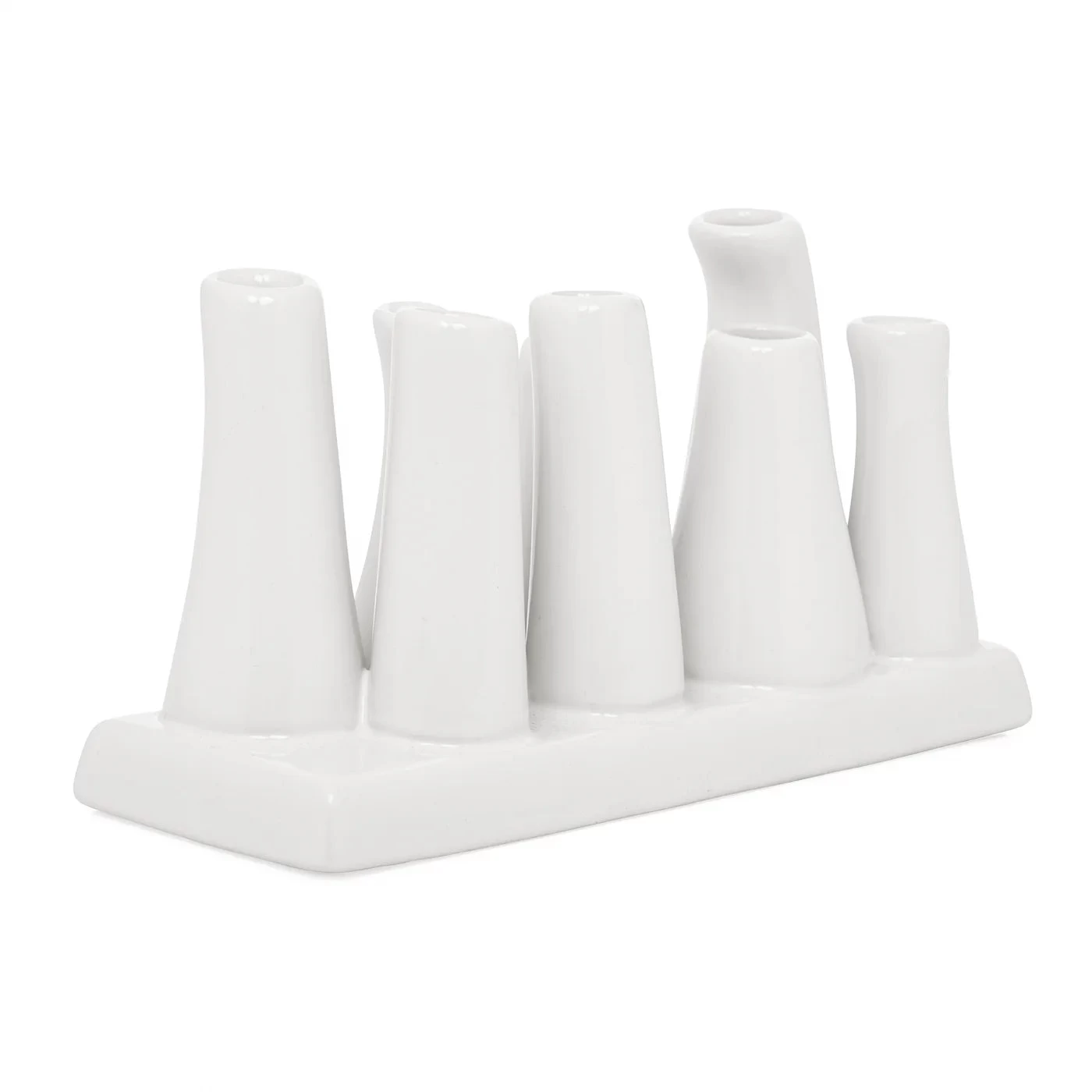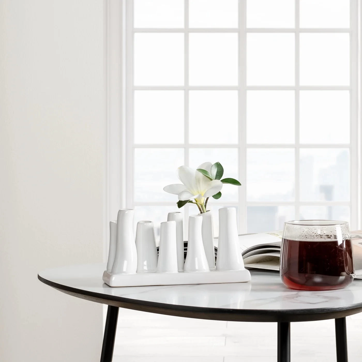 The Eva Rectangle White Ceramic 8 Tube Multi Bud Vase is perfect for creating an exquisite, sophisticated arrangement with a flare for the unique. Its ceramic construction allows you to easily drop in simple blooms, twigs, or leaves for an eye-catching display, instantly transforming any shelf or table in a luxurious art piece. Plants and florals not included.