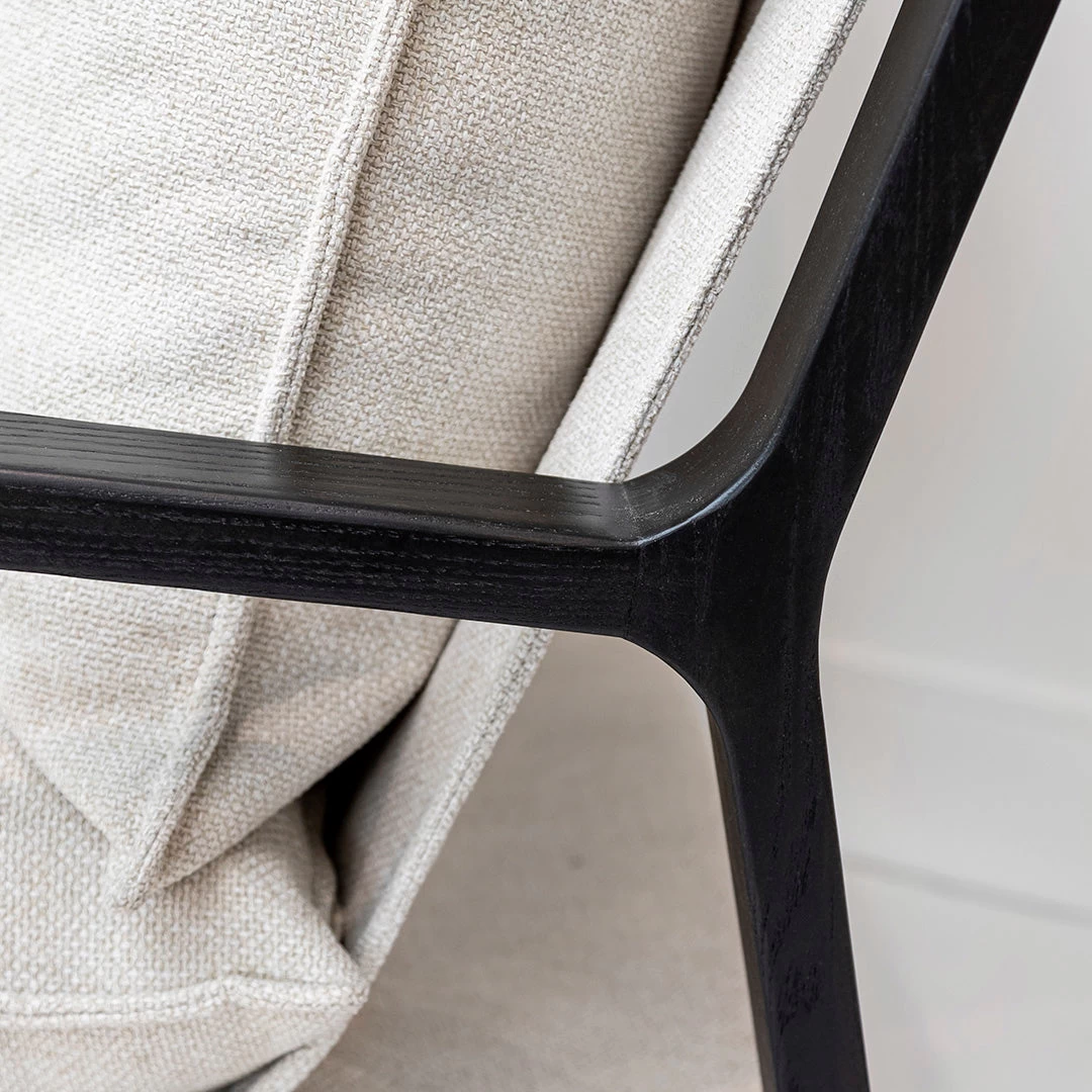 Comfort has a new name, and its most definitely Finn! This low sling chair with an exposed black washed wood frame and thick plush cream cushions quietly shouts “relax!” Hip and stylish, this throwback design is comfortable and trendy all in one.