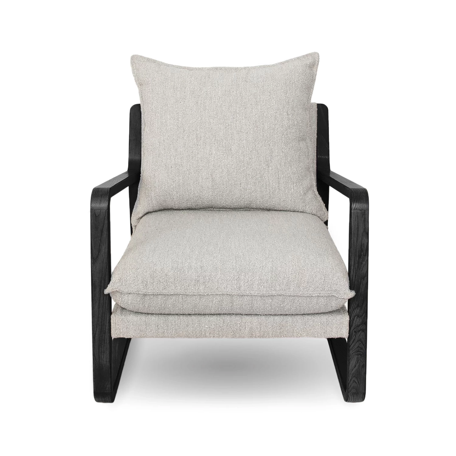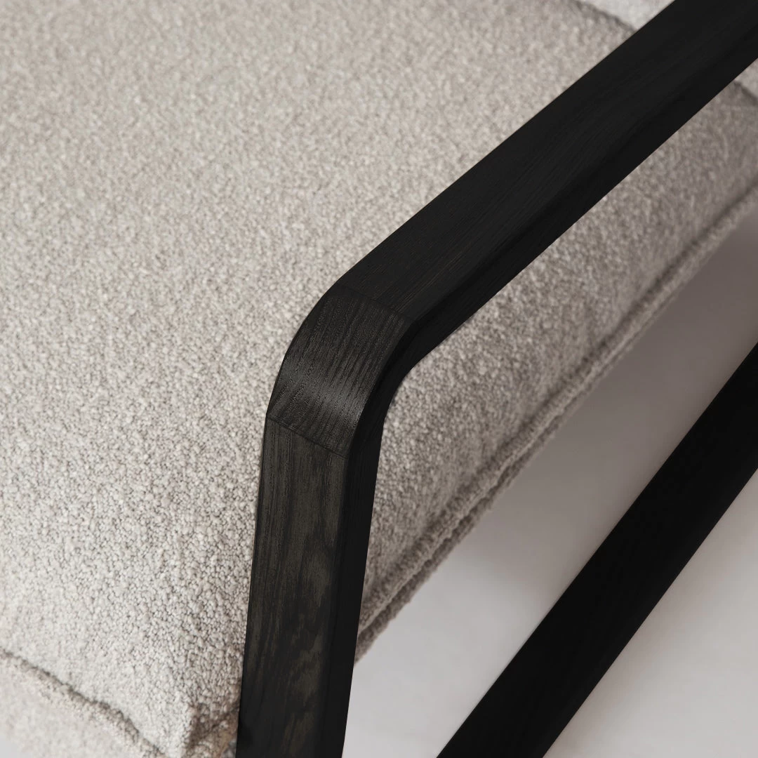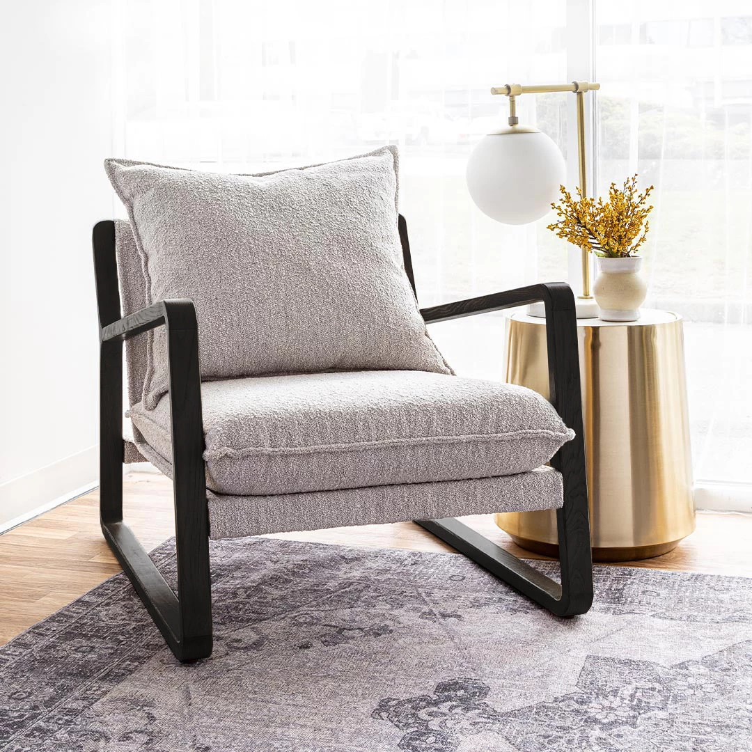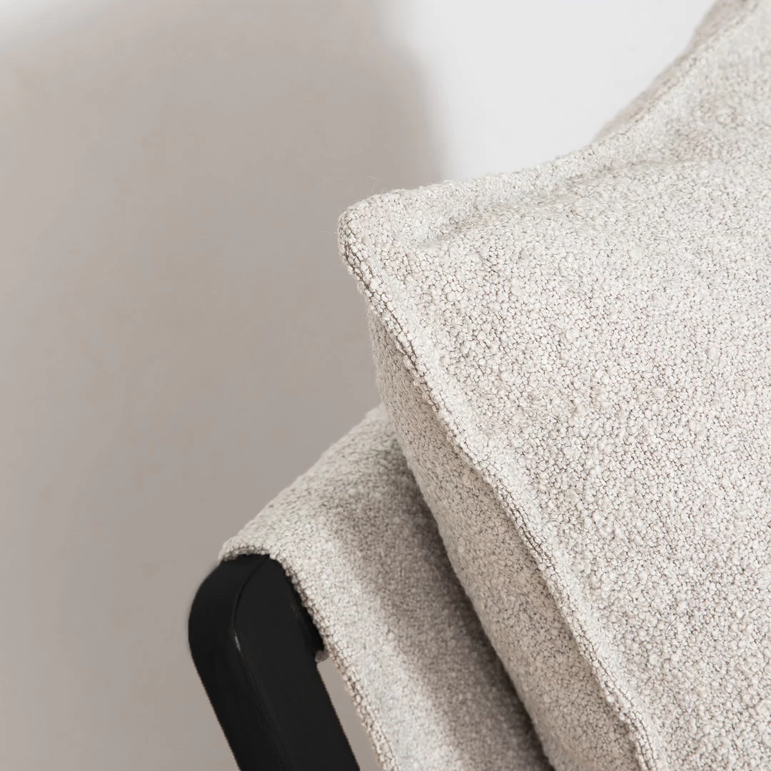 This chair is an instant classic. Our Finn mid-mod-inspired sling chair in fabulous and cozy boucle fabric was inspired by iconic retro design. The exposed oak colour wood frame and thick plush bouclé cushions create comfort and style like no other. These chairs look great in pairs to create a warm and welcoming space in living rooms, bedrooms and family rooms.