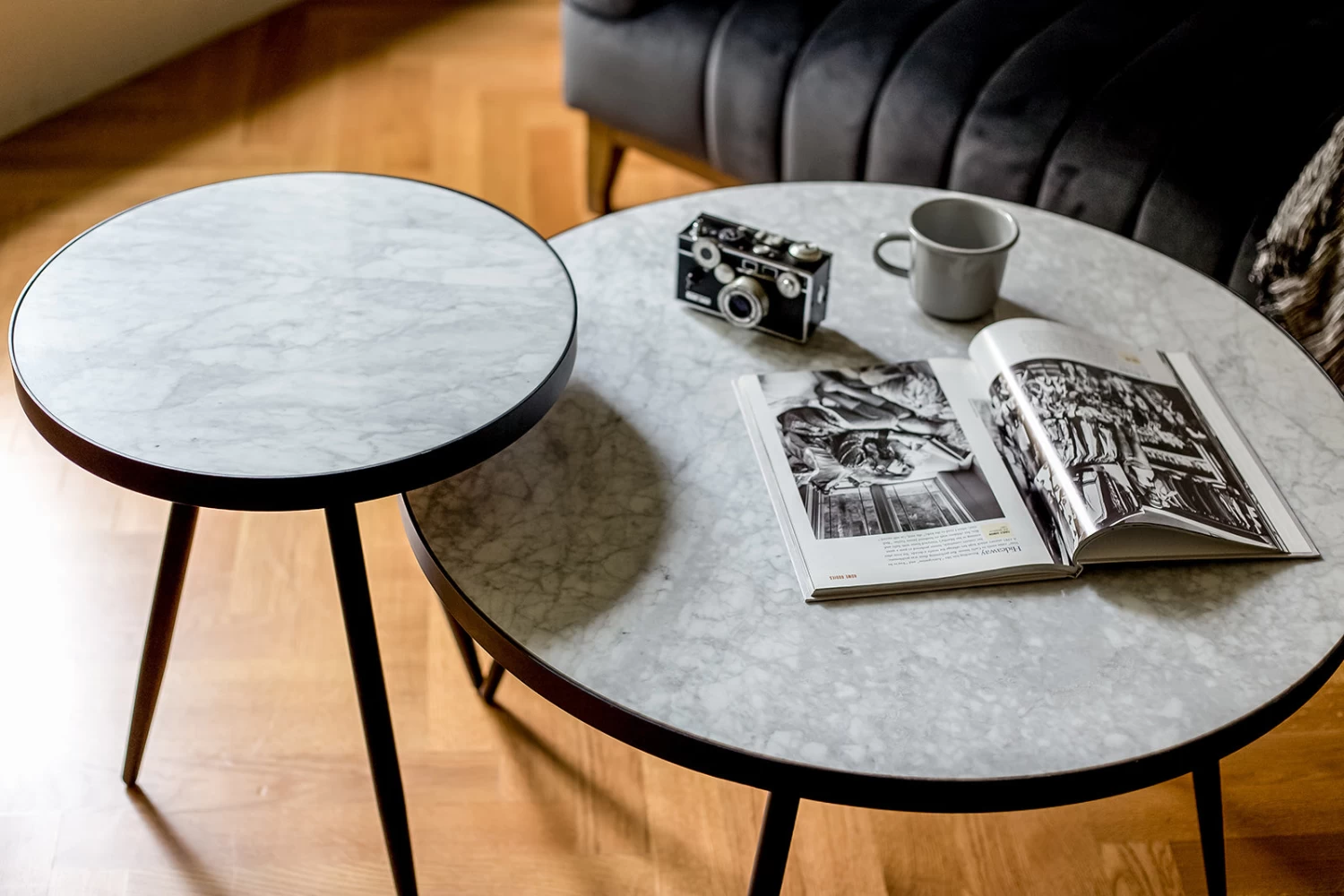 Low profile and sleek, this coffee table featuring a white marble top and gorgeous black base, adds dramatic vibes wherever it lands. Inspired by the best of mid-mod design, our black-marble Florence coffee table is stunning in timeless Carrara marble. With a 32” diameter and at 18” high, this coffee table looks amazing in living and entertainment rooms.
