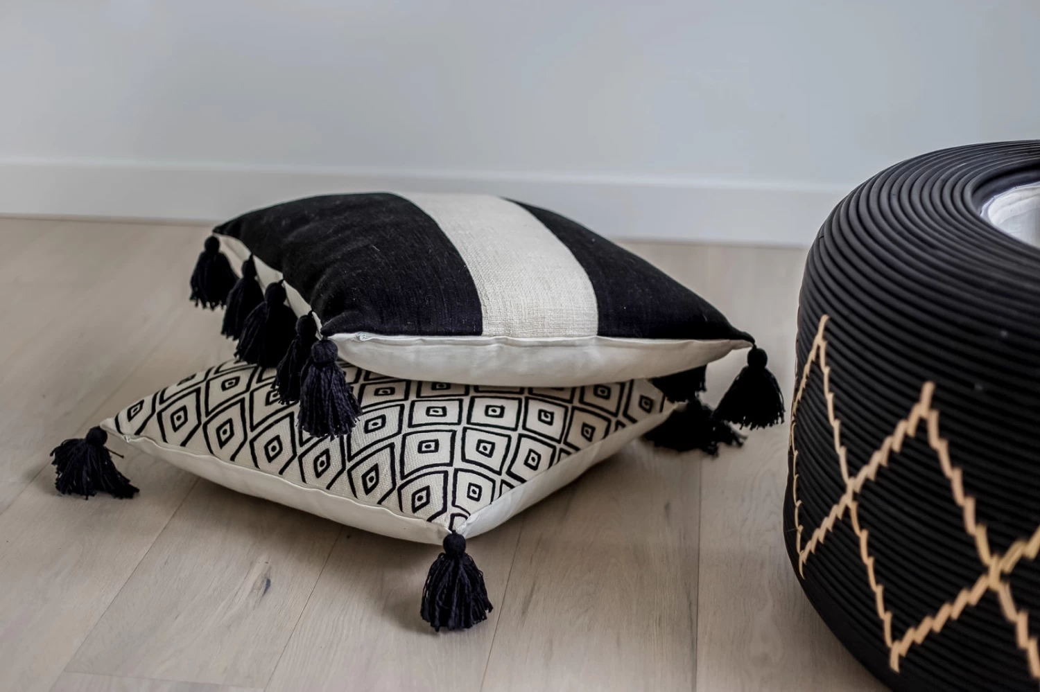 Just say no to boring design. Our Freedom cushions in 100% cream cotton fabric are fun and flirty with tassels, fringe and bold black stripes.