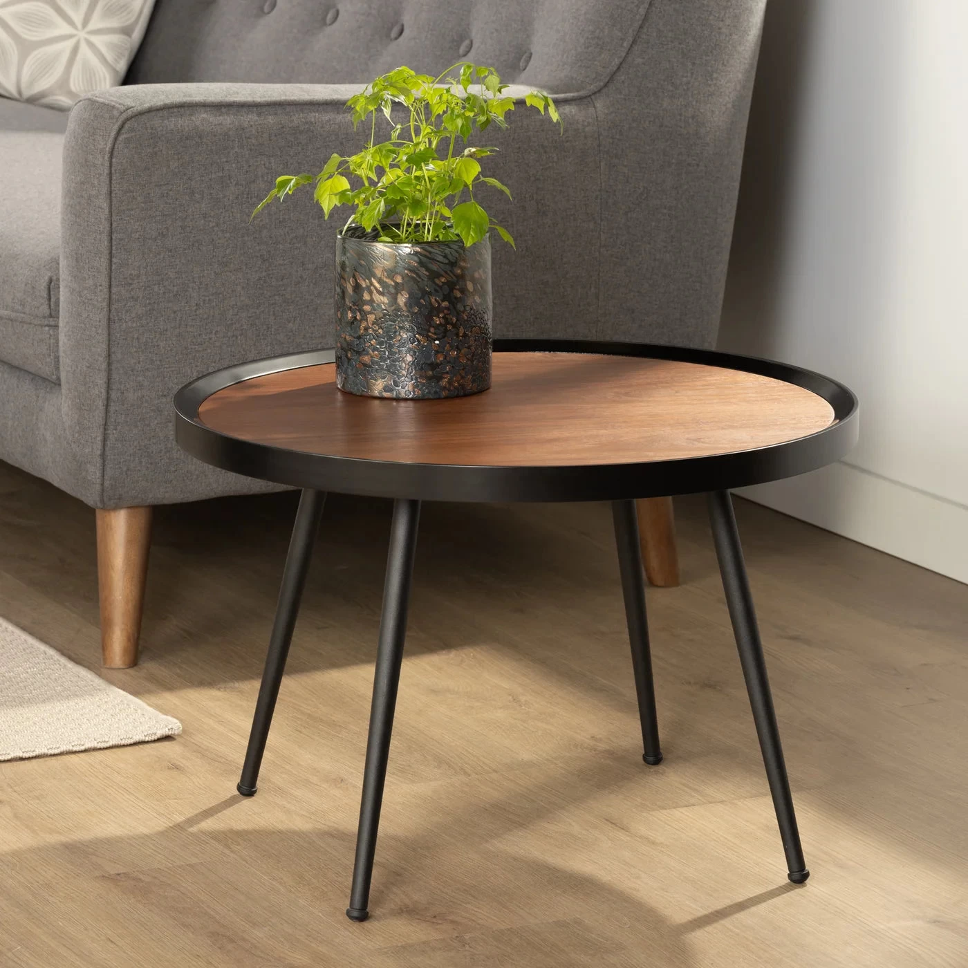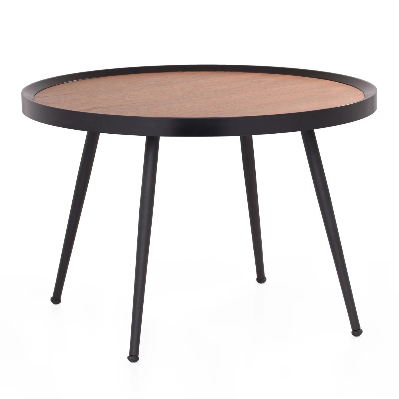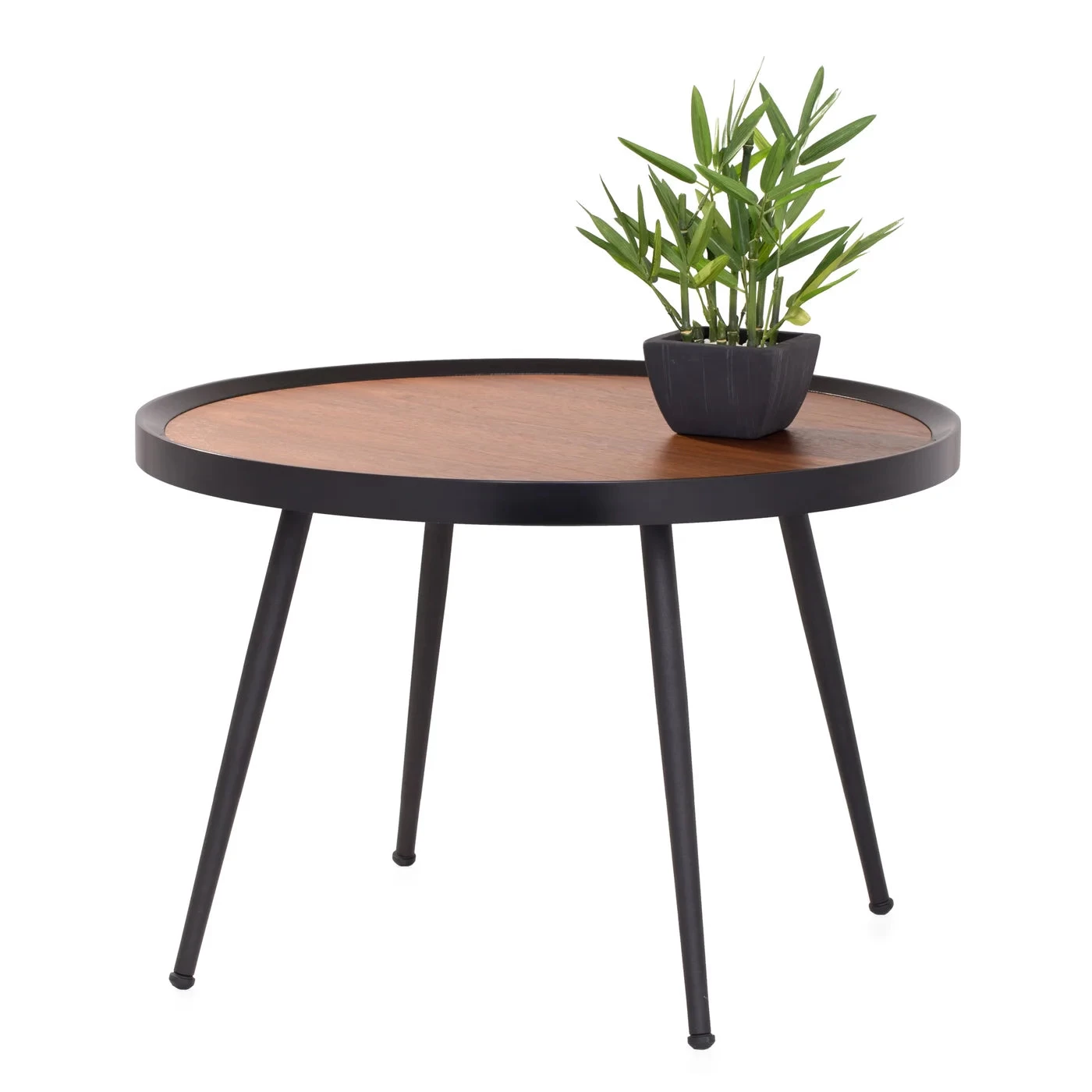 This table pays homage to Mid-Century Modern design with a walnut veneer MDF surface and powder coated black metal legs. Ideal as an accent table or as a small coffee table.