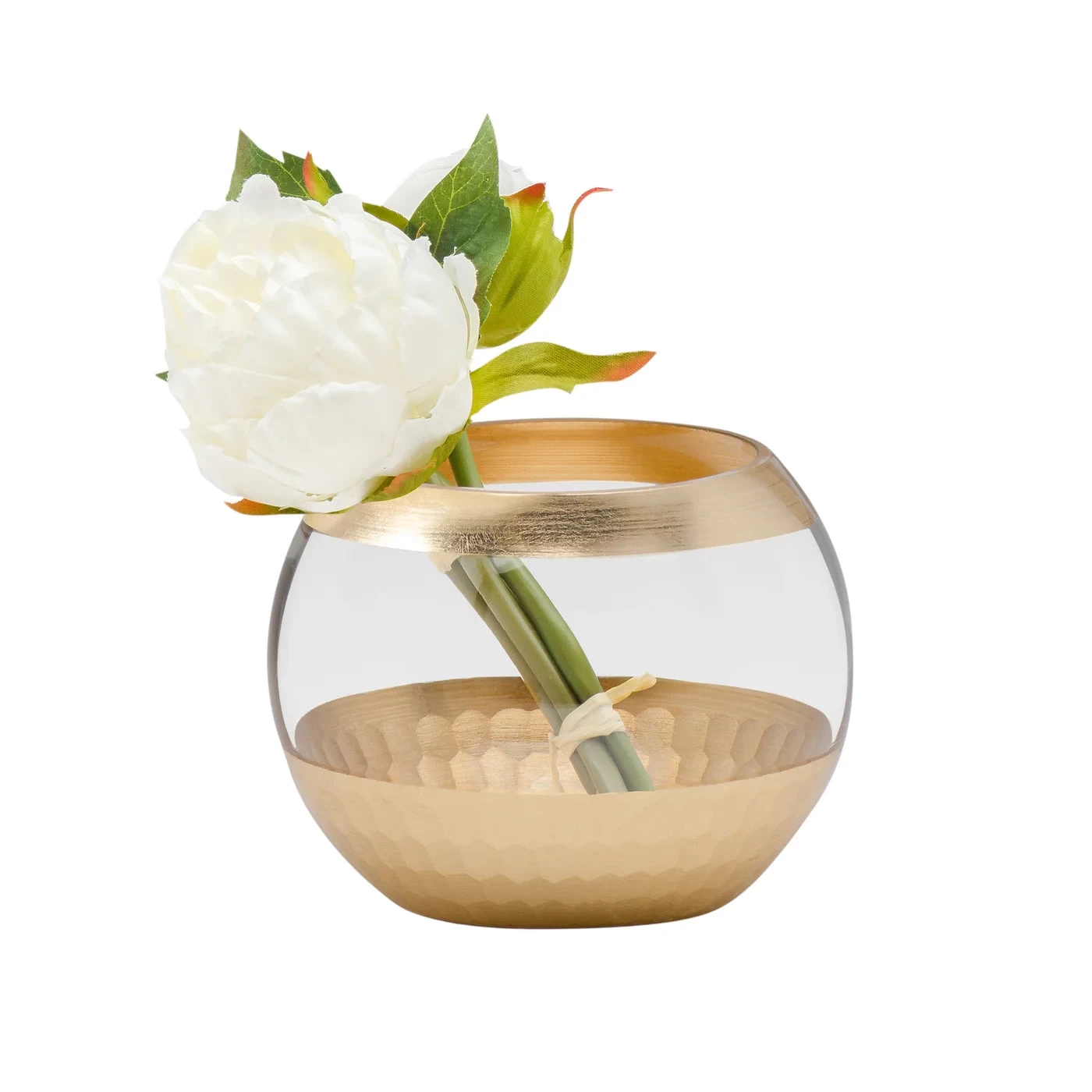 Unlock opulent style with this chic Gold Trim Facet Cut Glass 5dx3.5″ Ball Vase. The round shape adds a timeless touch to your decor, while the faceted gold base and golden trim serve as a luxurious finishing touch, adding an air of exclusivity to your interior design. An ideal choice for a small bouquet or as a tealight holder, this piece is sure to bring a touch of grandeur to your home.