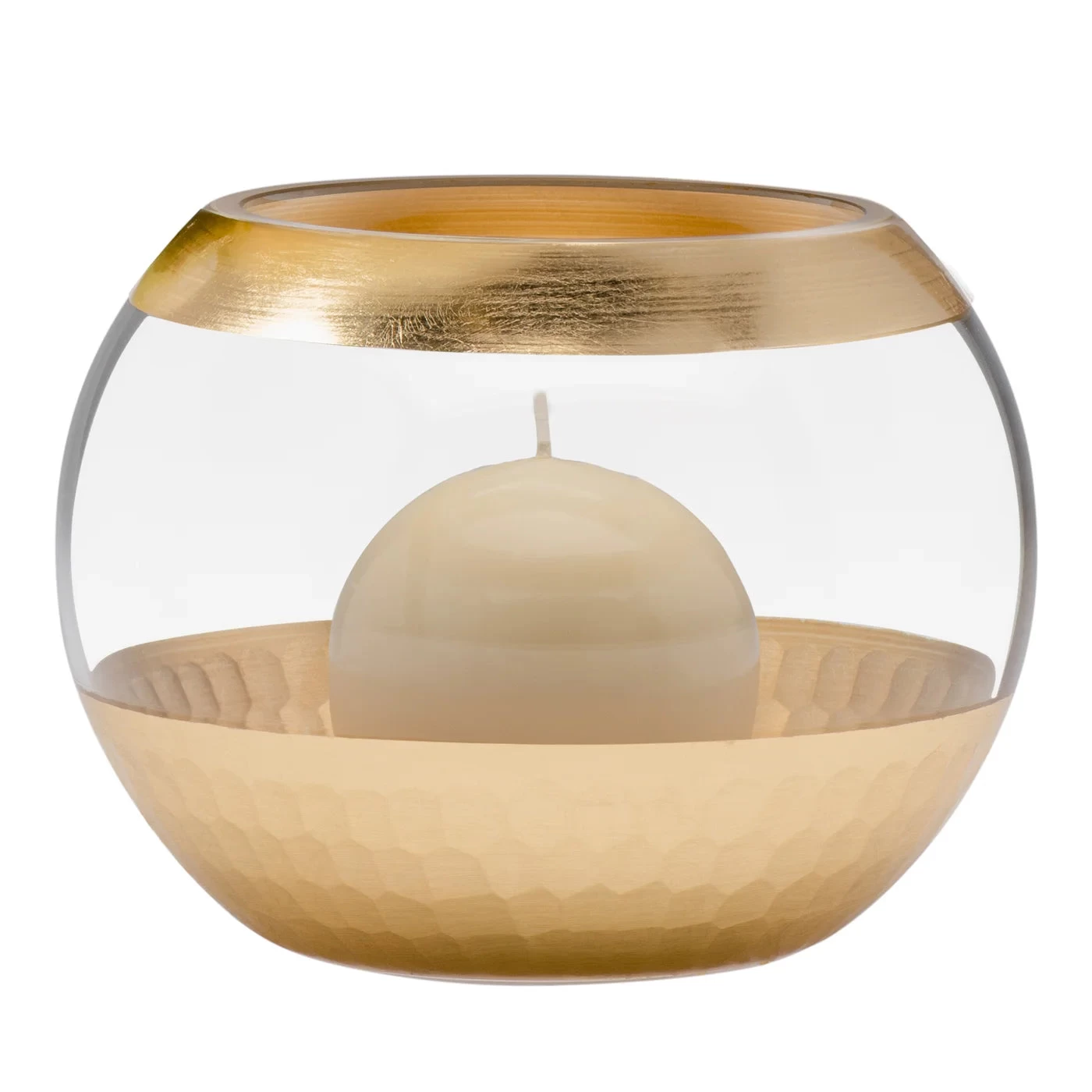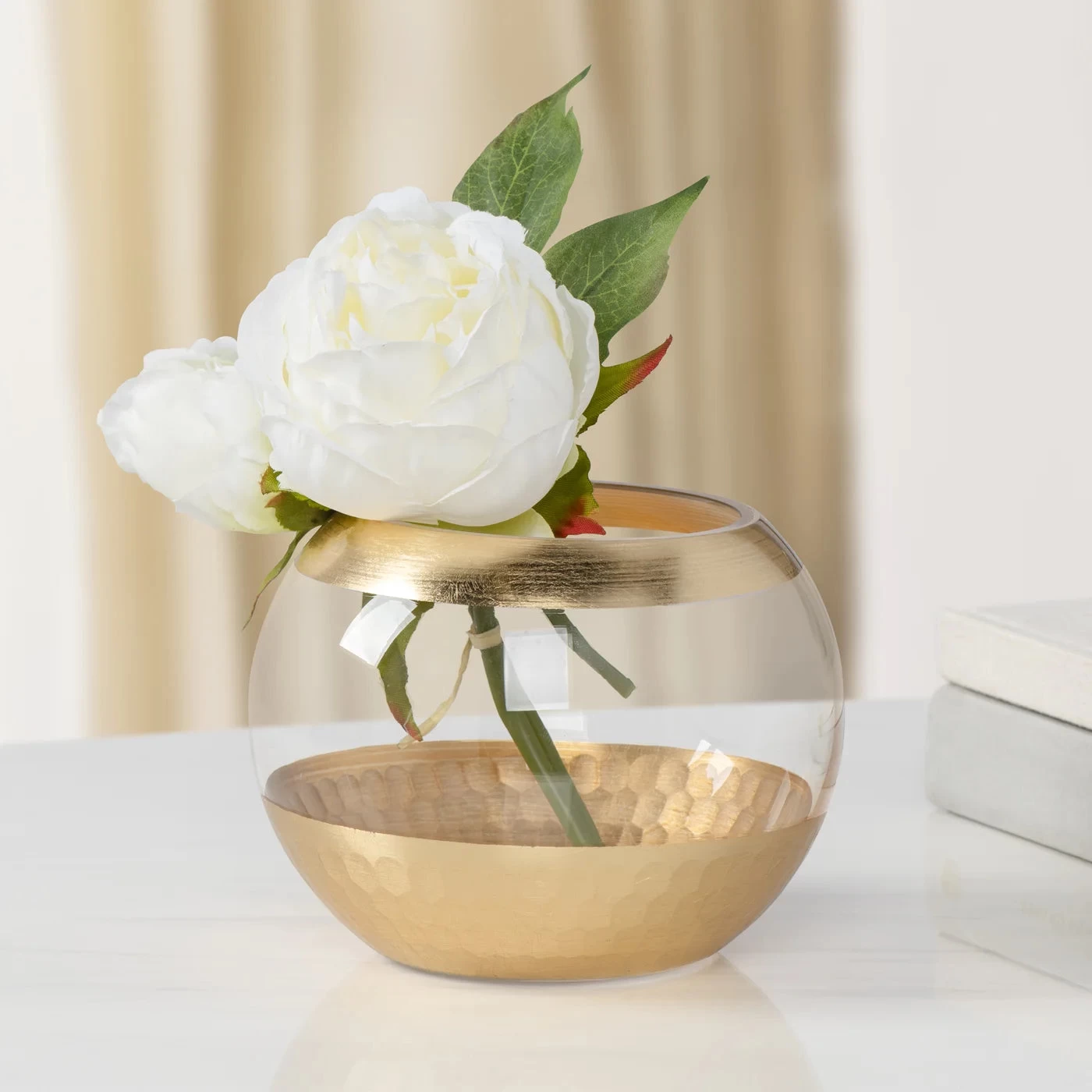 This glass ball vase, featuring a faceted gold base and gold trim, provides an exquisite touch of sophistication and elegance to any interior. The classic round shape and 4.5″ diameter make it perfect for displaying a small bouquet to brighten up your living space. Alternatively, you can switch things up by filling the vase with tealight candles for a subtle glow.