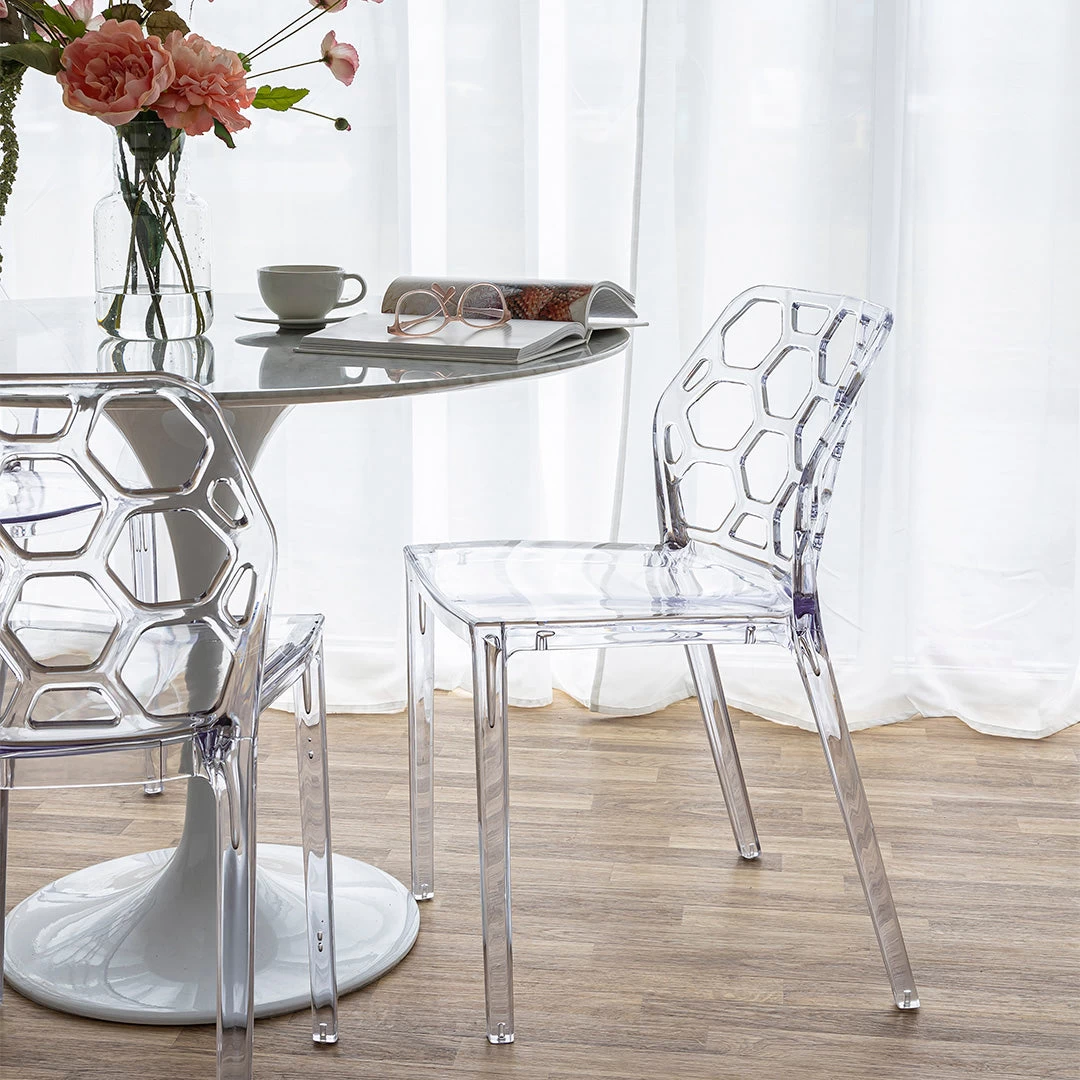 The choice is clear, we’re gushing over these stackable, clear acrylic chairs with a honeycomb pattern back. Extremely versatile, our Honey Chairs feature a short back and transparent material that will help make any room look bigger.