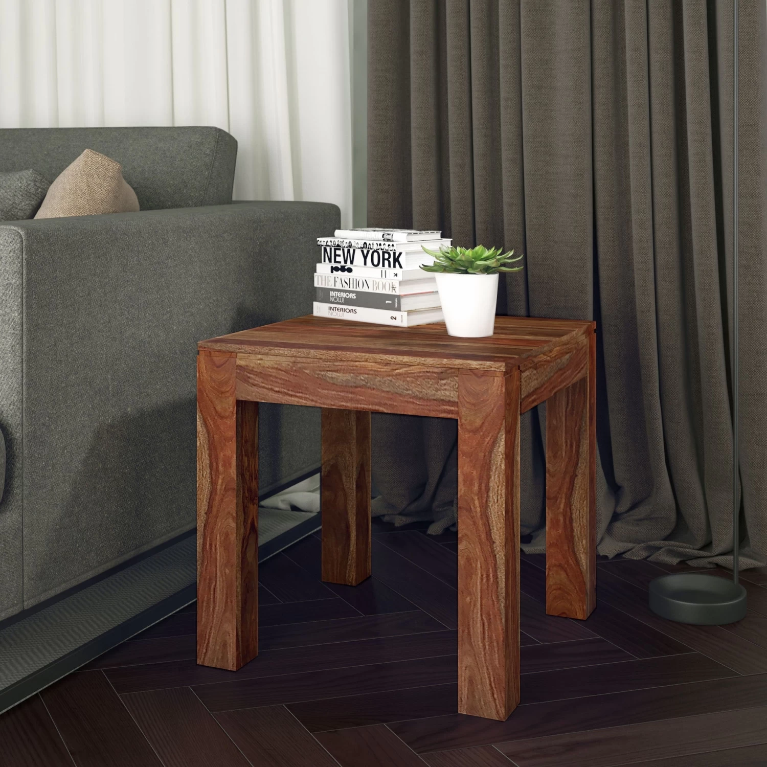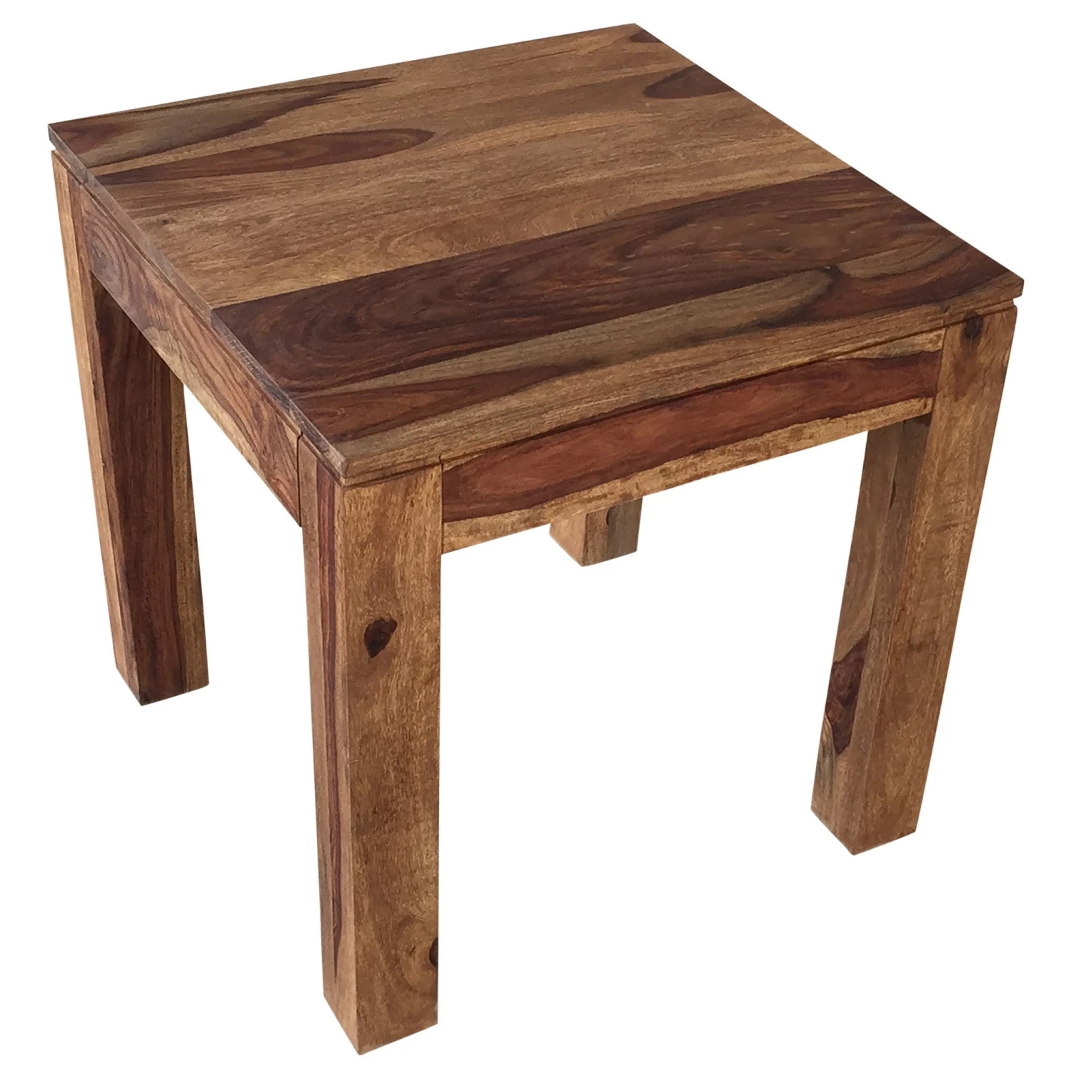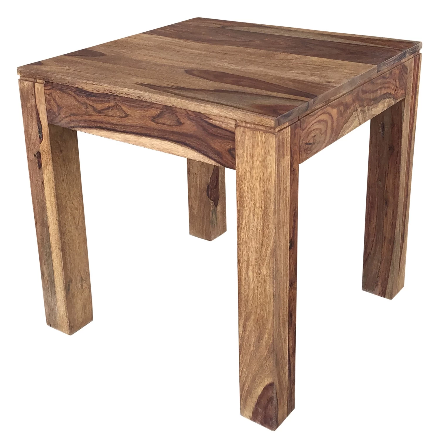 The natural beauty of Indian Sheesham wood shows in this solid wood, hand-crafted table. The clean-line design combined with the raw, hand-finished look of the wood create a perfect example of rustic modern design. Easy to dress up or dress down for a formal or casual living space. Experience piece-of-mind knowing that this table is made with “green” materials. Wood characteristics include; mineral deposits, irregular grain patterns, unusual knots, seasonal cracks and splitting. Any of these may occur with changes in humidity and other severe climate conditions and are inherent in the character of the product.Â