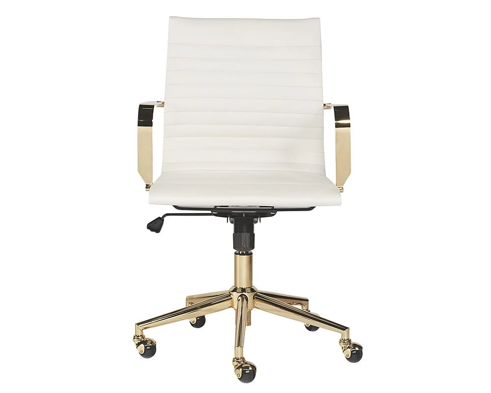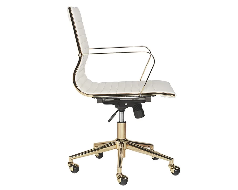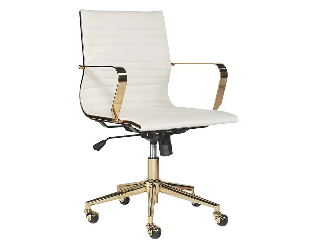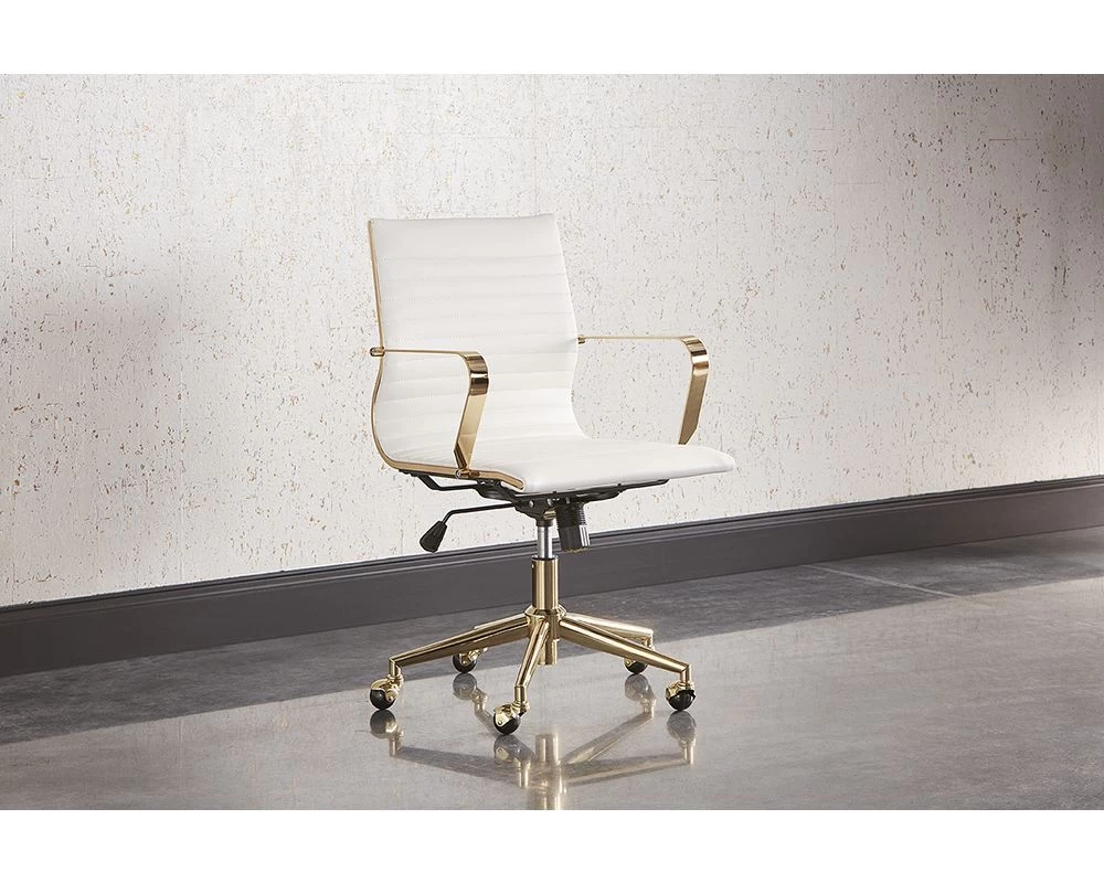 This office chair from our Urban Unity collection offers glamorous femininity. Features horizontal channel tufting on the seatback with a stunning polished gold steel frame and castors for mobility. Stocked in white or black faux leather.