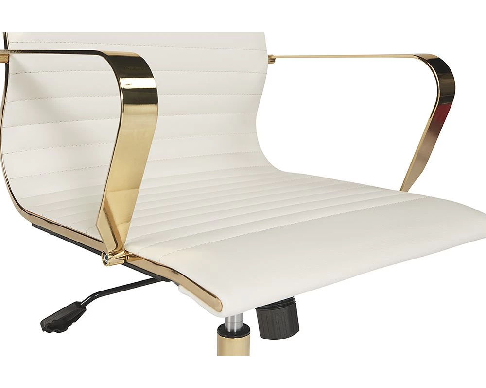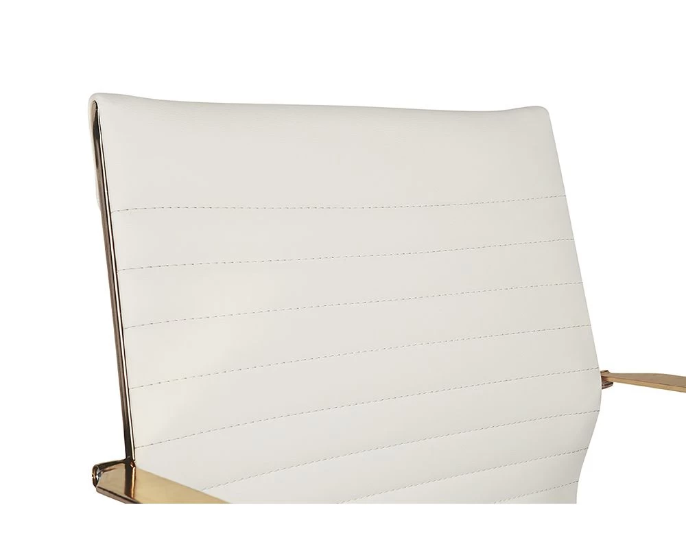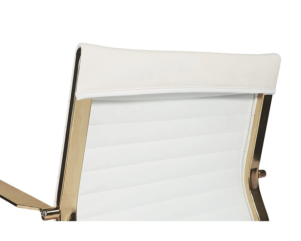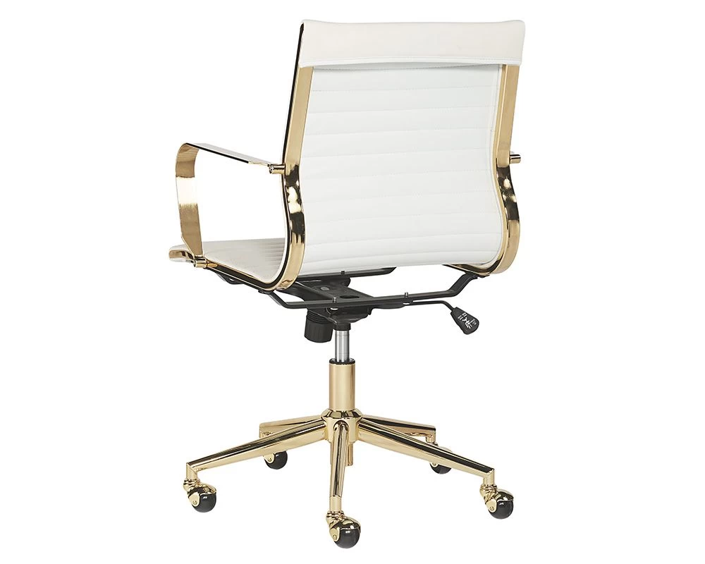 This office chair from our Urban Unity collection offers glamorous femininity. Features horizontal channel tufting on the seatback with a stunning polished gold steel frame and castors for mobility. Stocked in white or black faux leather.