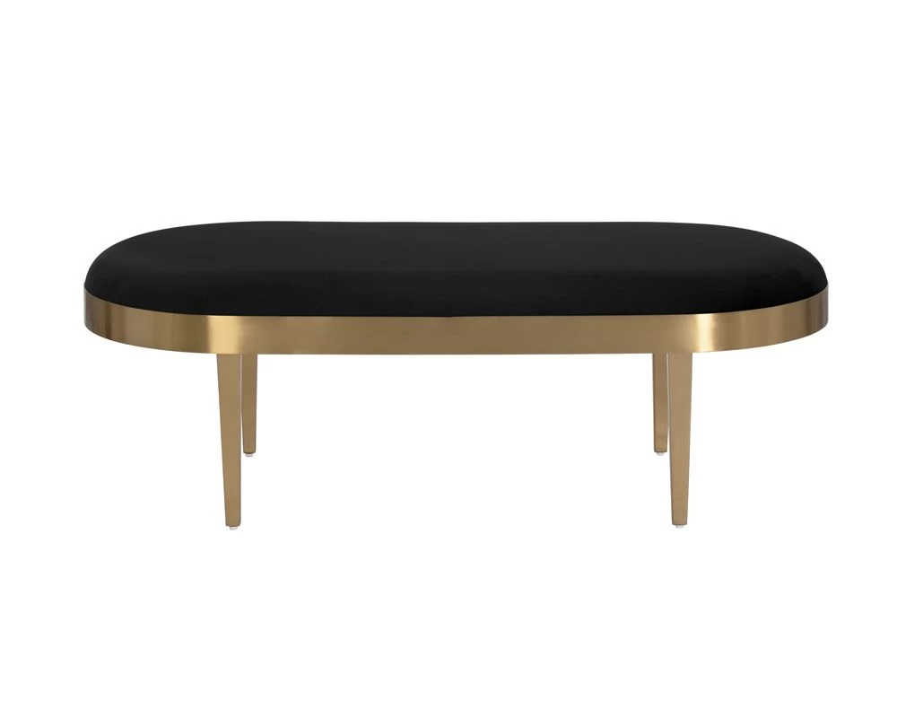 A chic and sophisticated oval shaped bench featuring a luxurious velvet-like fabric and finished with an exposed brushed gold frame. Perfect for residential and contract settings.Â