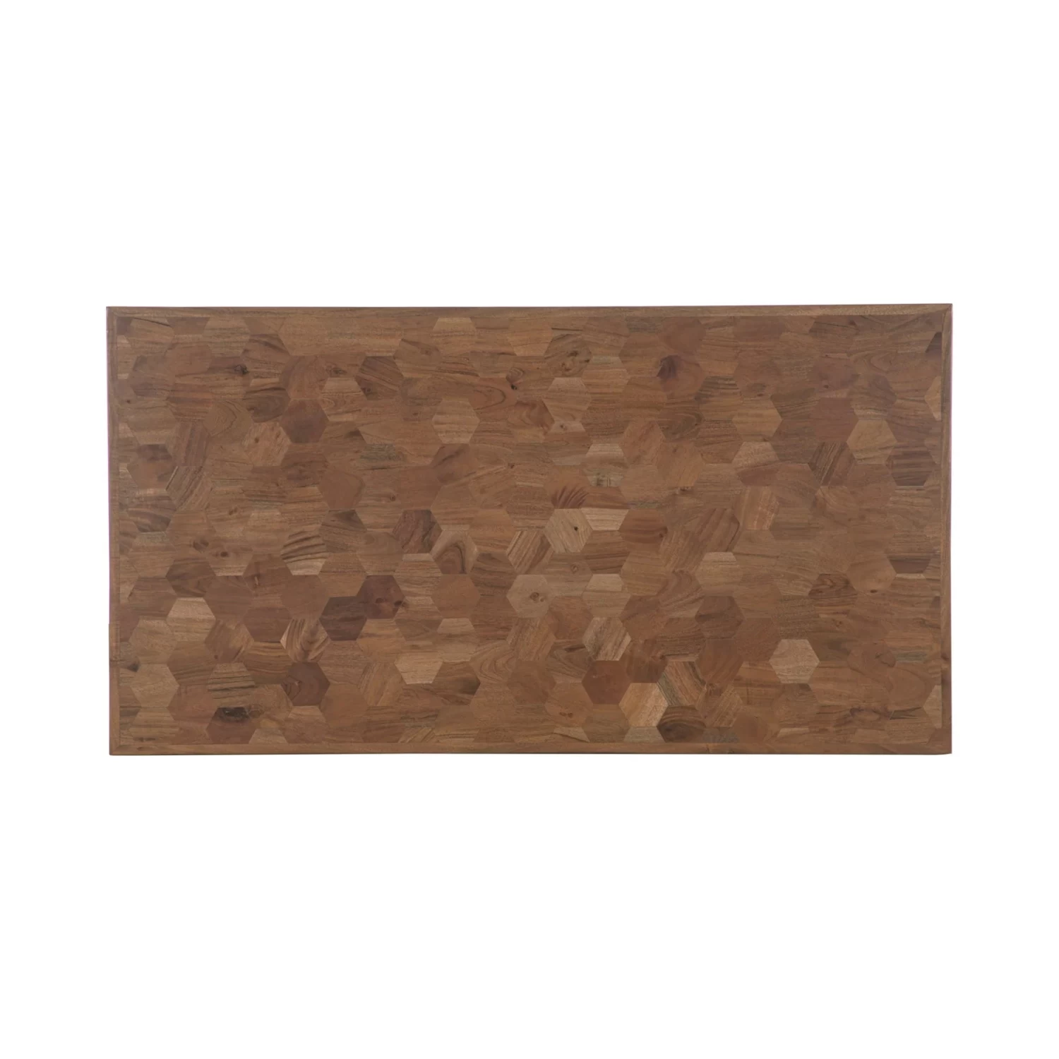 Eclectic yet minimal, this unique coffee table consists of a beautifully crafted tabletop featuring a detailed honeycomb design. With its rich acacia wooden surfaces and sleek metal legs, this piece brings warmth and boldness to any given environment.
