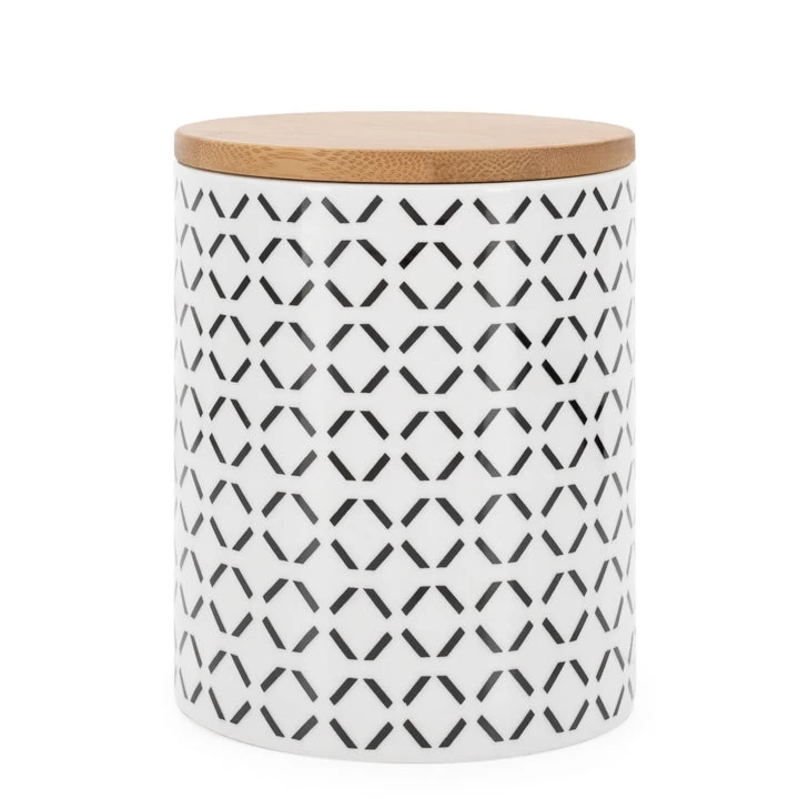 Mix and match sizes and patterns of these functional patterned porcelain canisters with bamboo lids. Perfect for kitchen counter tops, bathrooms, or as a small storage container in any setting.